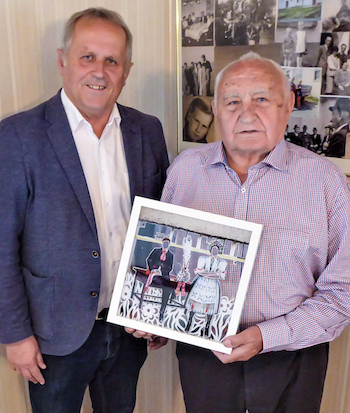 Als Dank und Anerkennung für sein jahrzehntelanges Engagement in der Gemeinde und sein Entwicklungshilfe-Projekt in Afrika überreichte Bürgermeister Andreas Grandits dem Jubilar ein „Stinatzer Hochzeit“ – Kunstwerk – gestaltet vom Stinatzer Künstler Florian Lang.