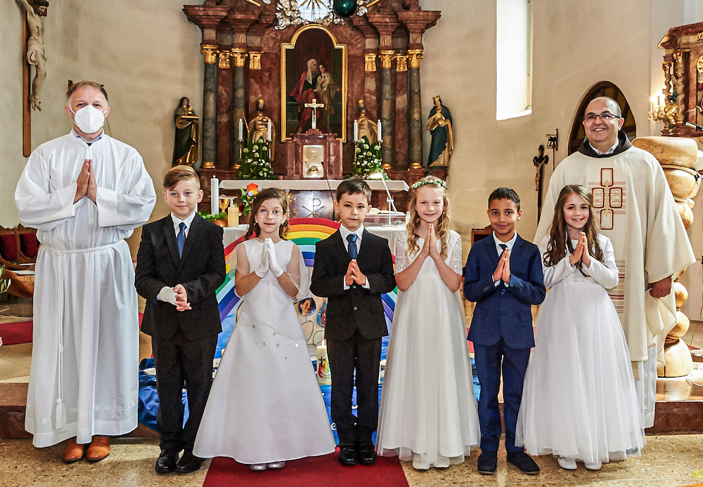 Na sliki vidimo prvopričesnike: Oskar, Lena, Dominik, Mija, Julijan i Hannah skupa s pastoralnim asistentom Juricom Petrovićem i farnikom p. Zoranom Tadićem u maloborištofskoj crikvi.