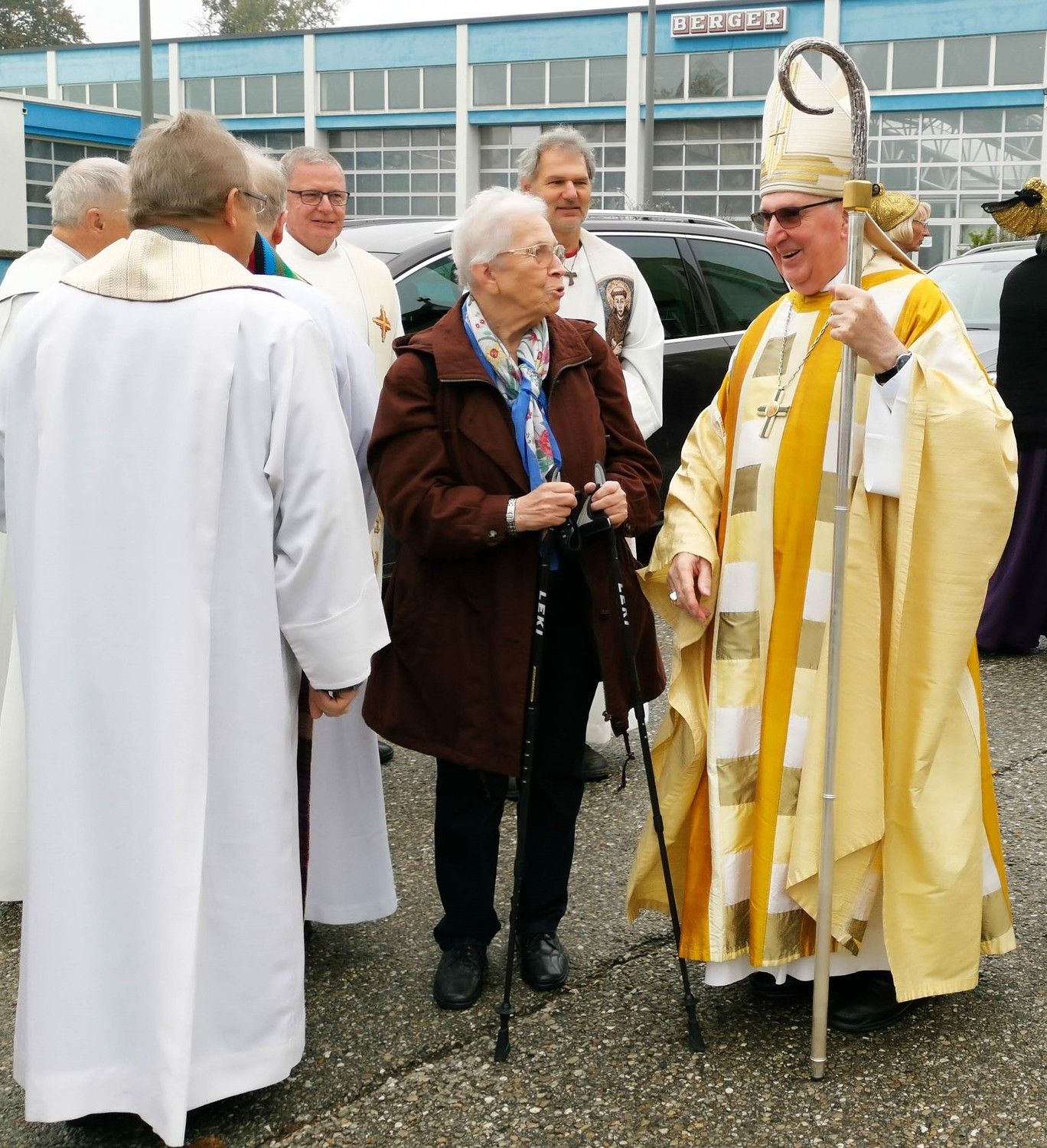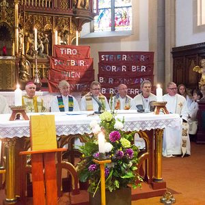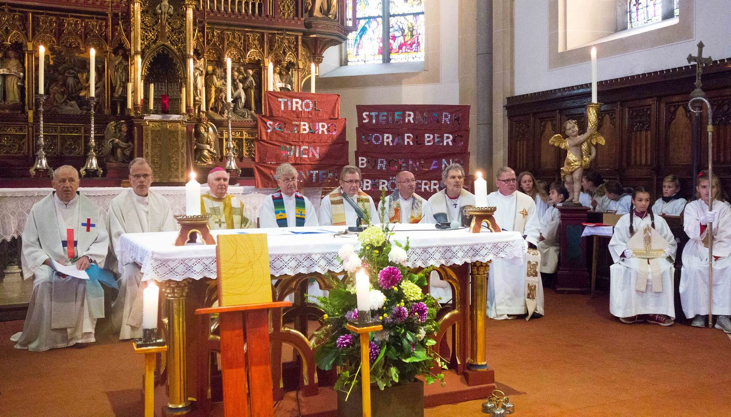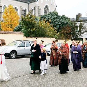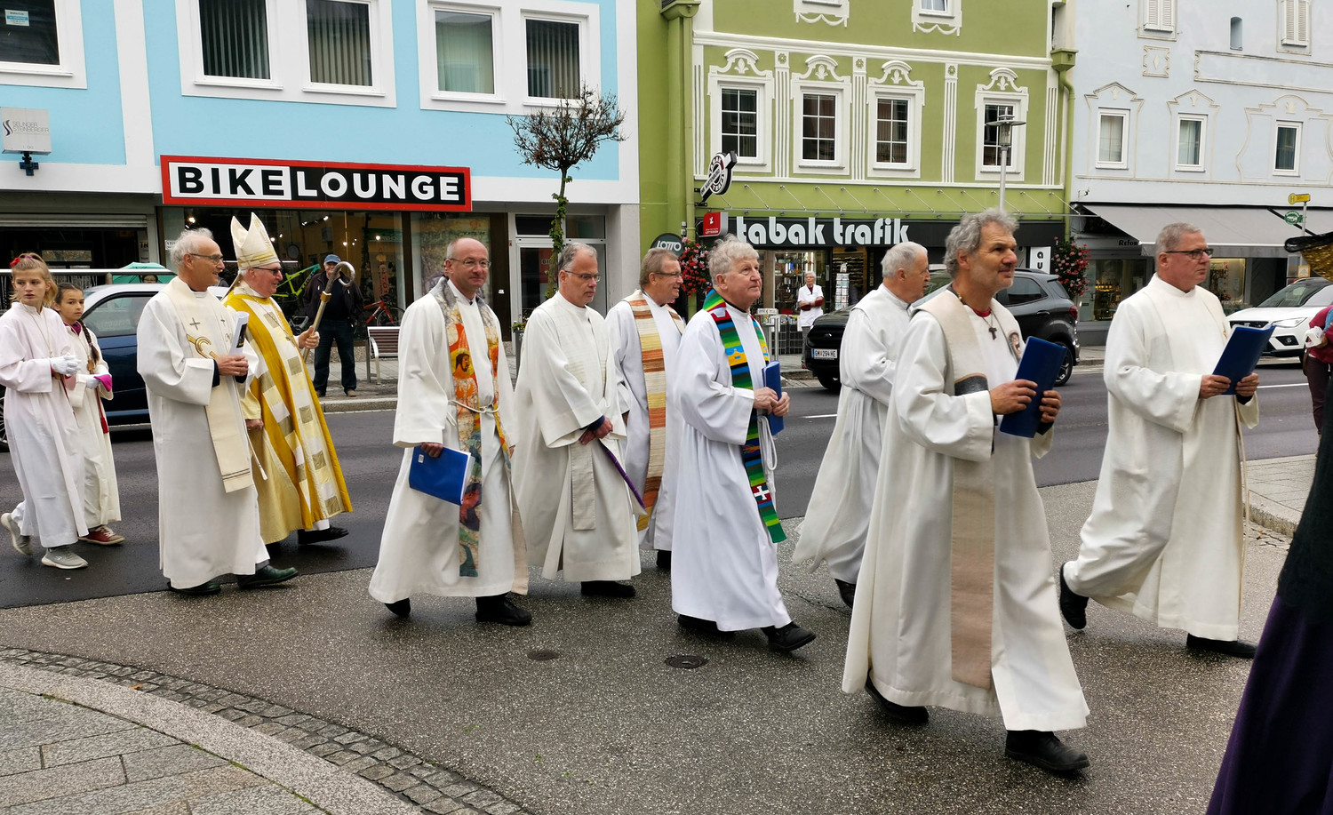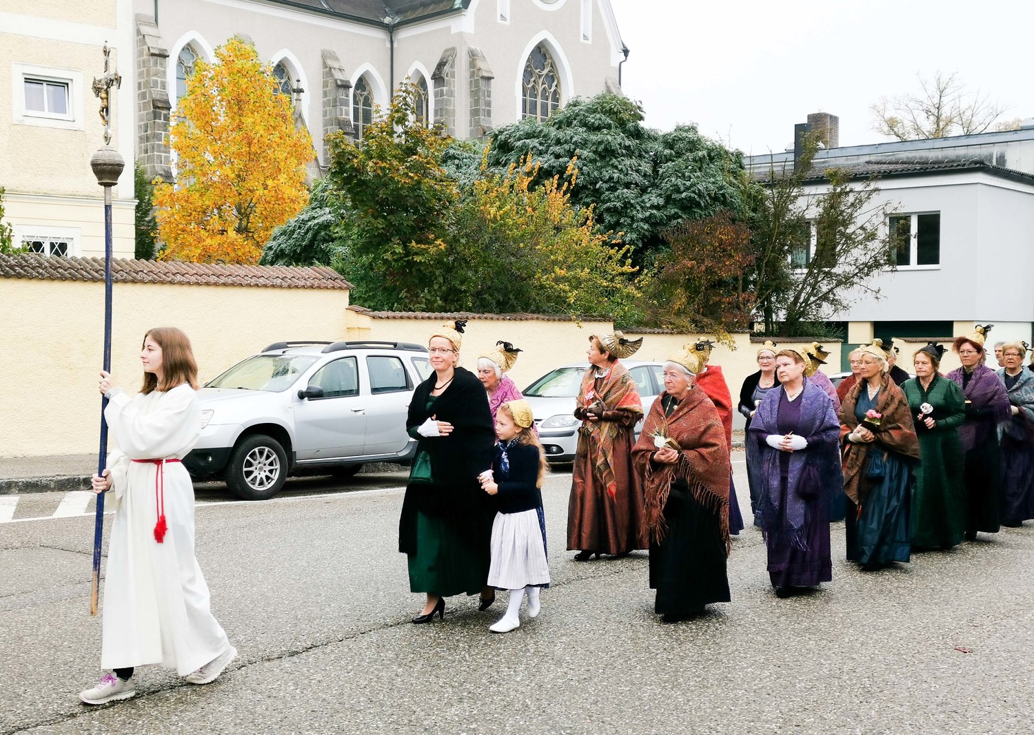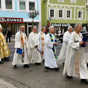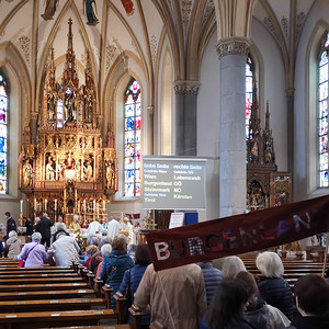 Begrüßt wurden alle von der Musikkapelle Schwanenstadt und von Frauen in Goldhauben. Die Freude über das Wiedersehen mit vielen Freunden war sehr groß. Diese Freude haben wir mitgenommen zur Feier in die Kirche. Wir sind in einer Prozession vom Stadtsaal in die Kirche gegangen. Jedes Bundesland mit seiner Namensfahne (danke der Schule in Linz, die die Fahnen so toll und schön genäht haben!)