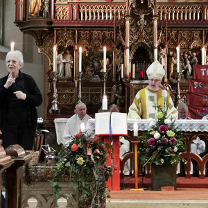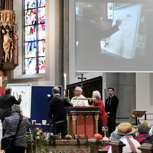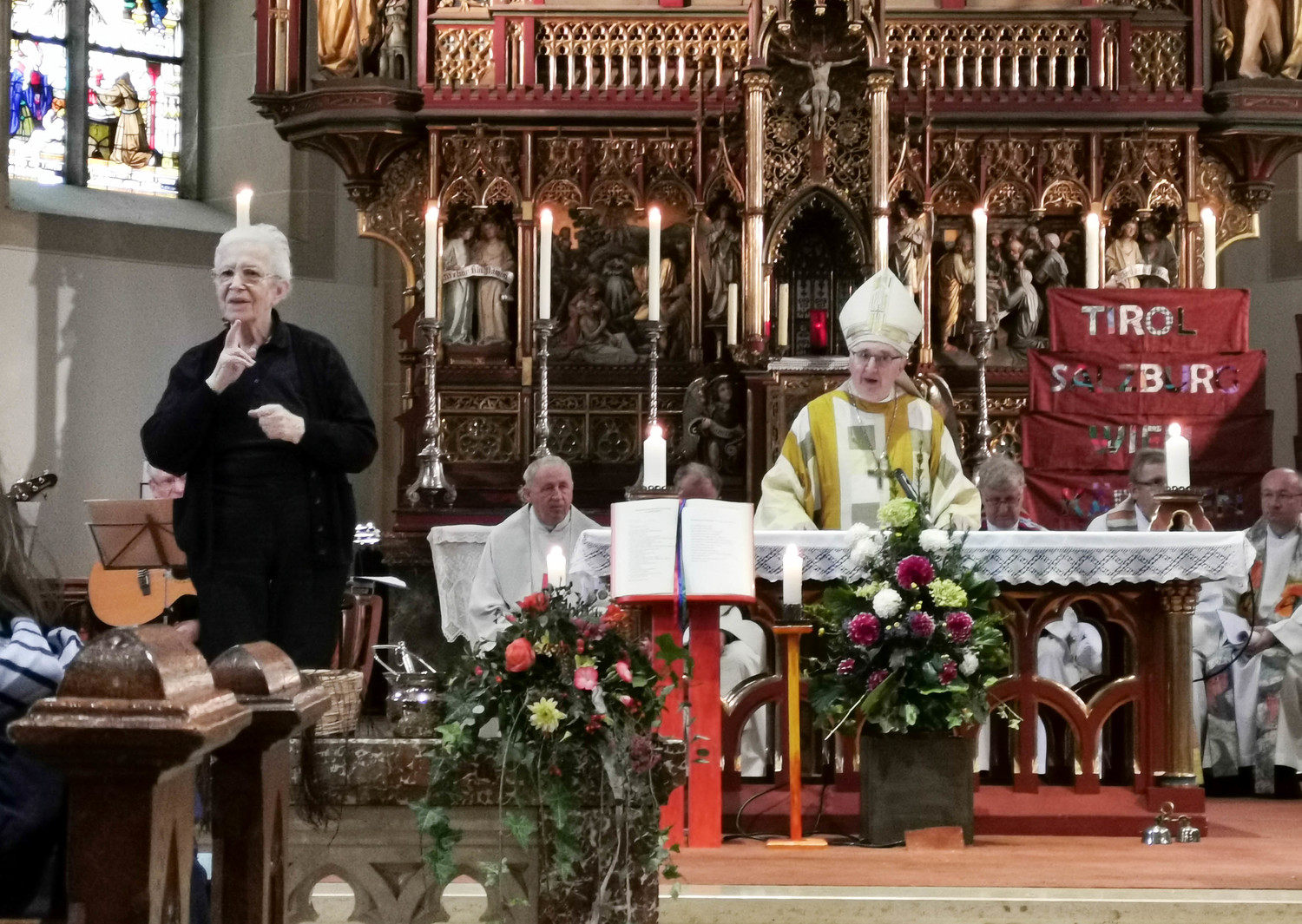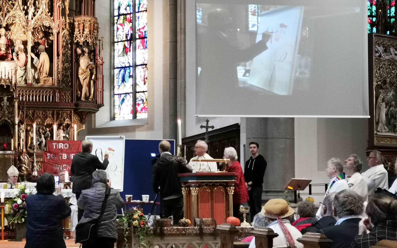 Dr. Fellinger hat das Evangelium wunderbar gebärdet und dazu gezeichnet: Jesus heilt einen aussatzkranken Mann. Der Aussätzige hatte den Mut, zu Jesus zu kommen und Jesus war bereit, ihm zu helfen. Das hat Bischof Iby dann auch in der Predigt erklärt: Wir dürfen IMMER zu Jesus kommen, mit unseren Bitten, unserem Dank. Wann kommen wir zu Jesus?