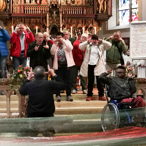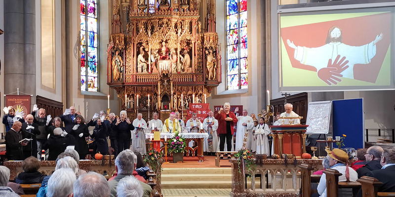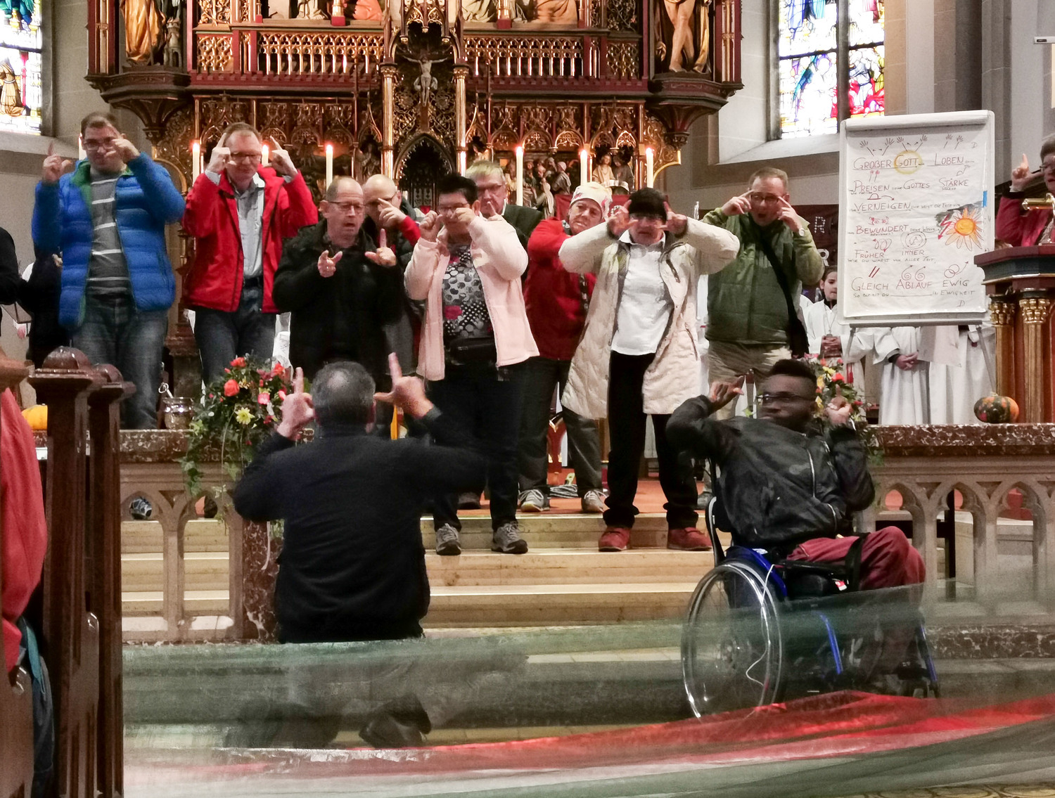 Ministranten haben Tücher, bunt wie der Regenbogen über die Köpfe der Gehörlosen durch die Kirche getragen. Ein Beispiel: Wir sind gut beschützt und leben in guter Gemeinschaft.