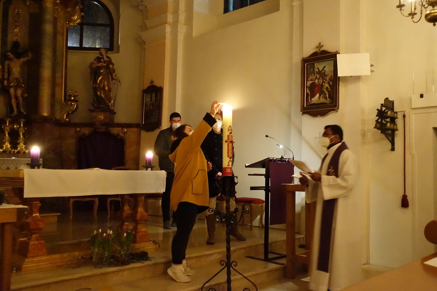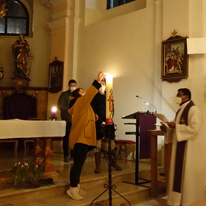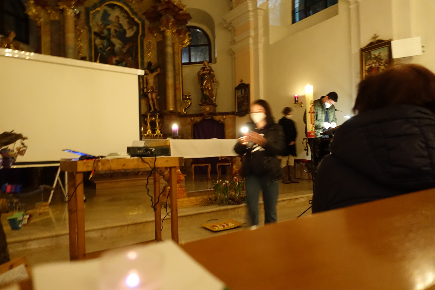 Pöttsching / Firmvorbereitung: Dieses Hungertuch ist eigentlich ein Leintuch. Ein Leintuch aus einem Krankenhaus. Dieses Tuch hat die chilenische Künstlerin Lilian Moreno Sánchez gemacht. Sie hat einen Fuß, besser gesagt das Röntgenbild eines Fußes dargestellt.