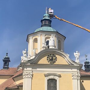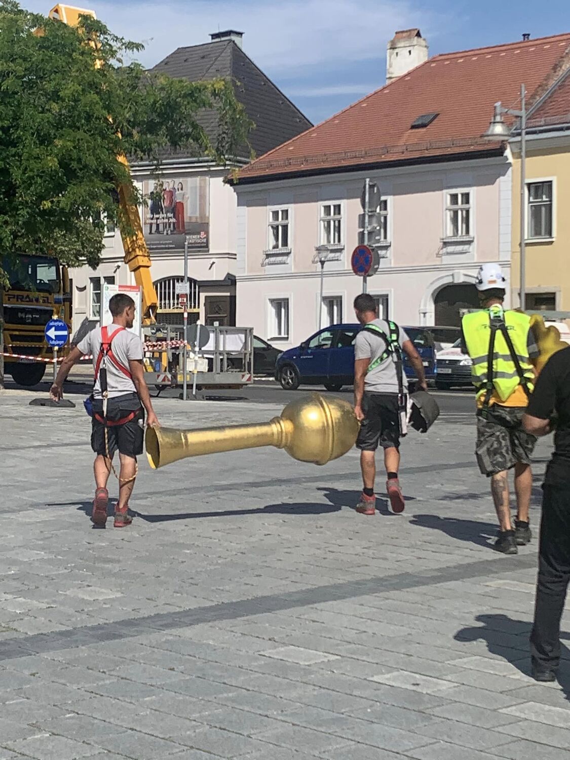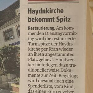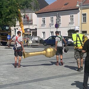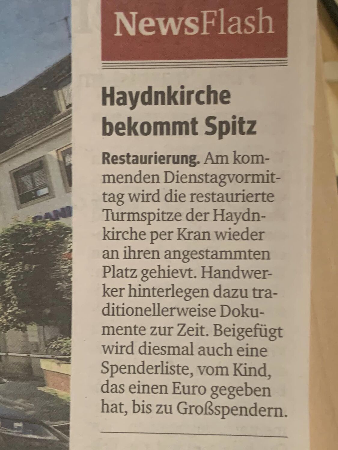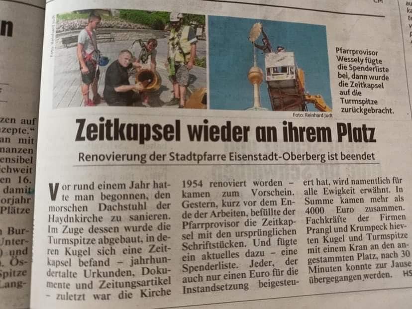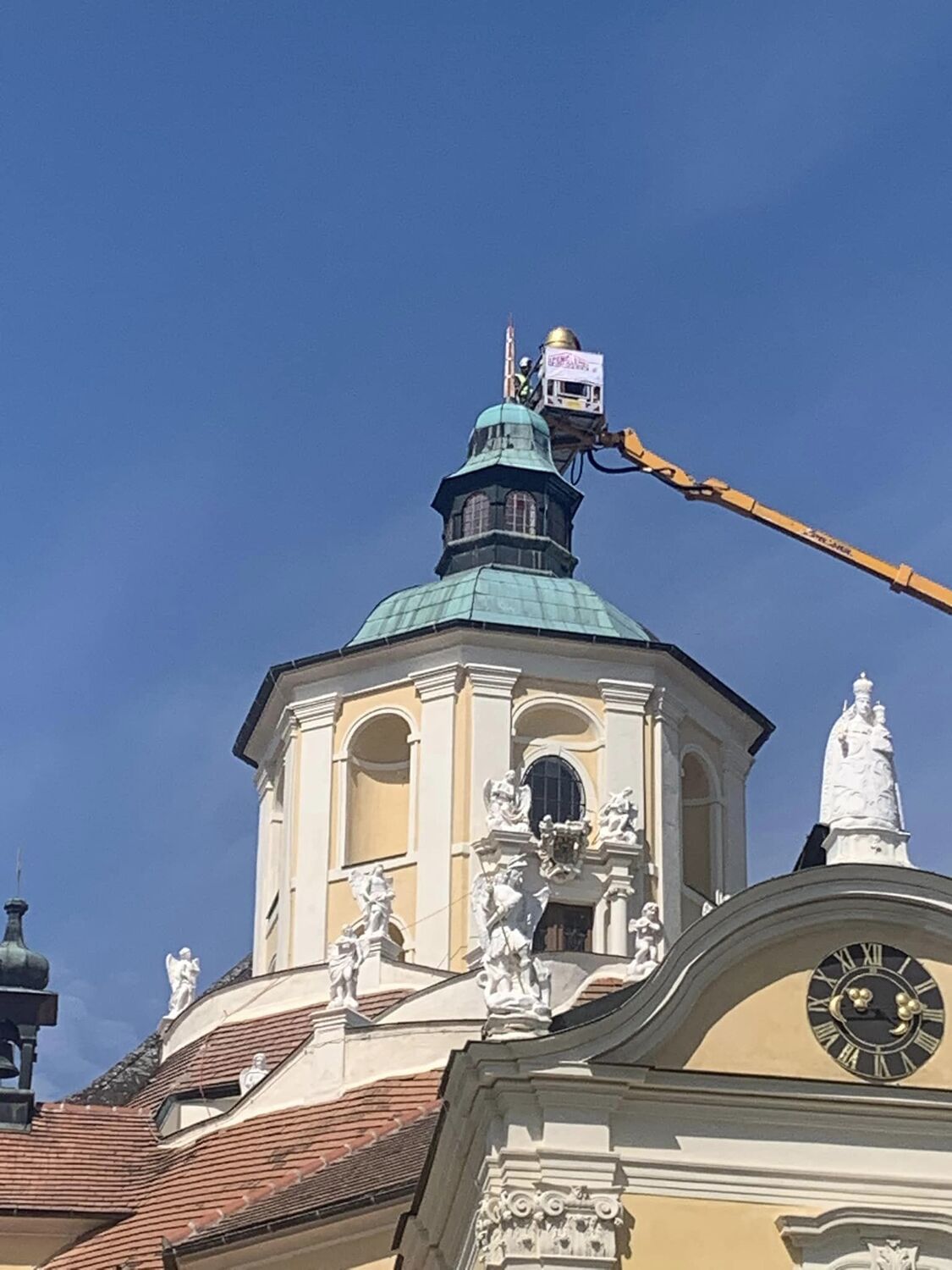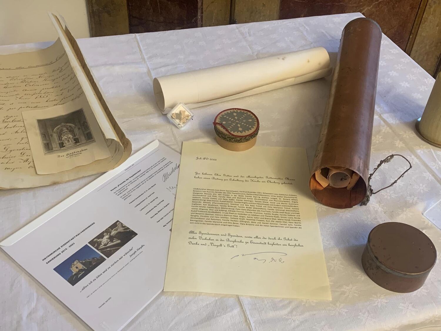 Zeitig in der Früh wurden der Kartusche, welche in der Kugel der Kuppelspitze aufbewahrt wird, die „aktuellen Beilagen“ beigegeben. So finden sich nun neben den Dokumenten aus früheren Zeiten nun auch Dokumente der „Freunde der Bergkirche“, der Wr. Philharmoniker, des Chores und der Spenderinnen und Spender der „Zeitkapsel“ wieder.