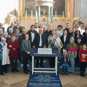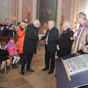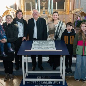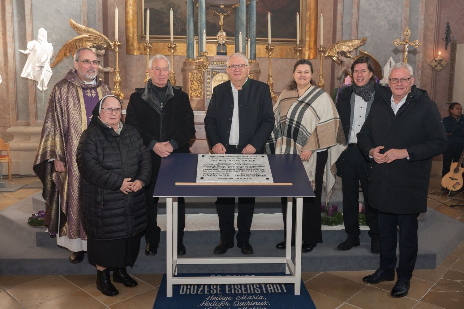 Am Foto: v.l. P. Lorenz Voith, Sr. Johanna Vogl, Kurator Hans Sakrits, Prof. Josef Bauer, Tochter Helga und Sohn Gerhard von Hr. Bauer, Bürgermeister Thomas Steiner