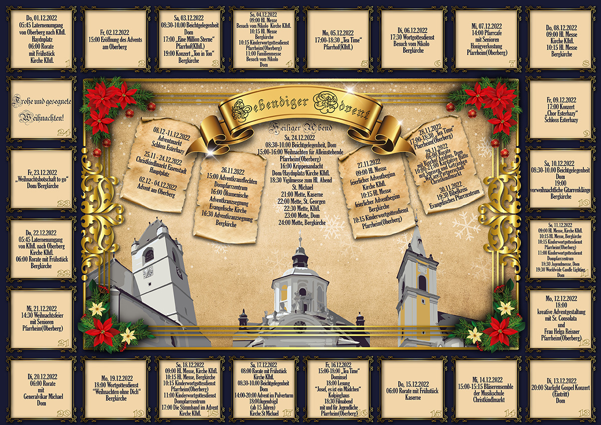 „Es tut sich was im Advent in Eisenstadt“, freut sich Pfarrer Alexander Wessely. Erstmalig wird es in Eisenstadt - auf Initiative der Pfarre Eisenstadt-Oberberg - den „Lebendigen Advent“ geben: Ein ganz besonderer Adventkalender, der vom 1. bis zum 24. Dezember jeden Tag eine Einladung ausschickt. „Wir möchten die Menschen zusammenbringen und ihnen besondere Momente im Advent schenken. Mit dem ‚Lebendigen Advent‘ bietet sich dazu täglich eine neue Möglichkeit. Vom Messbesuch über Konzerte und eine gemütliche Teerunde bis hin zur ‚Weihnachtsbotschaft to go‘ ist alles dabei“, freut sich der Pfarrer des Pfarrverbandes Oberberg-Kleinhöflein Alexander Wessely.