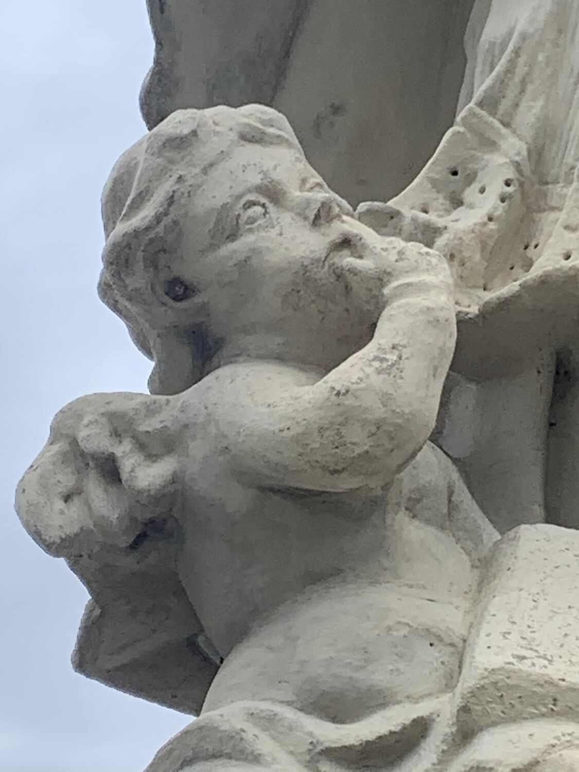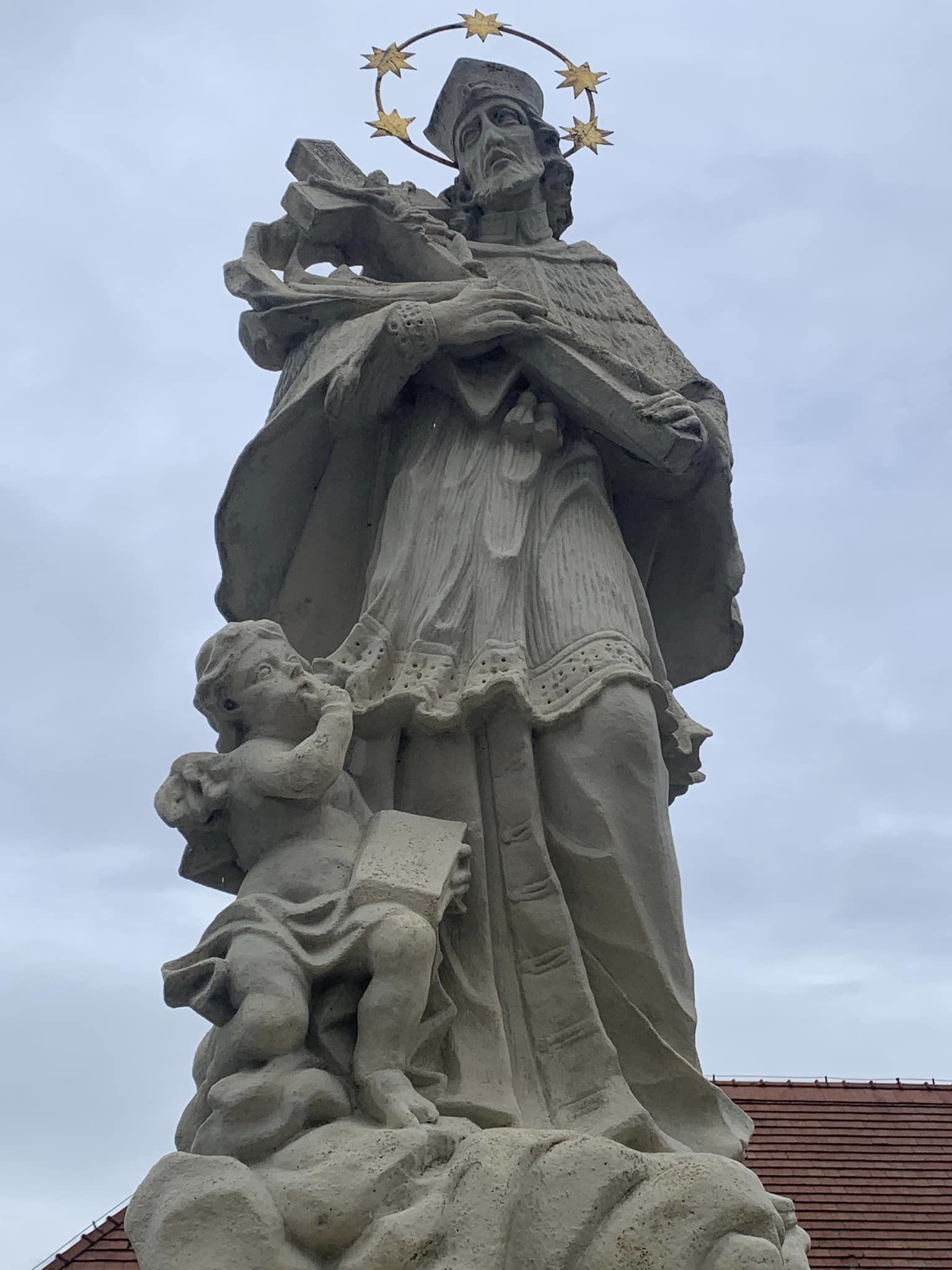Heute starten wir mit dem heiligen Nepomuk, welcher auf einem Sandsteinsockel vor der Kirche steht. Normalerweise ist das Attribut des heiligen Nepomuk das Kreuz und oftmals der auf die Lippen gelegte Zeigefinger, welche an das Beichtgeheimnis, welches der heilige Nepomuk trotz Folter nicht gebrochen hat, erinnern soll. Unser Nepomuk hält zwar ein Kreuz in der Hand, auf das Beichtgeheimnis verweist aber der Engel, der vor dem Heiligen sitzt.