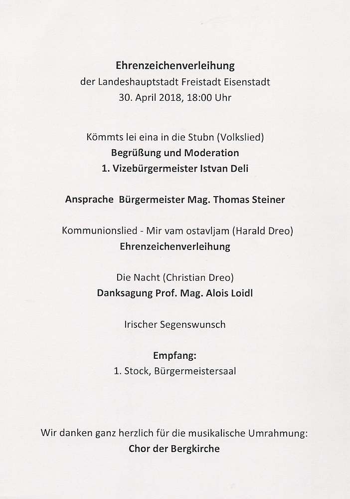 Am 30. April 2018 wurden im Eisenstädter Rathaus nach einem Beschluss des Gemeinderates Ehrenzeichen der Landeshauptstadt Freistadt Eisenstadt an langjährige Sängerinnen und Sänger des Chores der Haydnkirche verliehen.