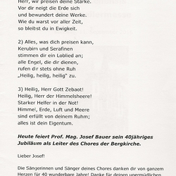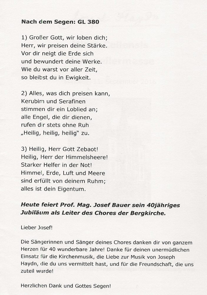 Am 11. September 2016 feierte der CHOR der BERGKIRCHE sein 40 jähriges Bestehen. Die Festmesse wurde mit der MARIAZELLERMESSE von J. Haydn musikalisch umrahmt.