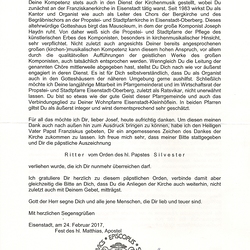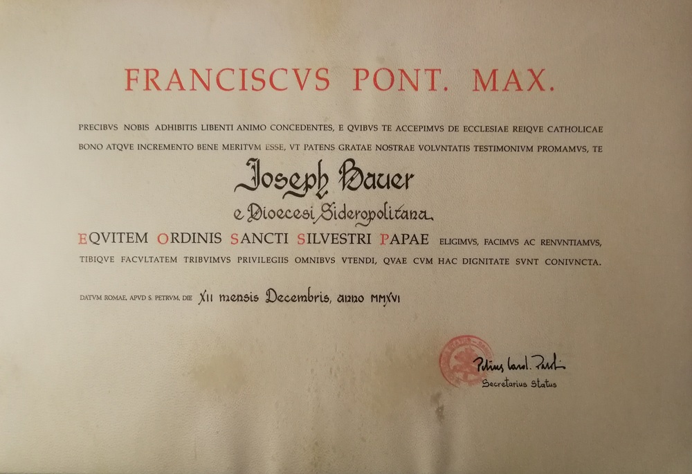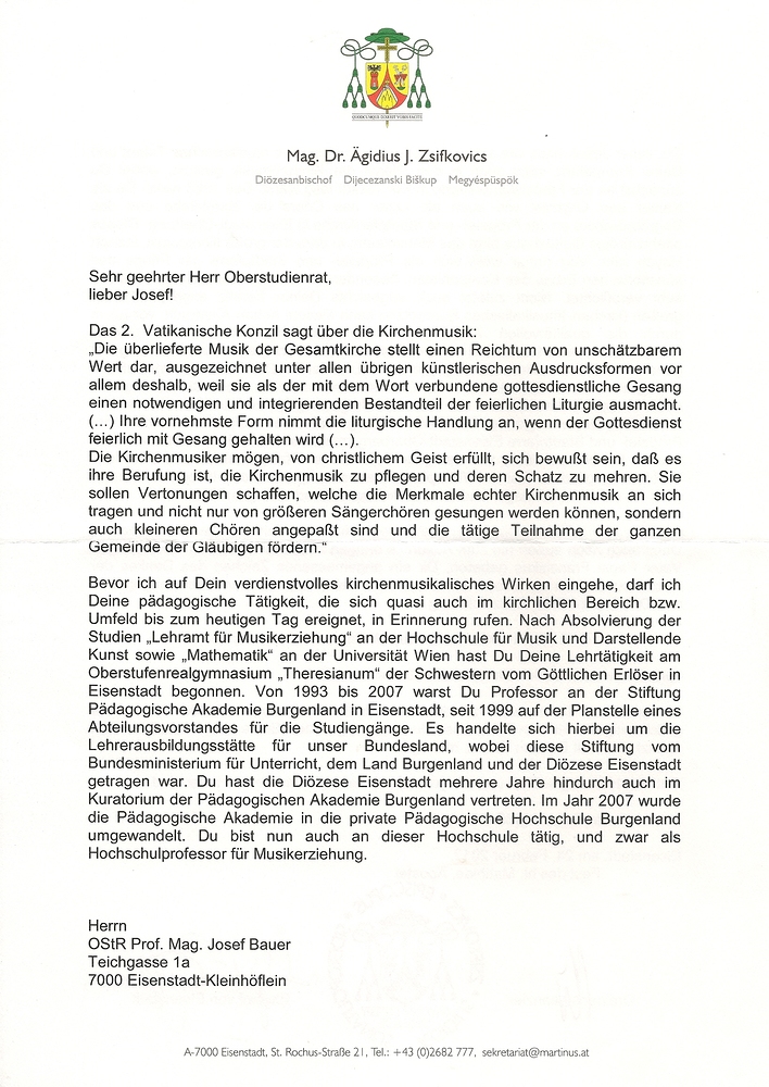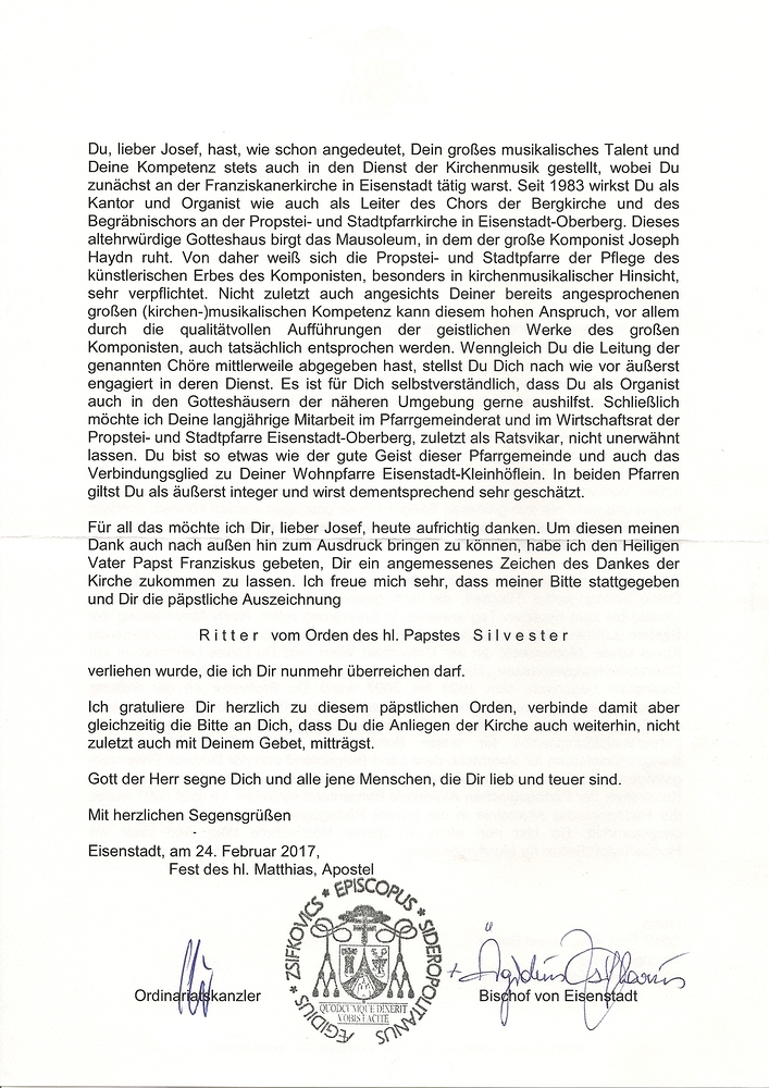 Am 24. Februar 2017 überreichte Bischof Dr. Ägidius Zsifkovics die päpstliche Auszeichnung R i t t e r vom Orden des hl. Papstes S i l v e s t e r an Mag. Josef Bauer für sein verdienstvolles kirchenmusikalisches Wirken und seine Tätigkeiten im kirchlichen Bereich.
