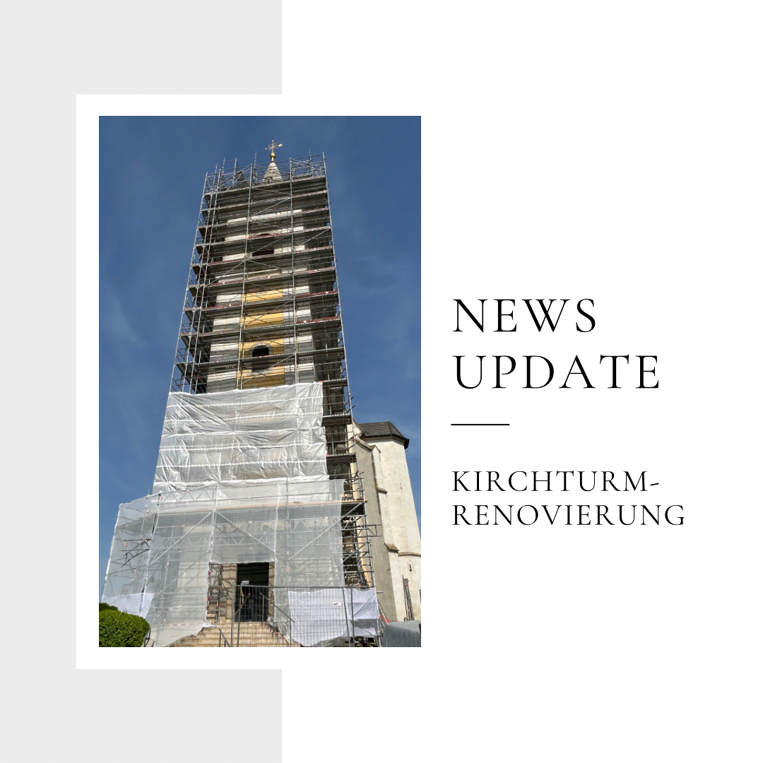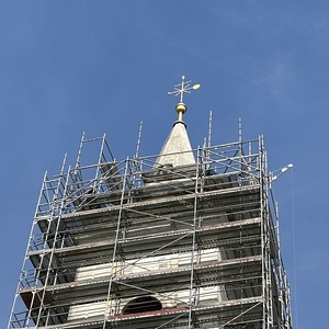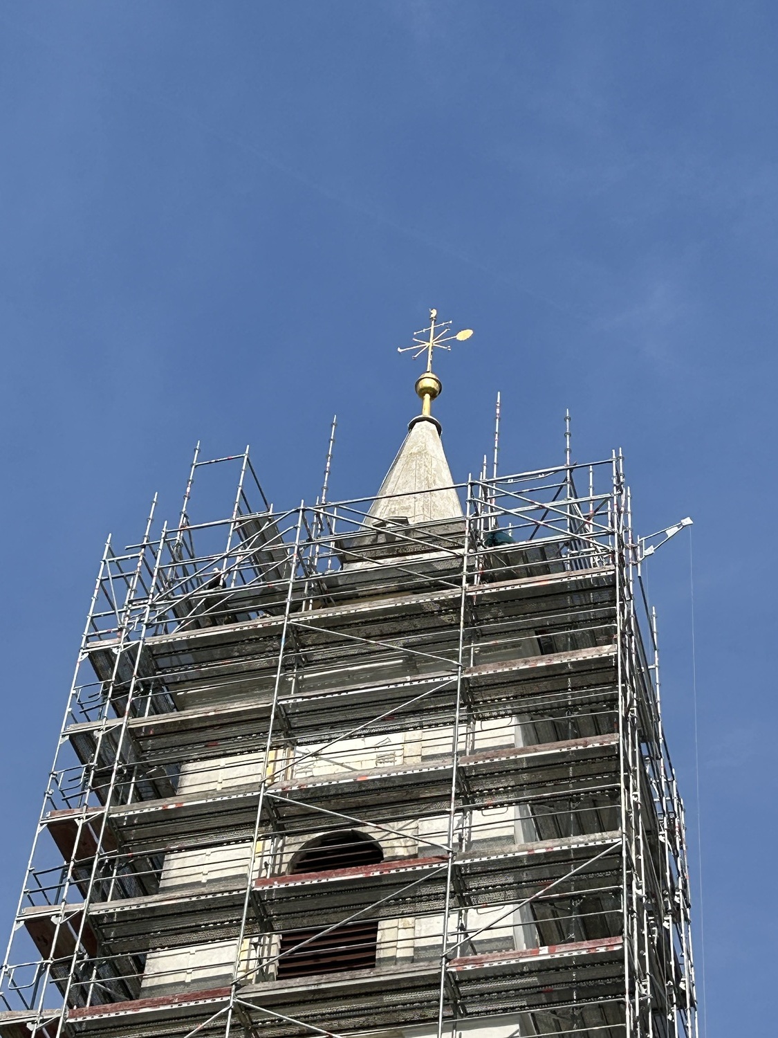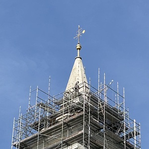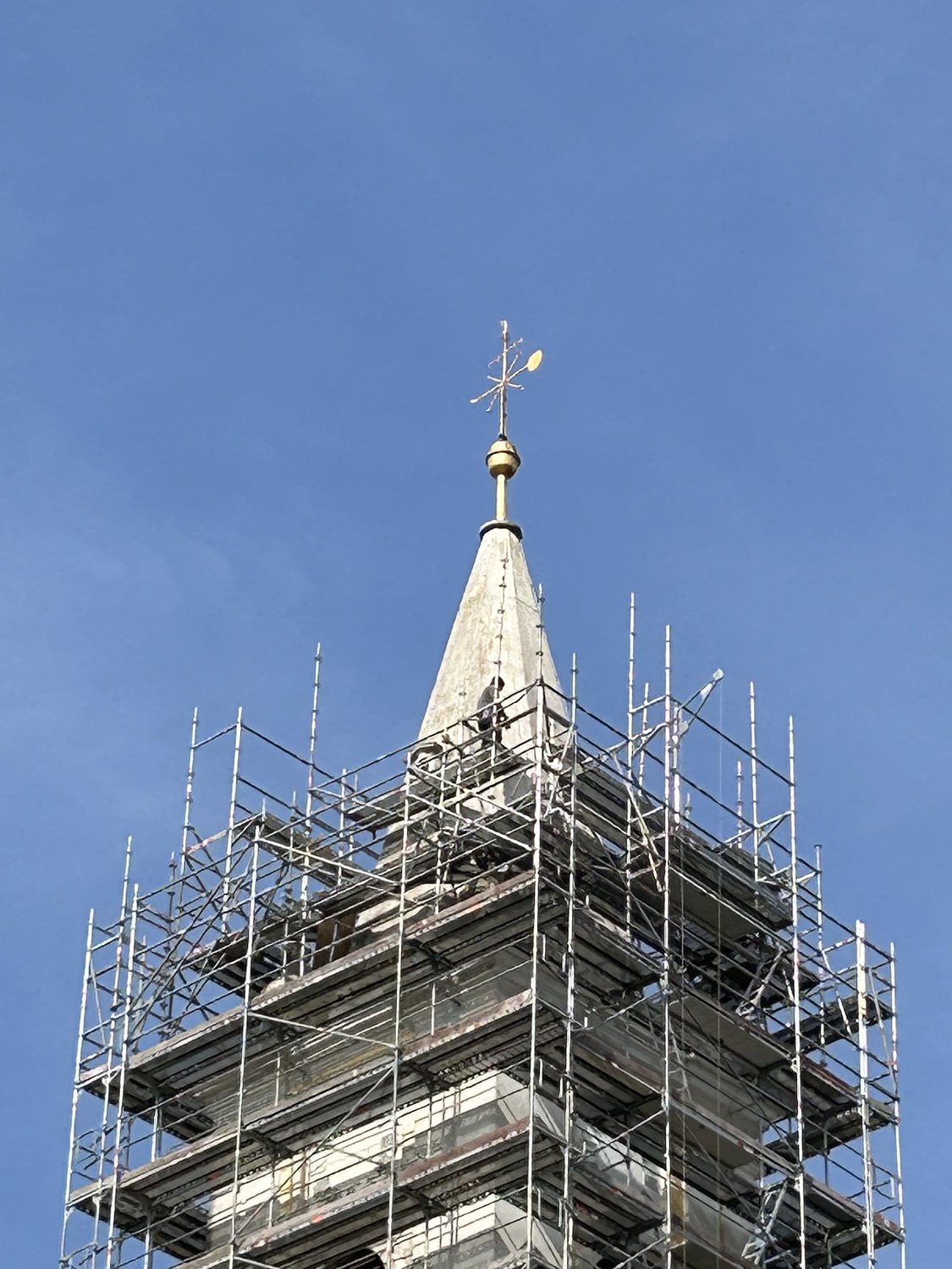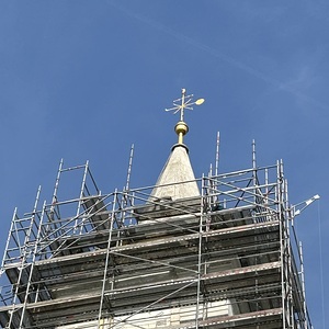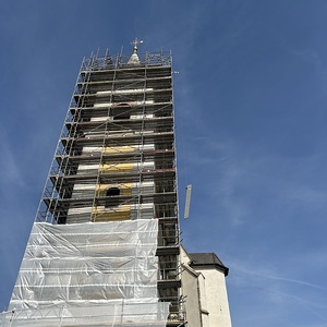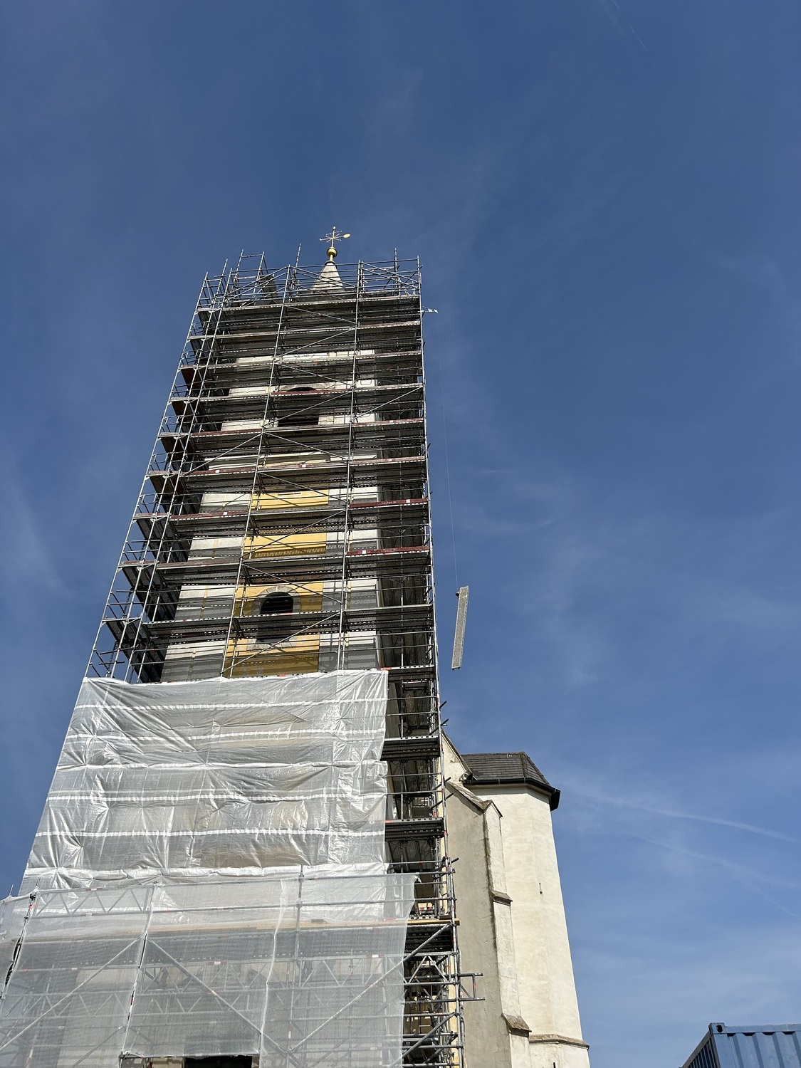 Nach einer sturmbedingten Pause - „Das Gerüste hat dem Sturm Gott sei Dank standgehalten“- konnte heute mit der Eingerüstung der Turmspitze begonnen werden. Im unteren Bereich wurden bereits Staubnetze angebracht. Wenn alles nach Plan weitergeht, kann bereits am Montag mit dem Sandstrahlen begonnen werden.