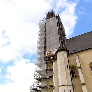 Der Kirchturm von Kleinhöflein, einem Ortsteil von Eisenstadt, wird umfassend saniert und renoviert. Zwei Wochen lang wurde nur das Gerüst aufgebaut, nun konnte mit den Arbeiten begonnen werden.