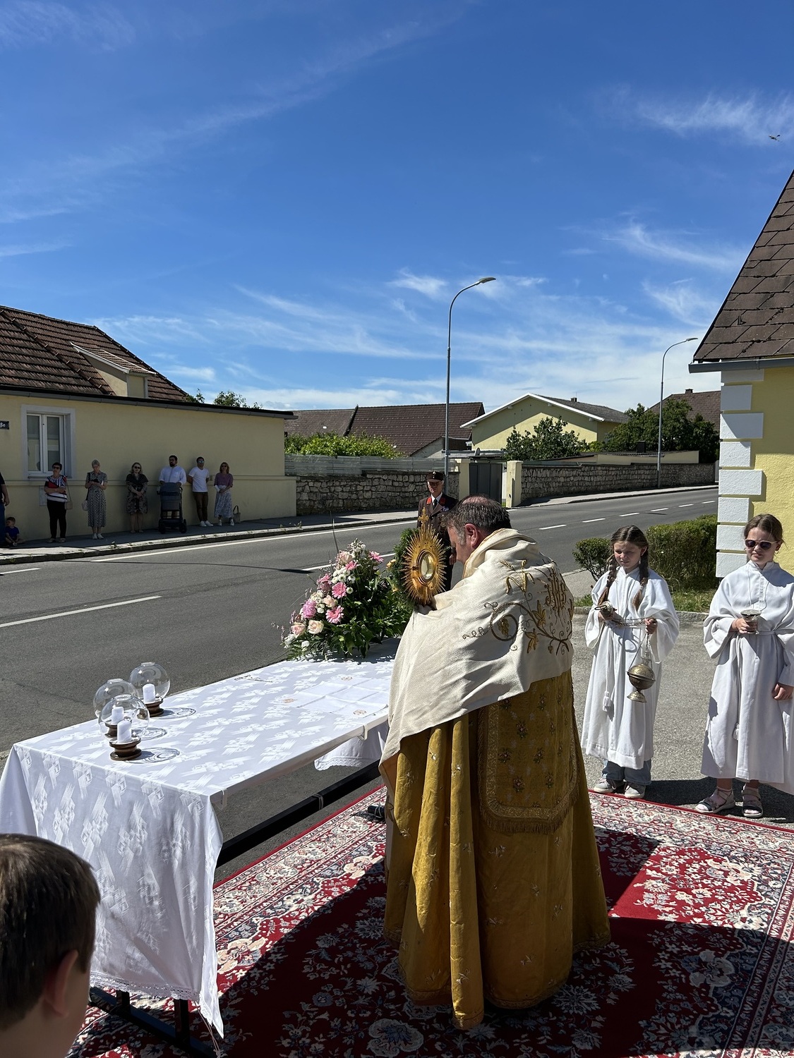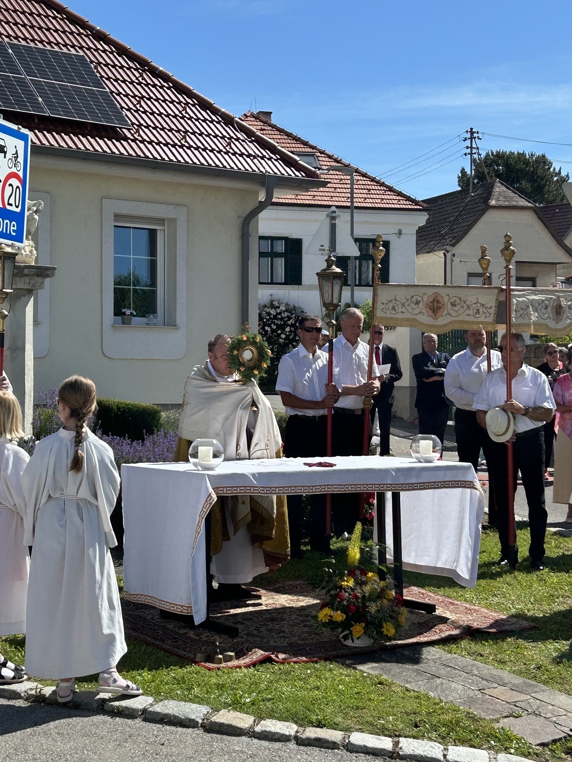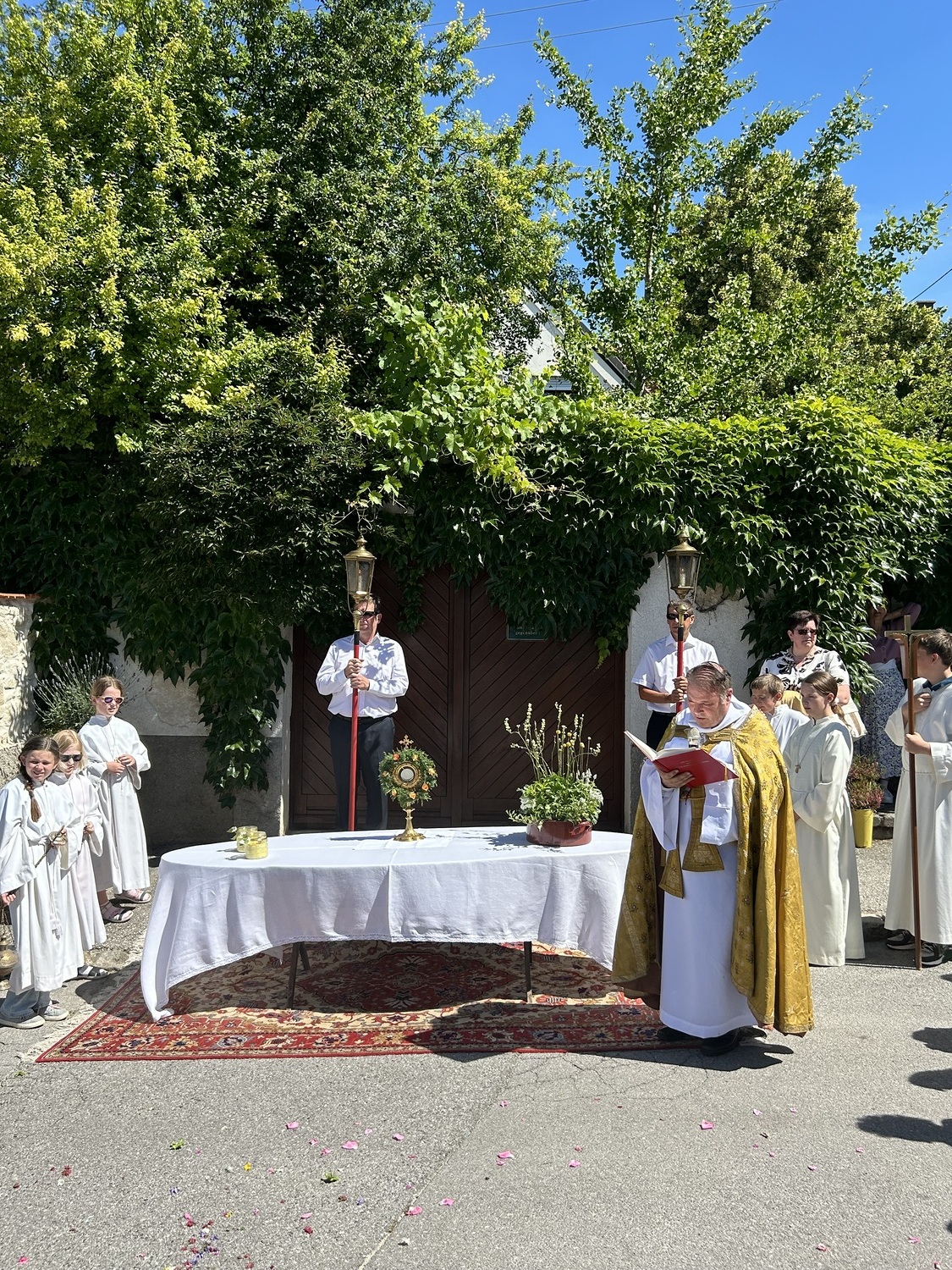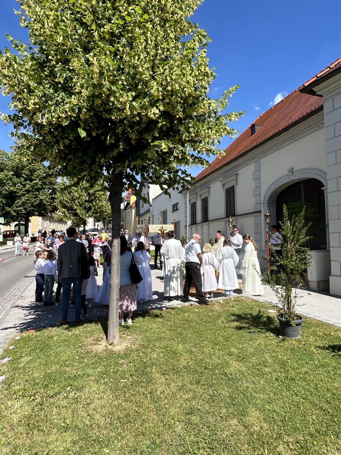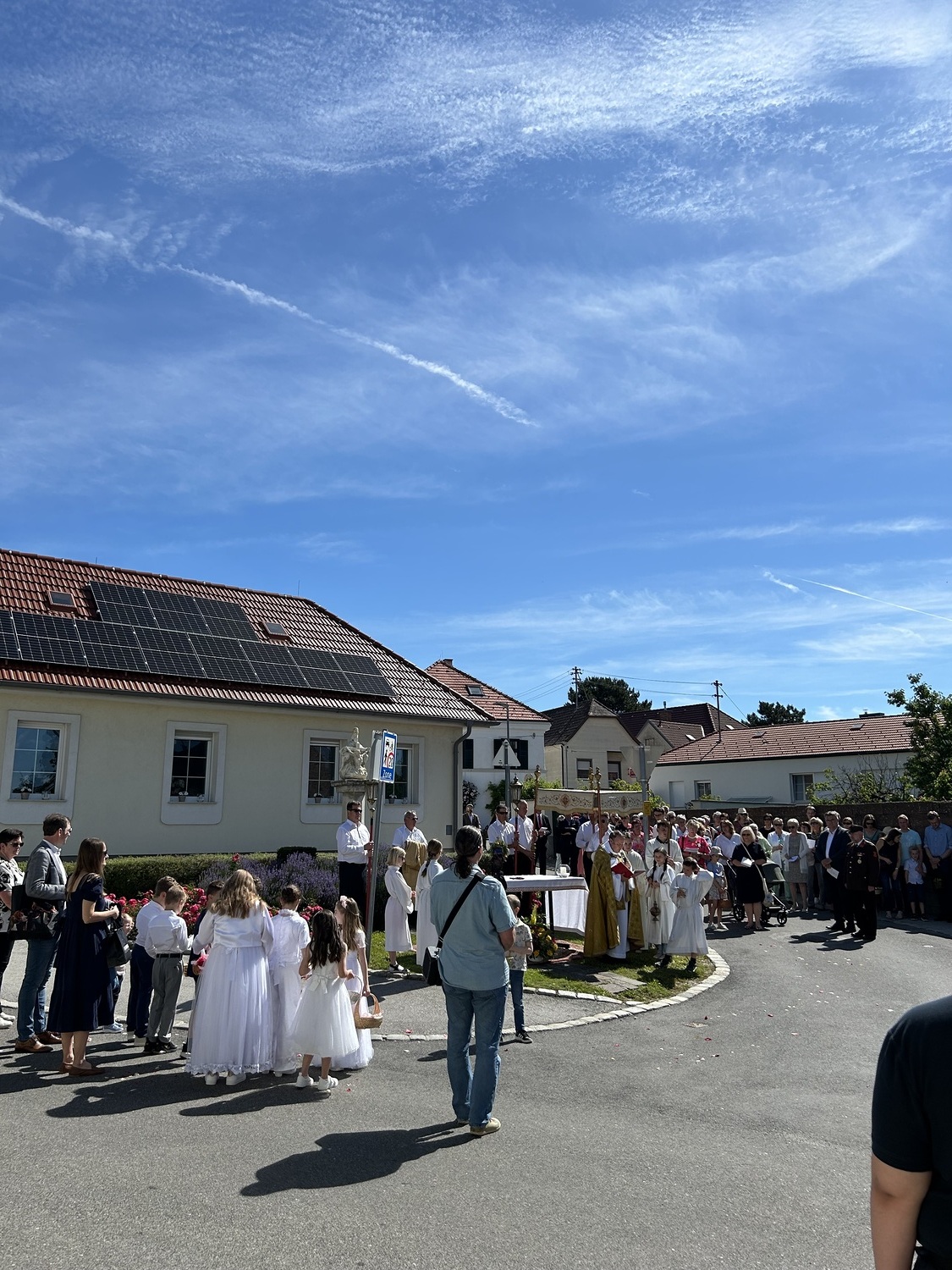 Heute waren wieder die Häuser, Straßen und Plätze im Dorf in der Stadt geschmückt. Nach der Hl. Messe in der Pfarrkirche wurde die Prozession zu den 4 Altären im Dorf von der Winzerkapelle Kleinhöflein, der Freiwilligen Feuerwehr, den Sänger:innen , den Erstkommunionskindern von Kleinhöflein, sowie zahlreichen Kindern und Gläubigen begleitet. Alles zur Ehre Gottes, den wir in Form der Hostie durch unser Dorf trugen.