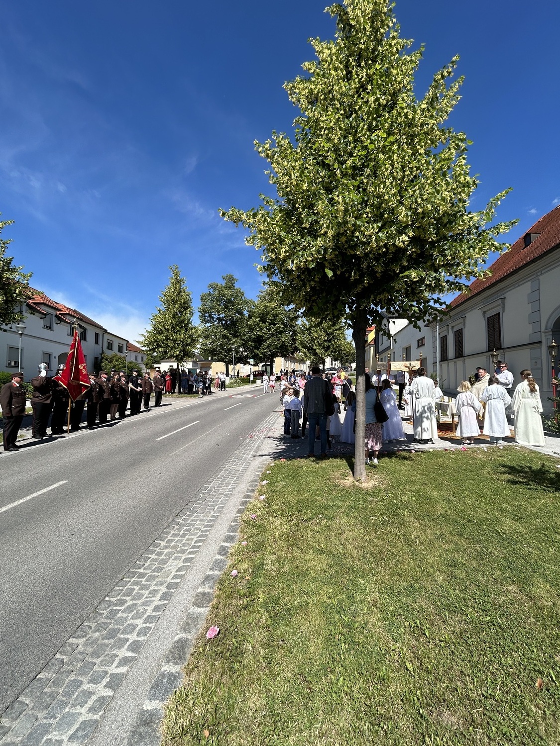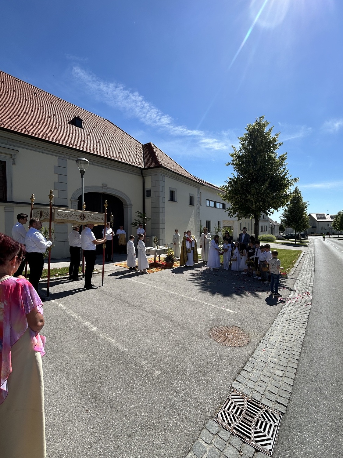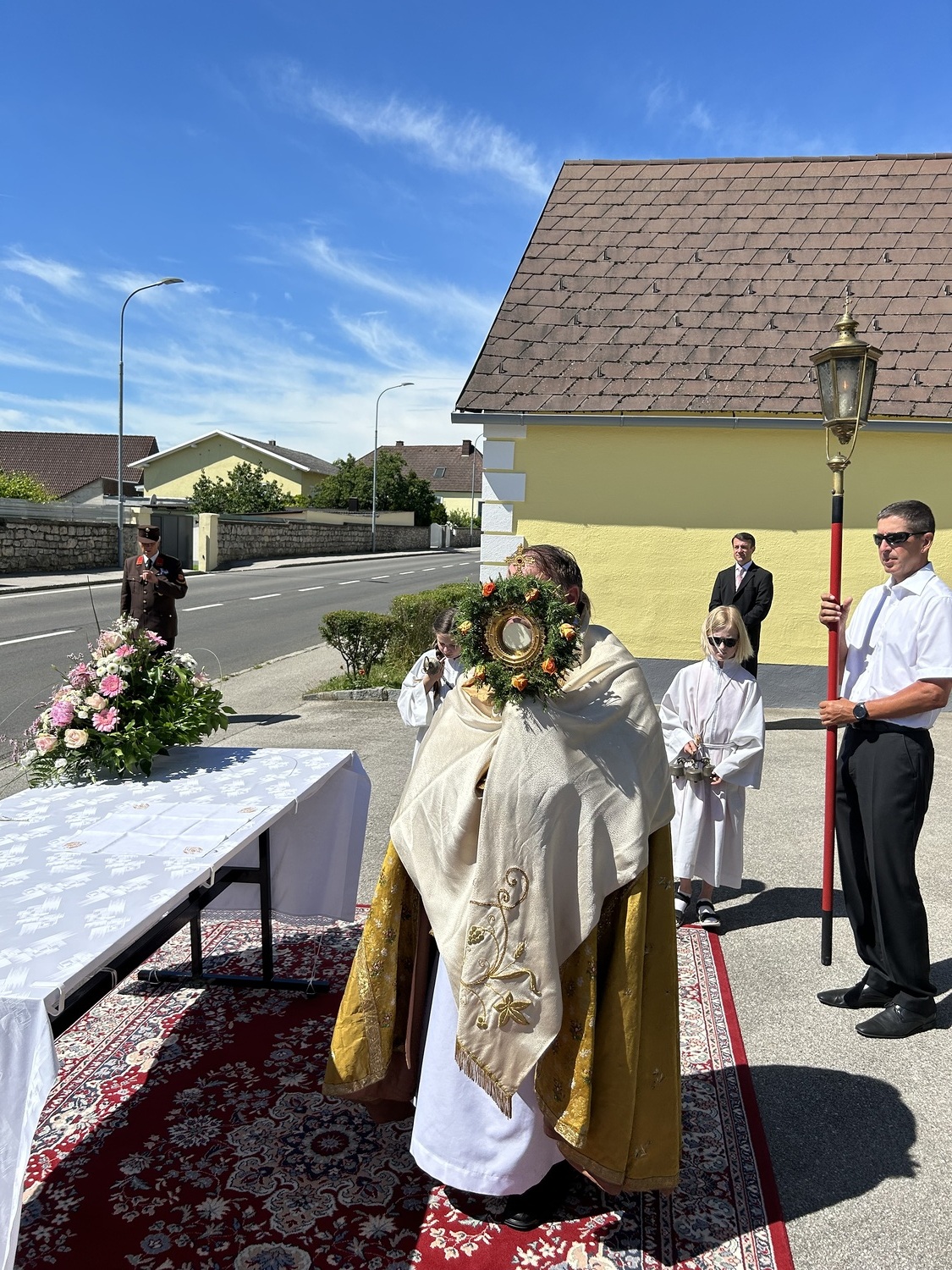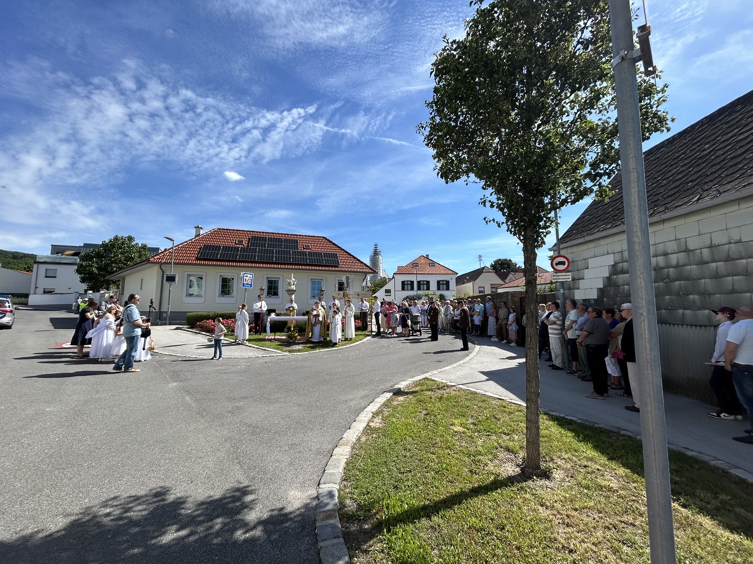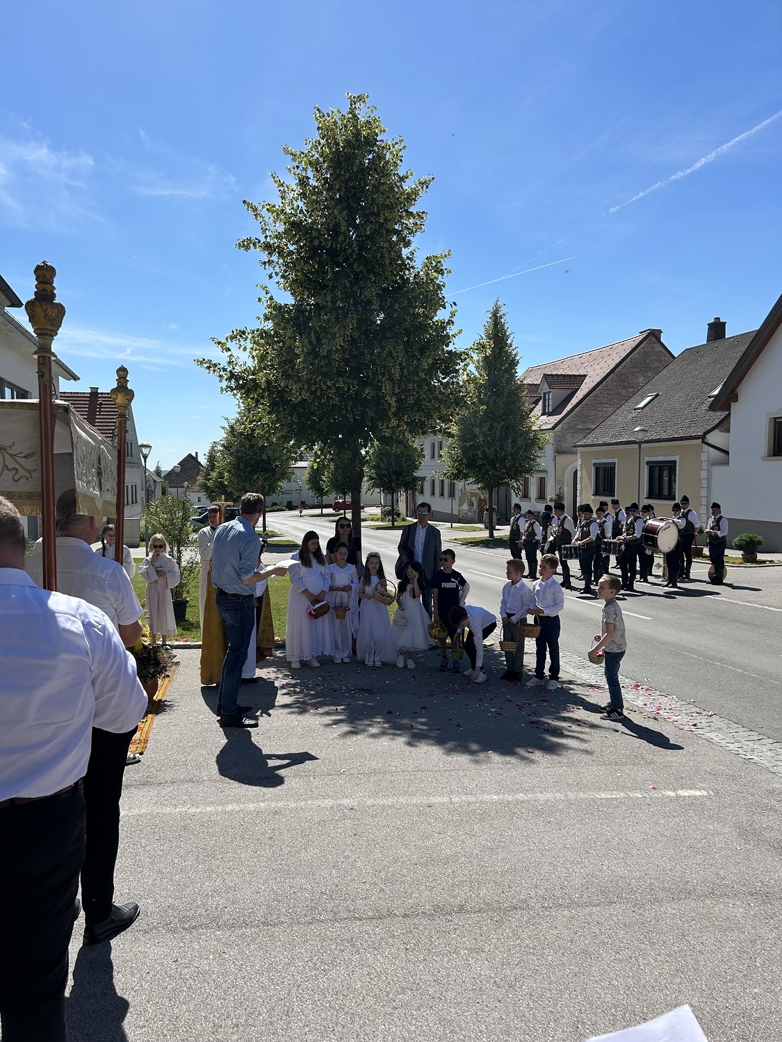 Heute waren wieder die Häuser, Straßen und Plätze im Dorf in der Stadt geschmückt. Nach der Hl. Messe in der Pfarrkirche wurde die Prozession zu den 4 Altären im Dorf von der Winzerkapelle Kleinhöflein, der Freiwilligen Feuerwehr, den Sänger:innen , den Erstkommunionskindern von Kleinhöflein, sowie zahlreichen Kindern und Gläubigen begleitet. Alles zur Ehre Gottes, den wir in Form der Hostie durch unser Dorf trugen.