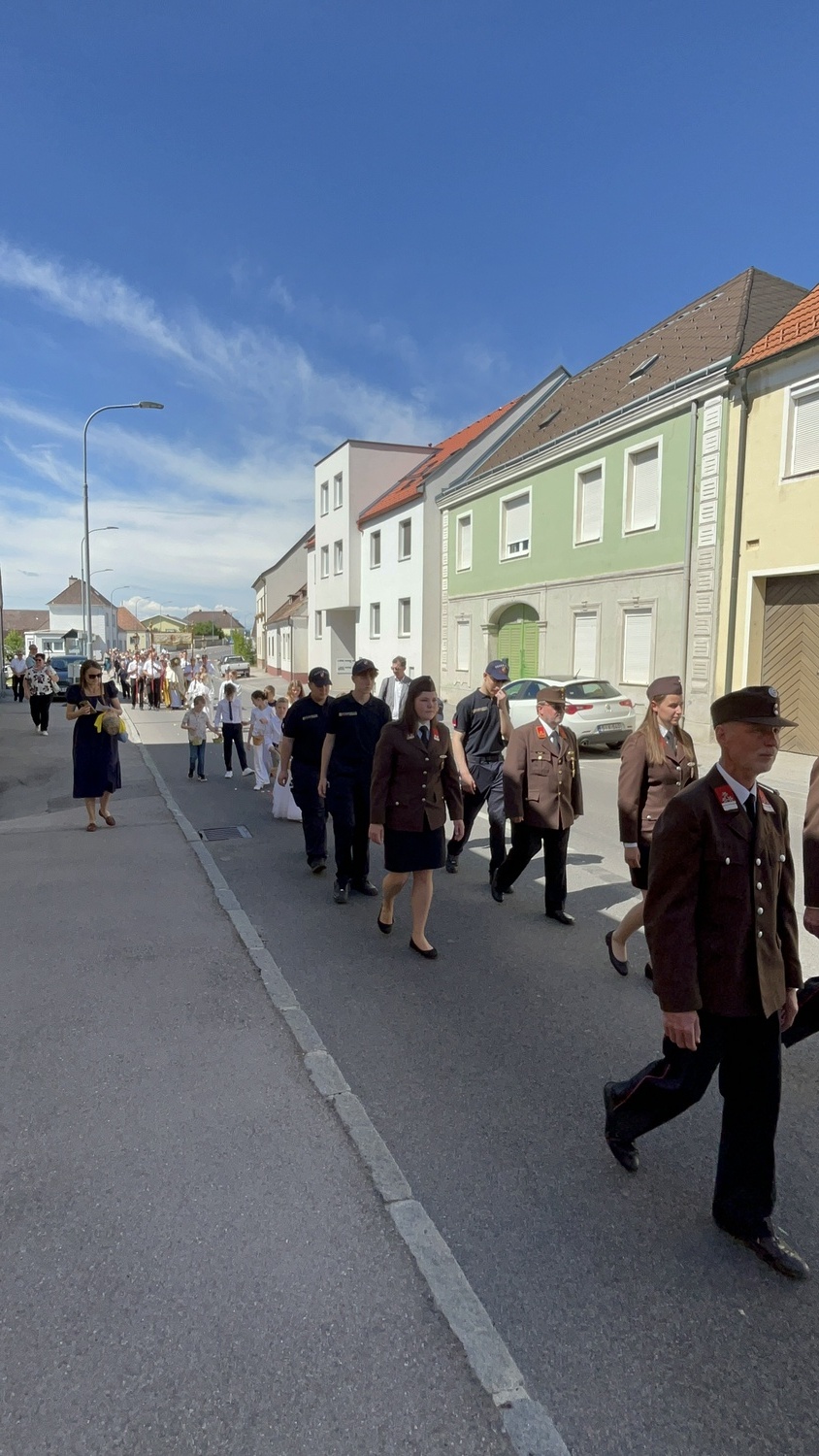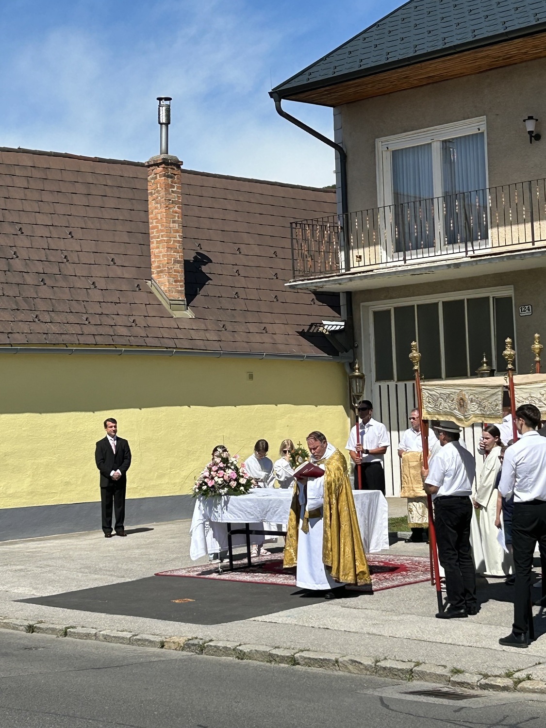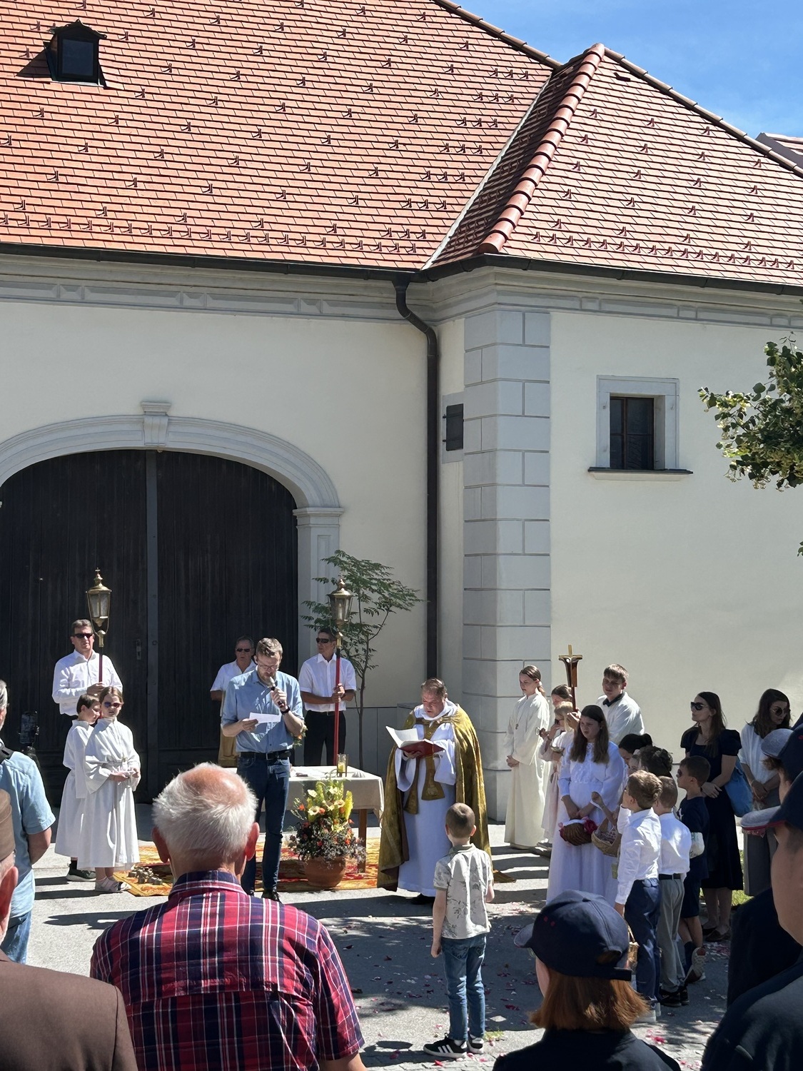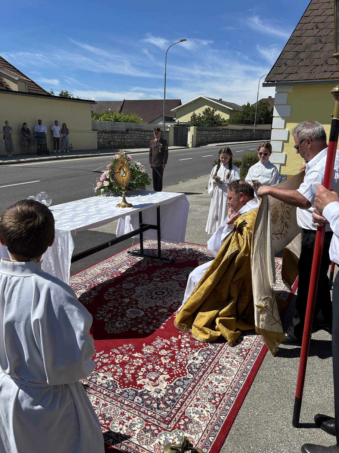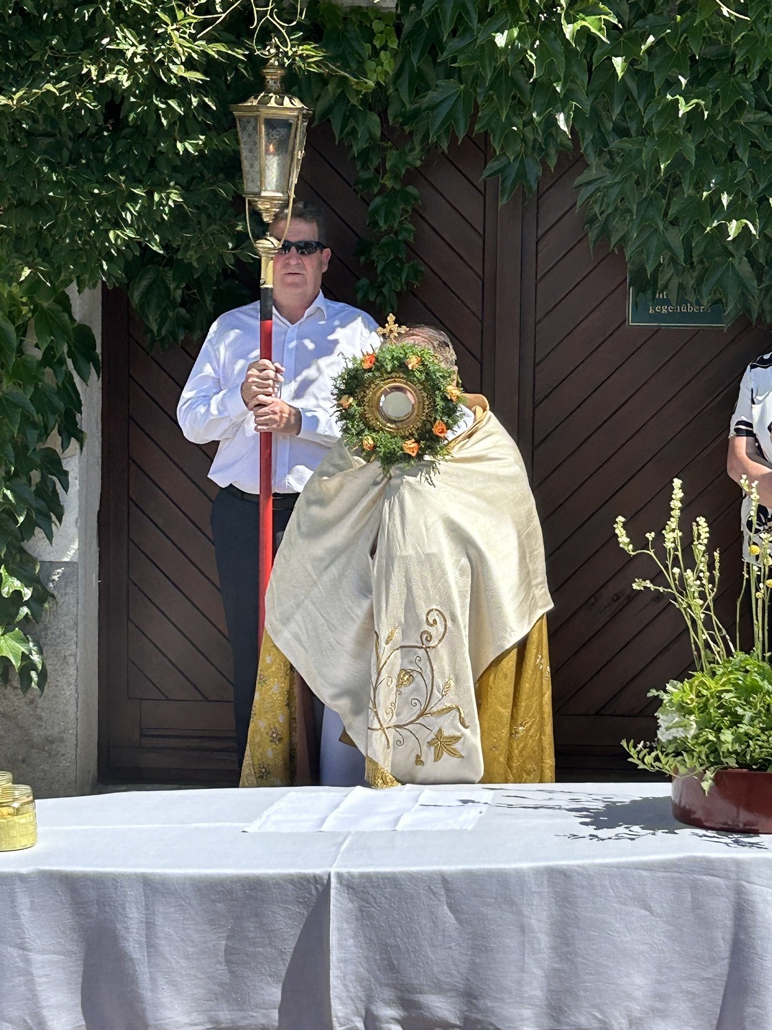 Heute waren wieder die Häuser, Straßen und Plätze im Dorf in der Stadt geschmückt. Nach der Hl. Messe in der Pfarrkirche wurde die Prozession zu den 4 Altären im Dorf von der Winzerkapelle Kleinhöflein, der Freiwilligen Feuerwehr, den Sänger:innen , den Erstkommunionskindern von Kleinhöflein, sowie zahlreichen Kindern und Gläubigen begleitet. Alles zur Ehre Gottes, den wir in Form der Hostie durch unser Dorf trugen.