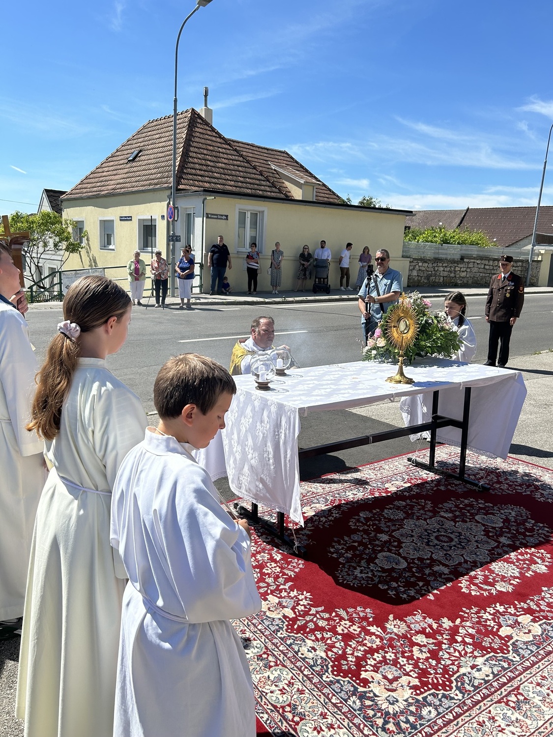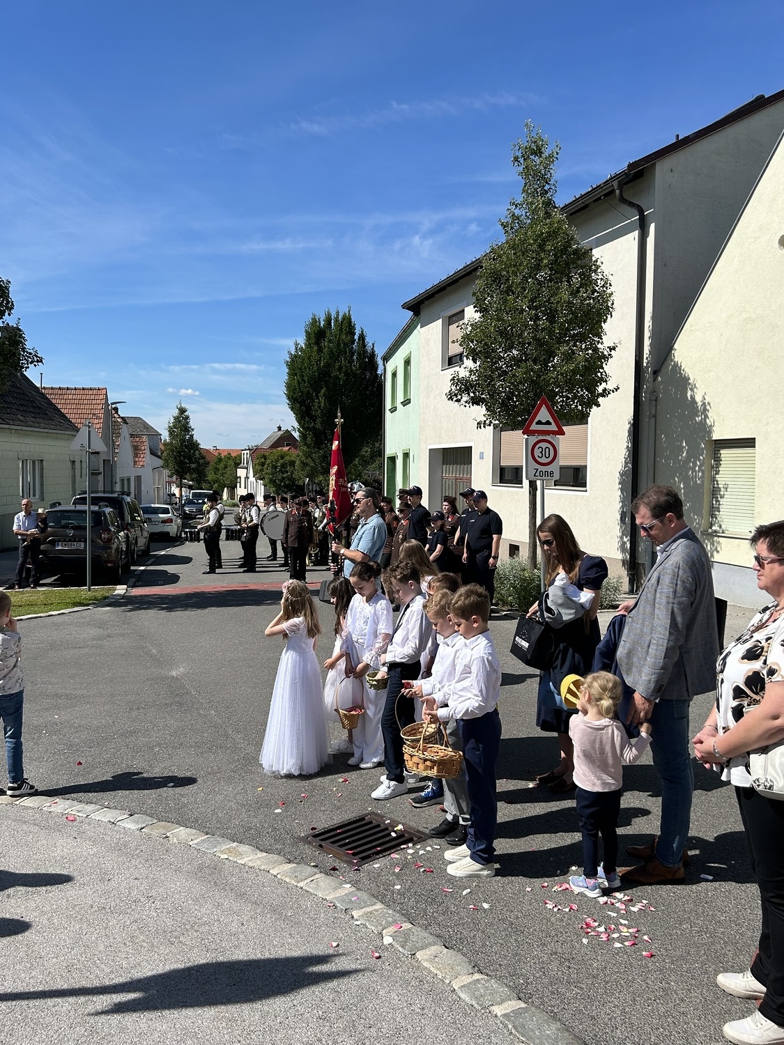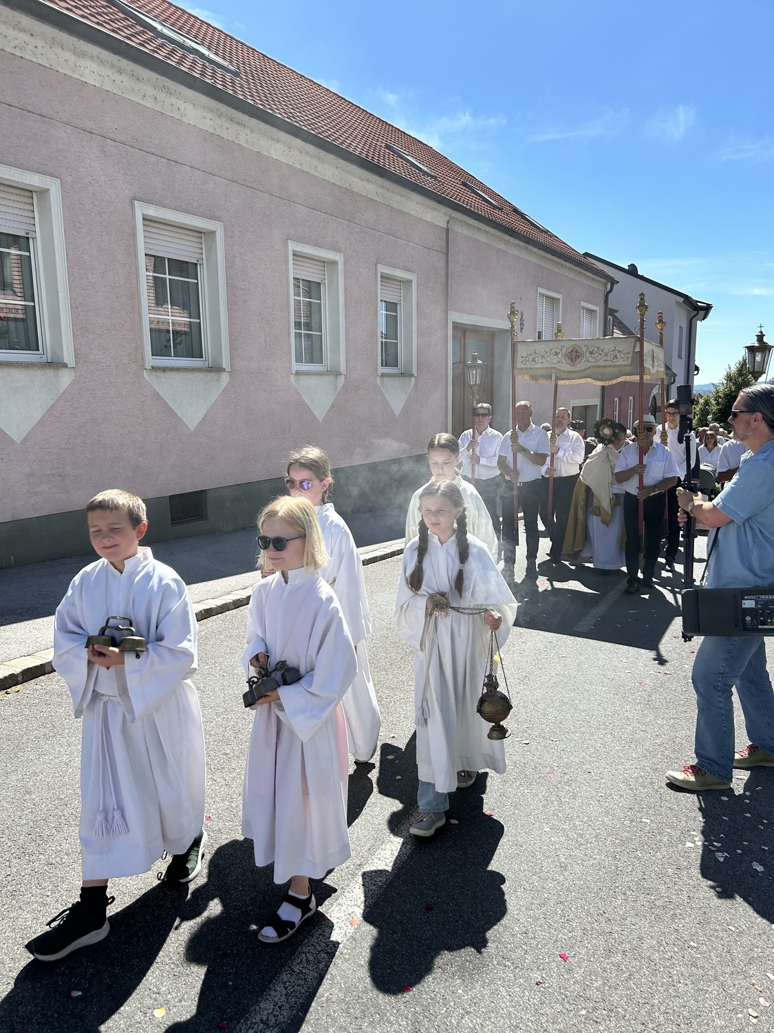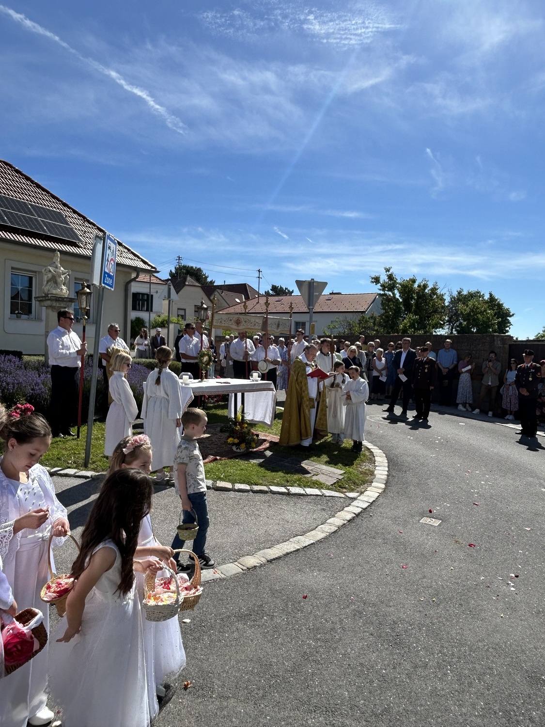 Heute waren wieder die Häuser, Straßen und Plätze im Dorf in der Stadt geschmückt. Nach der Hl. Messe in der Pfarrkirche wurde die Prozession zu den 4 Altären im Dorf von der Winzerkapelle Kleinhöflein, der Freiwilligen Feuerwehr, den Sänger:innen , den Erstkommunionskindern von Kleinhöflein, sowie zahlreichen Kindern und Gläubigen begleitet. Alles zur Ehre Gottes, den wir in Form der Hostie durch unser Dorf trugen.