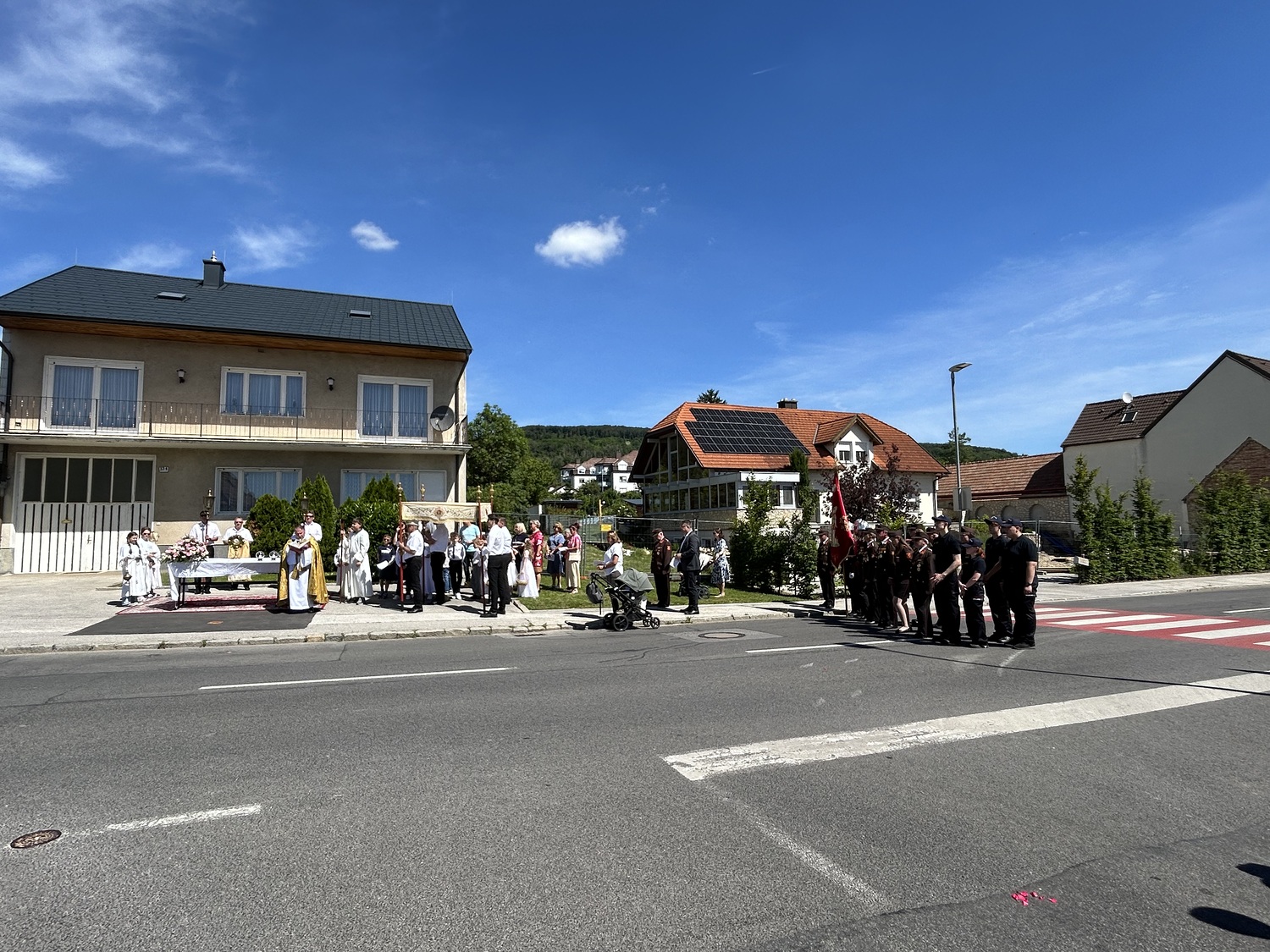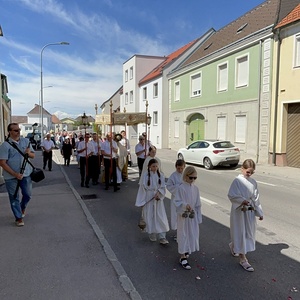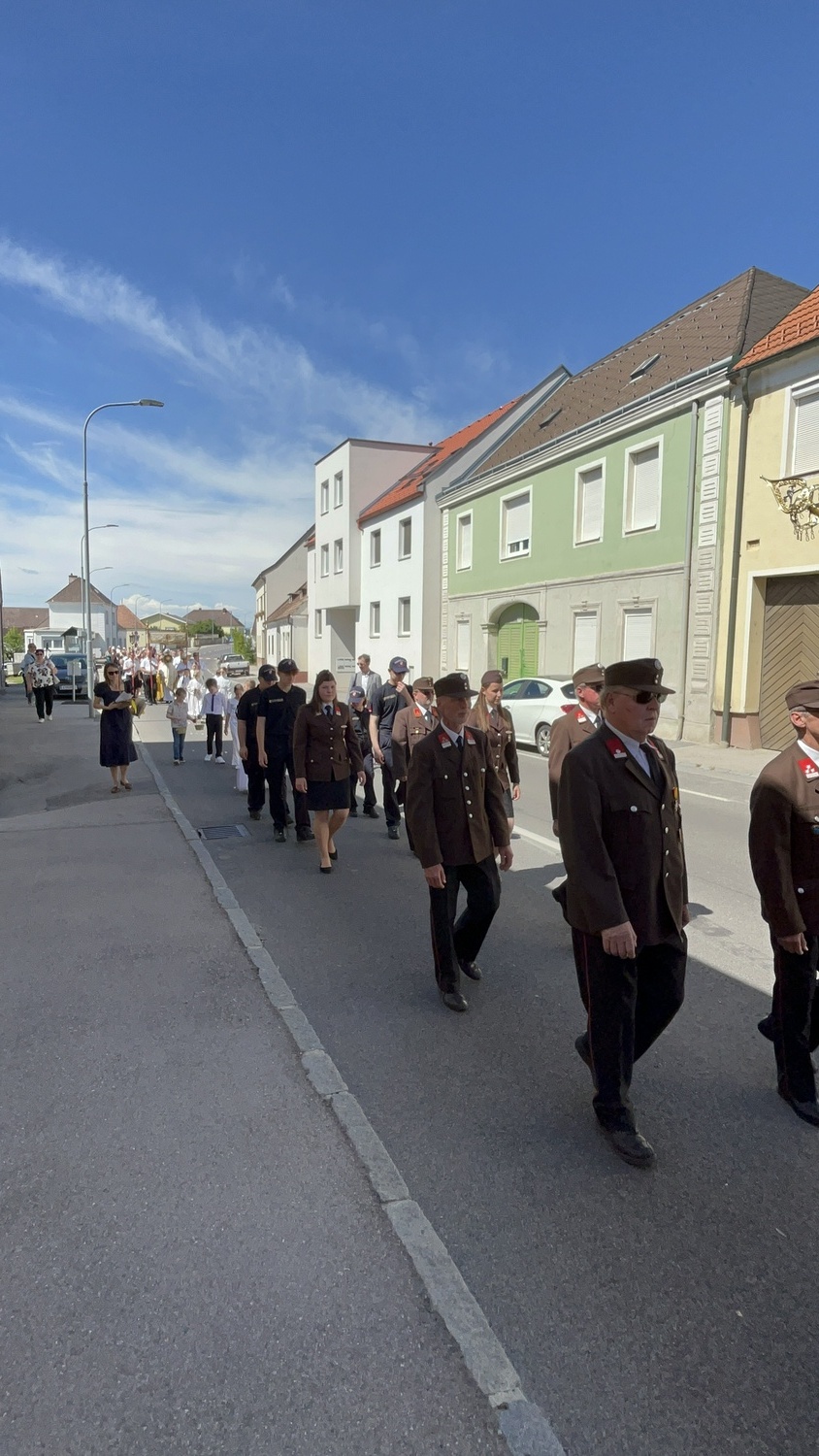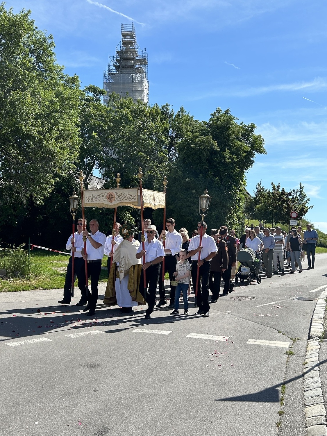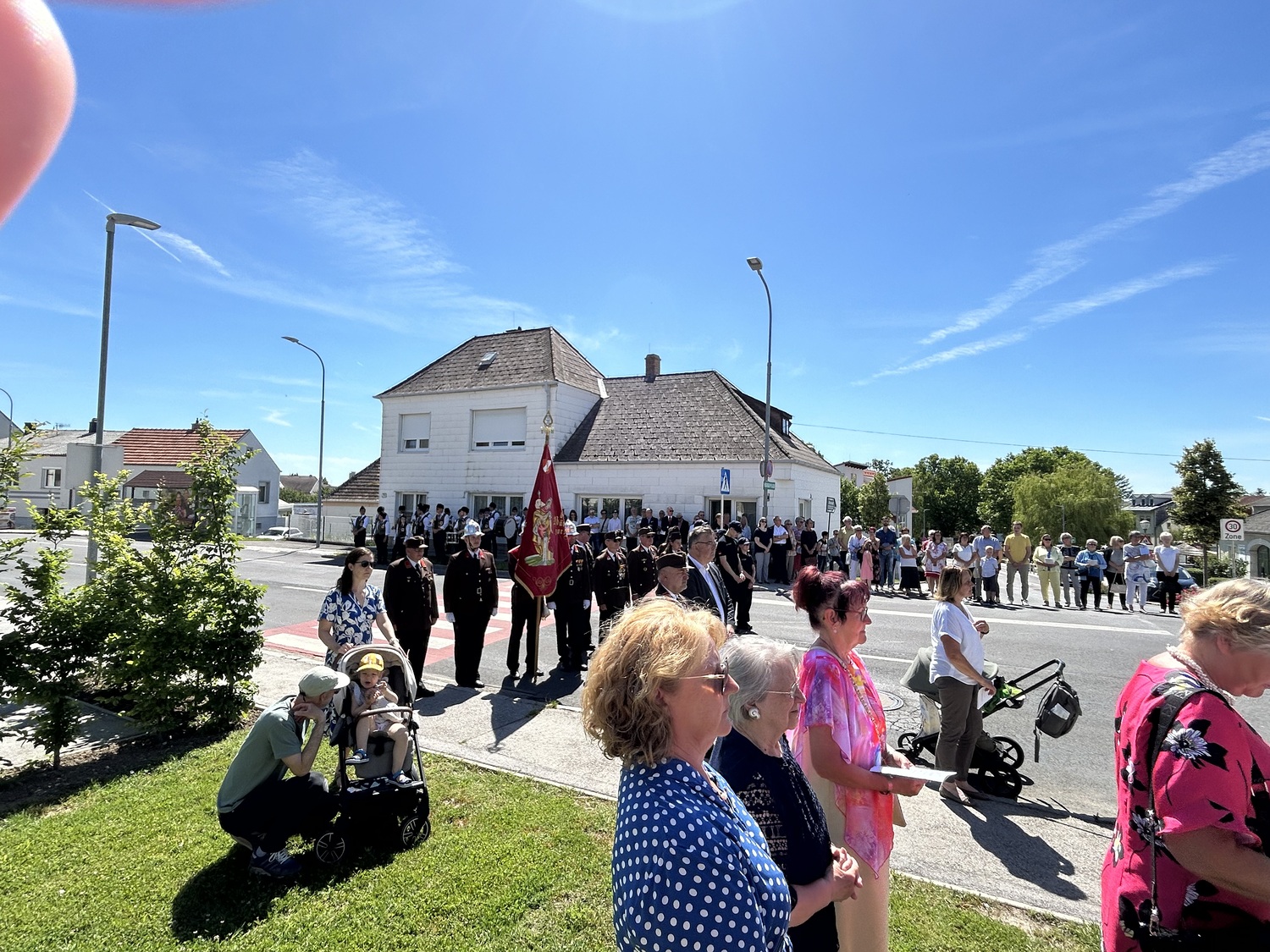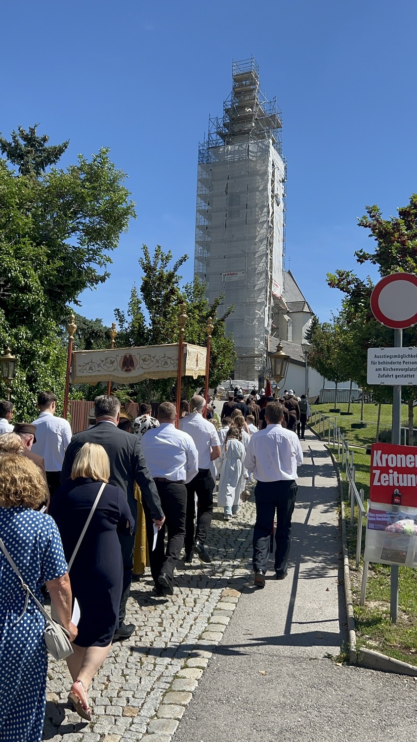 Heute waren wieder die Häuser, Straßen und Plätze im Dorf in der Stadt geschmückt. Nach der Hl. Messe in der Pfarrkirche wurde die Prozession zu den 4 Altären im Dorf von der Winzerkapelle Kleinhöflein, der Freiwilligen Feuerwehr, den Sänger:innen , den Erstkommunionskindern von Kleinhöflein, sowie zahlreichen Kindern und Gläubigen begleitet. Alles zur Ehre Gottes, den wir in Form der Hostie durch unser Dorf trugen.