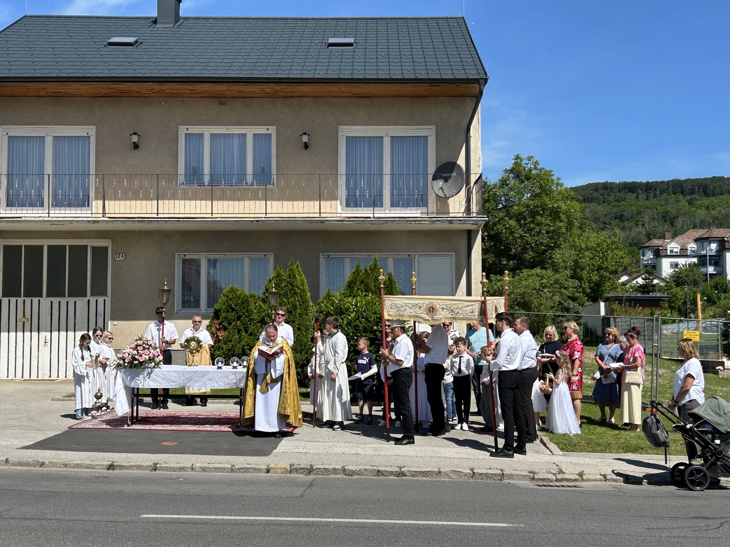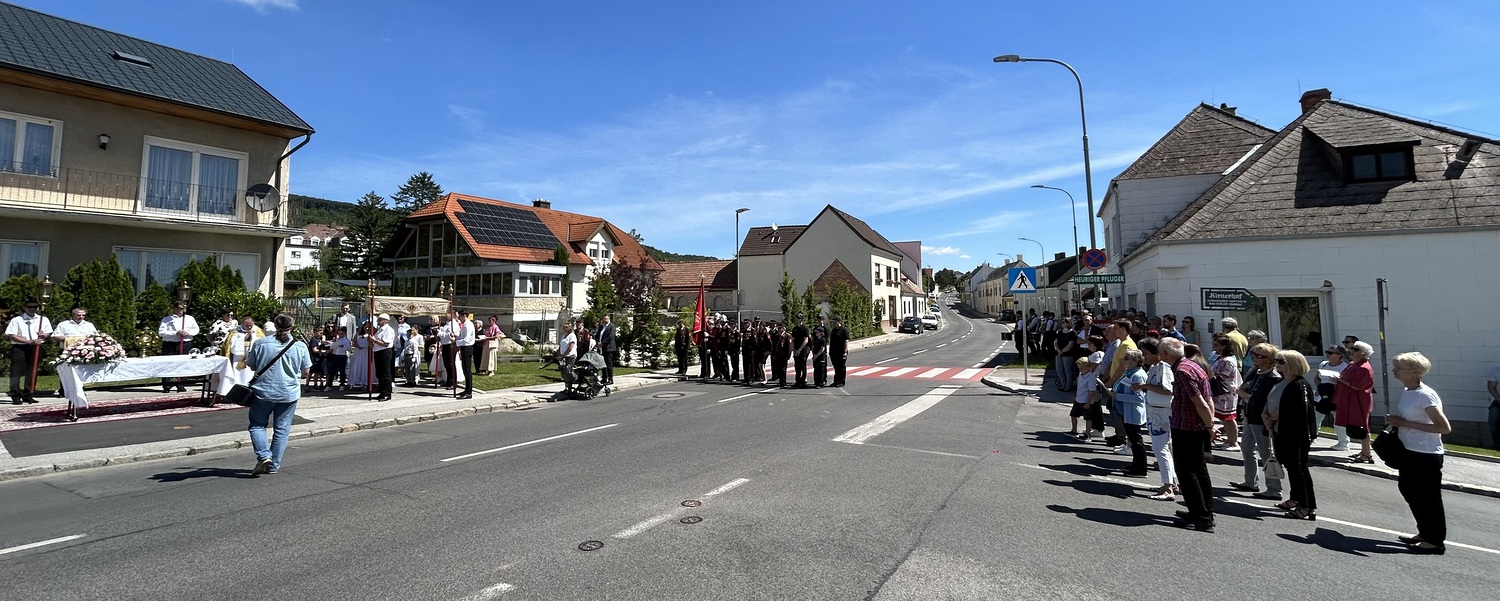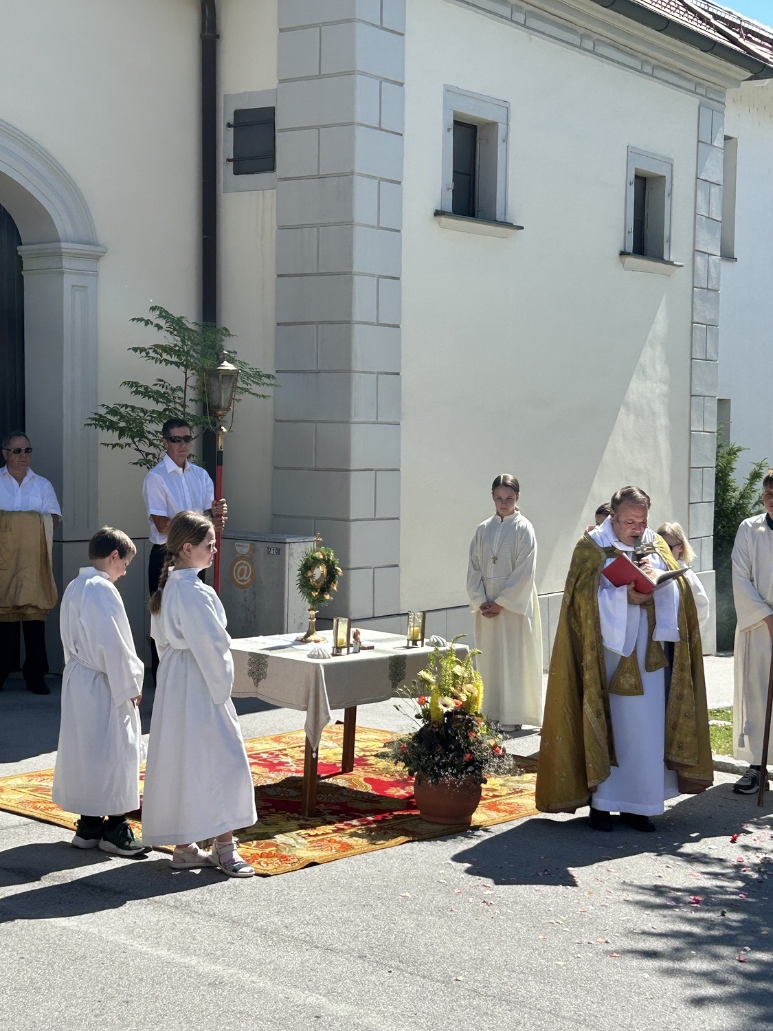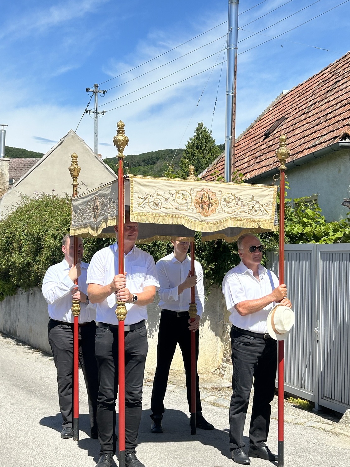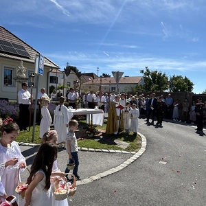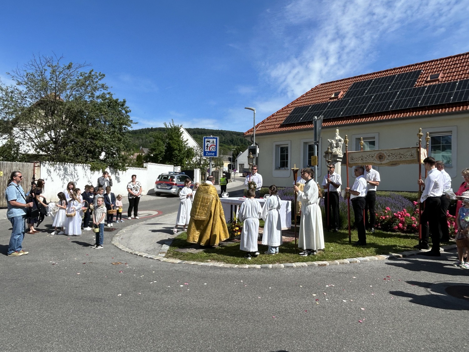 Heute waren wieder die Häuser, Straßen und Plätze im Dorf in der Stadt geschmückt. Nach der Hl. Messe in der Pfarrkirche wurde die Prozession zu den 4 Altären im Dorf von der Winzerkapelle Kleinhöflein, der Freiwilligen Feuerwehr, den Sänger:innen , den Erstkommunionskindern von Kleinhöflein, sowie zahlreichen Kindern und Gläubigen begleitet. Alles zur Ehre Gottes, den wir in Form der Hostie durch unser Dorf trugen.