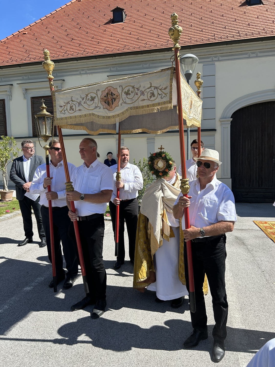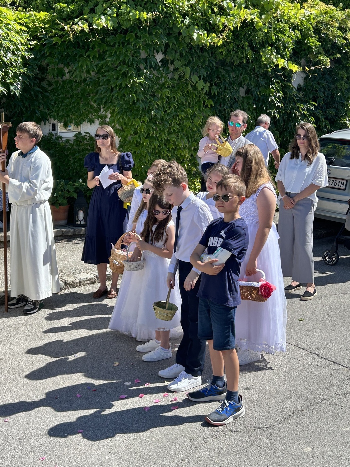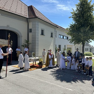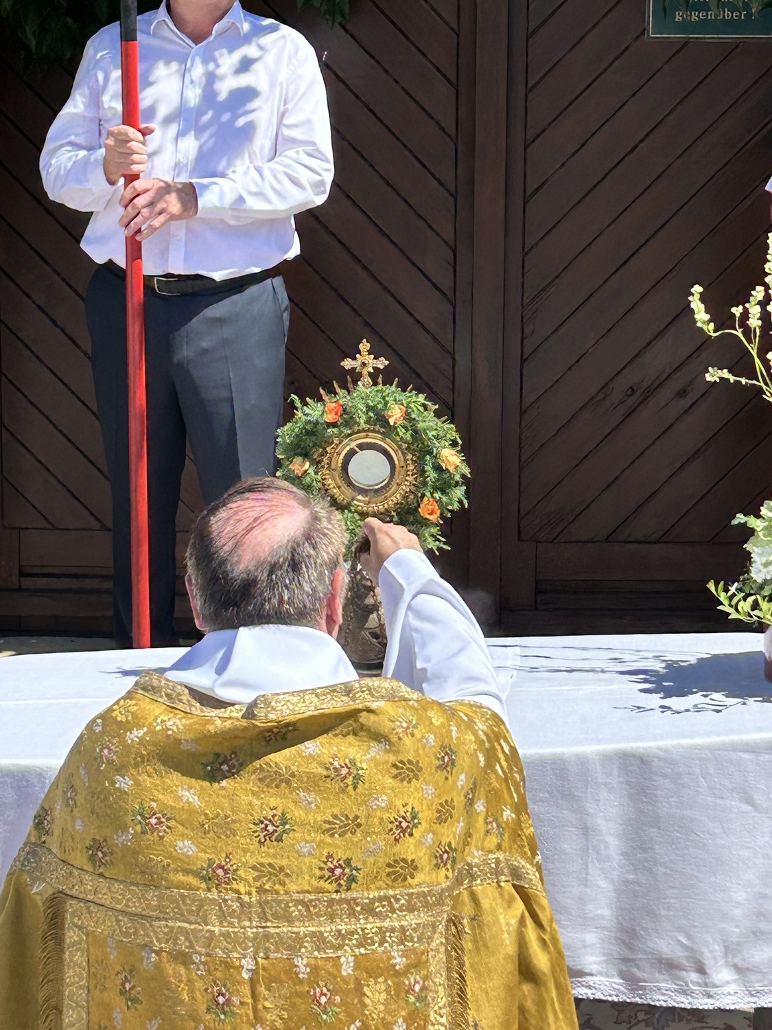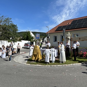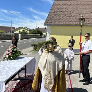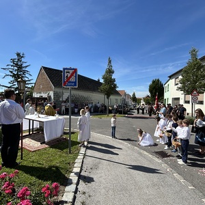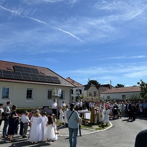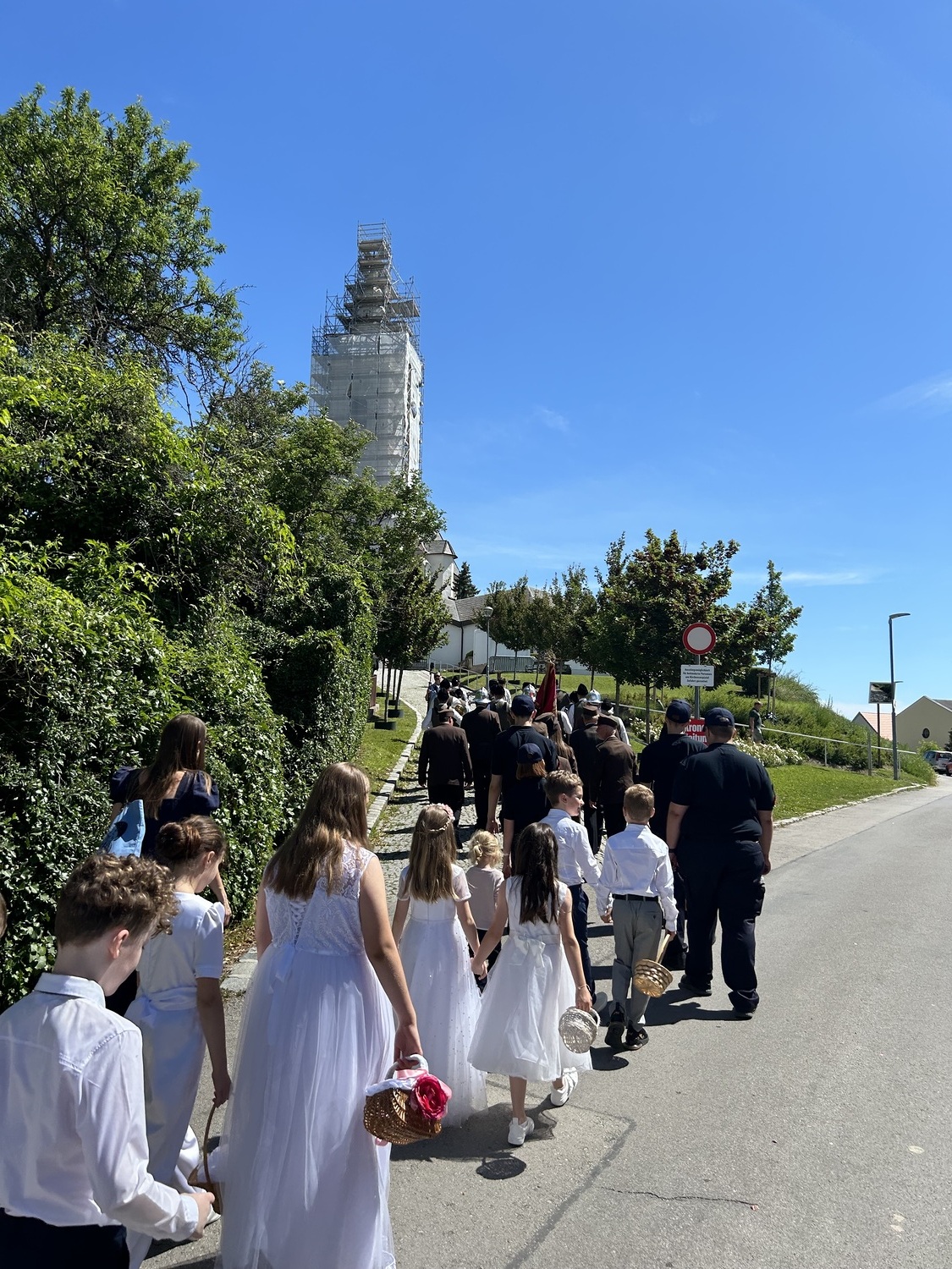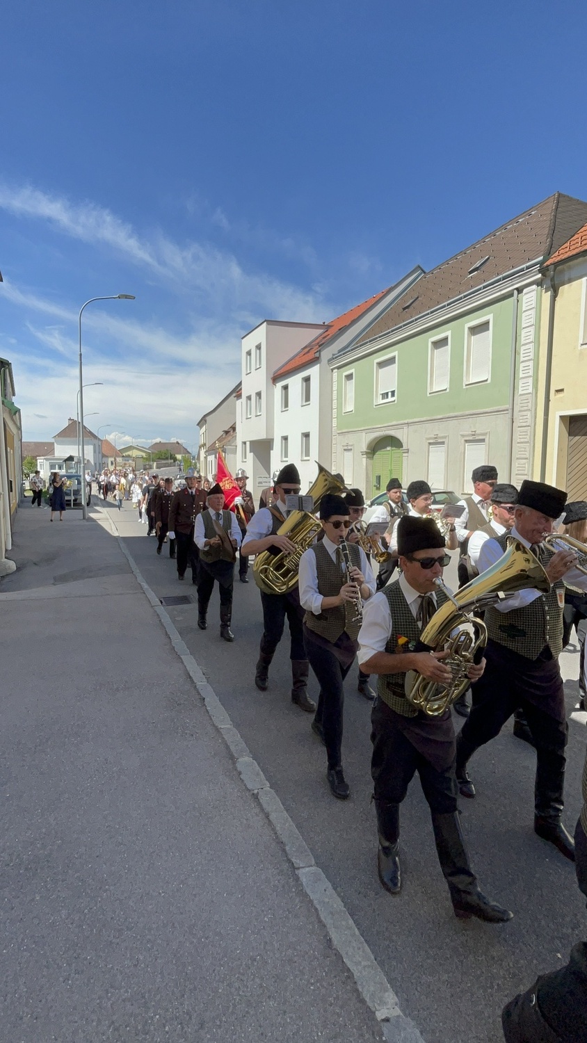Heute waren wieder die Häuser, Straßen und Plätze im Dorf in der Stadt geschmückt. Nach der Hl. Messe in der Pfarrkirche wurde die Prozession zu den 4 Altären im Dorf von der Winzerkapelle Kleinhöflein, der Freiwilligen Feuerwehr, den Sänger:innen , den Erstkommunionskindern von Kleinhöflein, sowie zahlreichen Kindern und Gläubigen begleitet. Alles zur Ehre Gottes, den wir in Form der Hostie durch unser Dorf trugen.