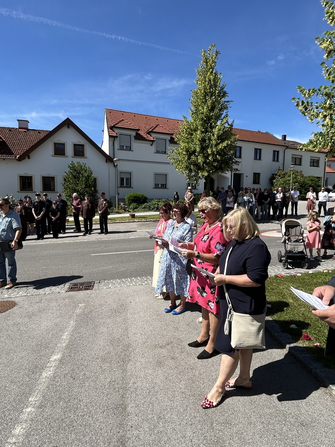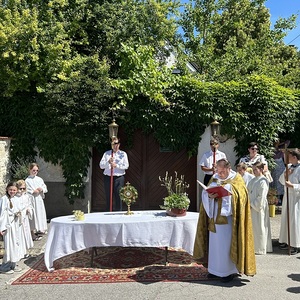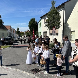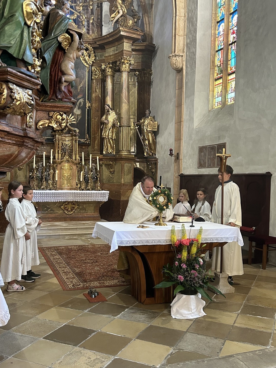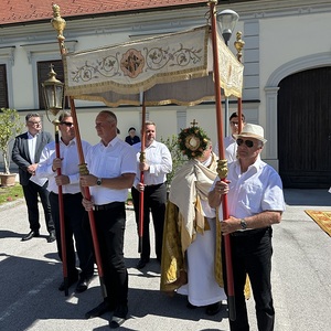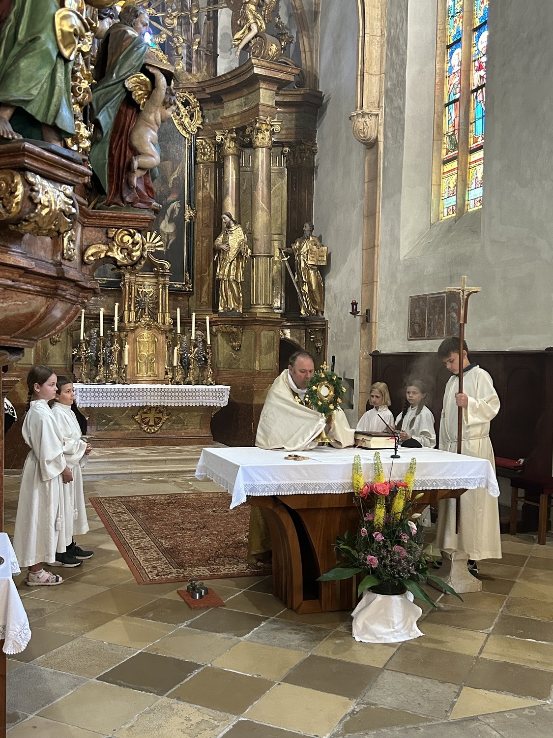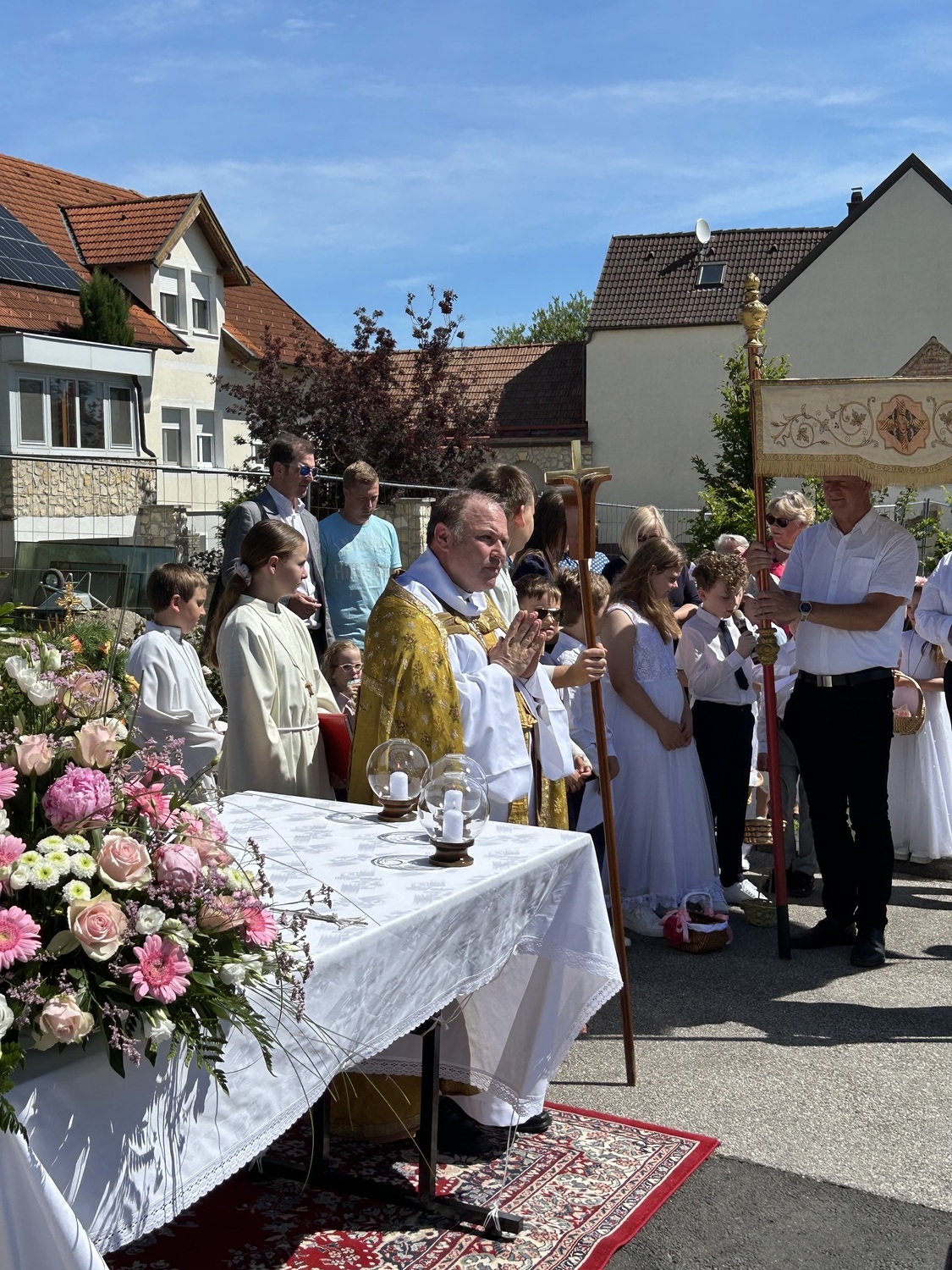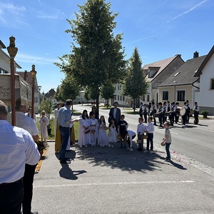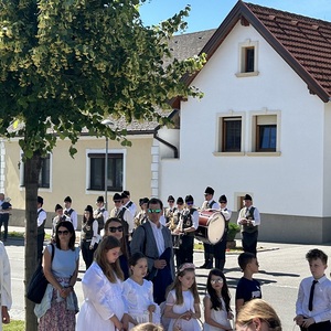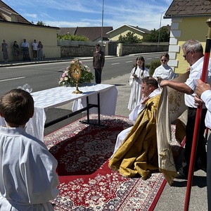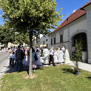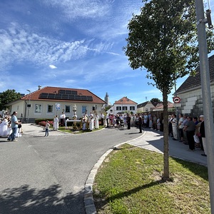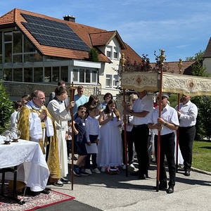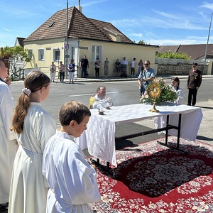 Heute waren wieder die Häuser, Straßen und Plätze im Dorf in der Stadt geschmückt. Nach der Hl. Messe in der Pfarrkirche wurde die Prozession zu den 4 Altären im Dorf von der Winzerkapelle Kleinhöflein, der Freiwilligen Feuerwehr, den Sänger:innen , den Erstkommunionskindern von Kleinhöflein, sowie zahlreichen Kindern und Gläubigen begleitet. Alles zur Ehre Gottes, den wir in Form der Hostie durch unser Dorf trugen.