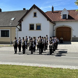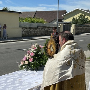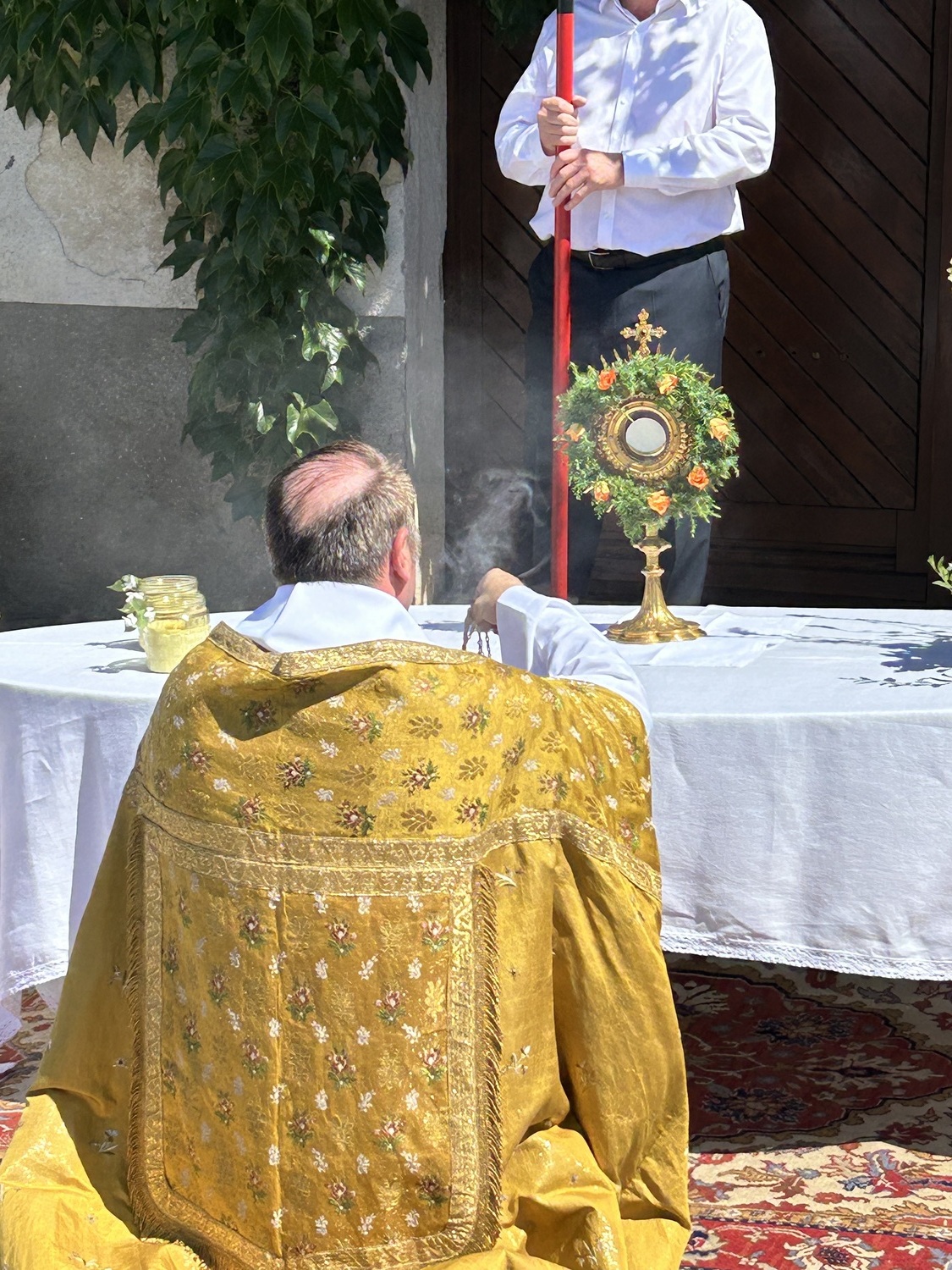 Schließlich gehen wir noch mit unserer Prozession am Haus eines Kameraden unseres Pfarrers vorbei, seine Frau sieht nicht mehr gut, ihm ist es gesundheitlich auch schon einmal besser gegangen. Seine Frau kommt vor die Türe. Wir halten an und auch hier wird der Segen gespendet.