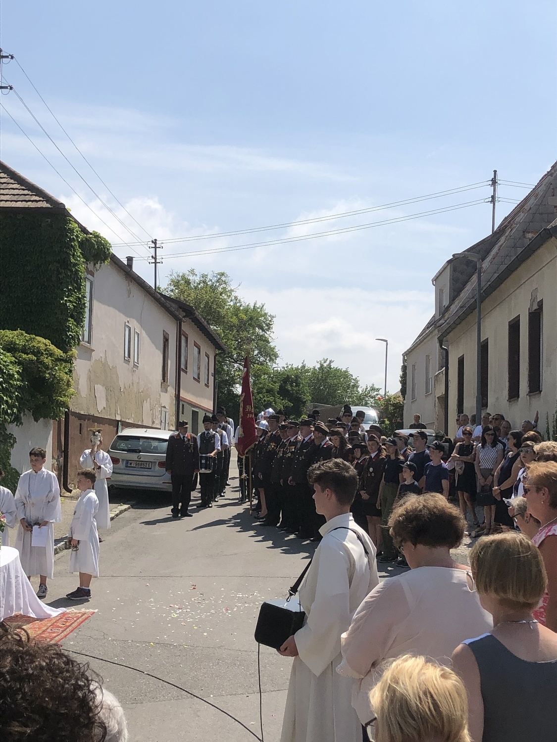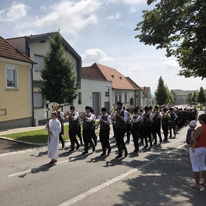 Zu Fronleichnam bezeugen wir unseren Glauben and die leibliche Gegenwart Jesu Christi im Saktrement der Eucharistie. Der Name des Festes leitet sich aus dem Mittelhochdeutschen "vrone licham" - Leib des Herren ab. Das Brauchtum der Fromleichnamsprozession, bei der der Leib Christi in einer Monstranz durch die Straßen getragen wird, stammt aus dem Mittelalter. Dabei werden auch der Flurschutz, Feldweihen und Wetterbitten dargebracht. Bei der Prozession nahmen traditionell Feuerwehr und Musikverein, sowie die Erstkommunionskinder und viele Gläubige teil.