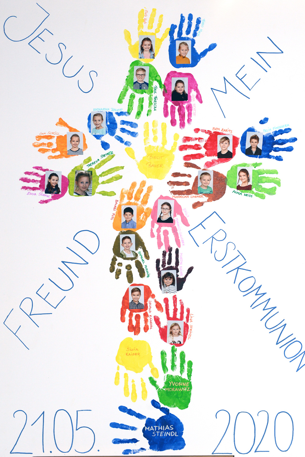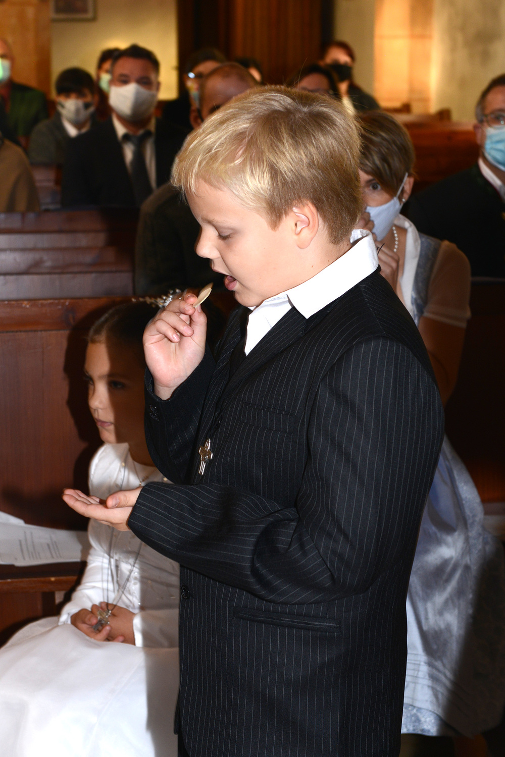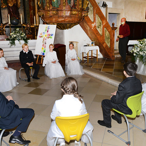 Seit Dezember 2019 haben sich 17 Kinder mit ihren Tischeltern auf das Fest der Erstkommunion vorbereitet. Sie beschäftigten sich mit dem Thema: Jesus, unser Freund. Meistens trafen sich die Kinder im Pfarrhof, in der Kirche und am Pfarrgarten mit ihren Tischeltern, um den Inhalt der Vorbereitung kennenzulernen bzw. zu vertiefen. Nach intensiven Vorbereitungen feierten sie am Sonntag, dem 4. Oktober 2020 das Fest der ersten Heiligen Kommunion. In der Pfarrkirche begleiteten Orgel und Combo mit einigen vorgesehenen Lieder die Messe musikalisch. Die Kinder durften einige Einleitungstexte so wie die Fürbitten vorsprechen und vorbeten. Bei der Begrüßung von Ratsvikarin und der Einleitung des Pfarrers wurde die Bedeutung der Freundschaft kurz gedeutet. „Es ist gut und schön, eine Freundin und einen Freund zu haben“, so Pfarrer Willi. So wie in der menschlichen Beziehung wird die Pflege der Freundschaft mit Gott auf weiteres benötigt.
