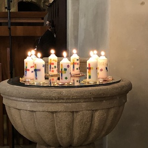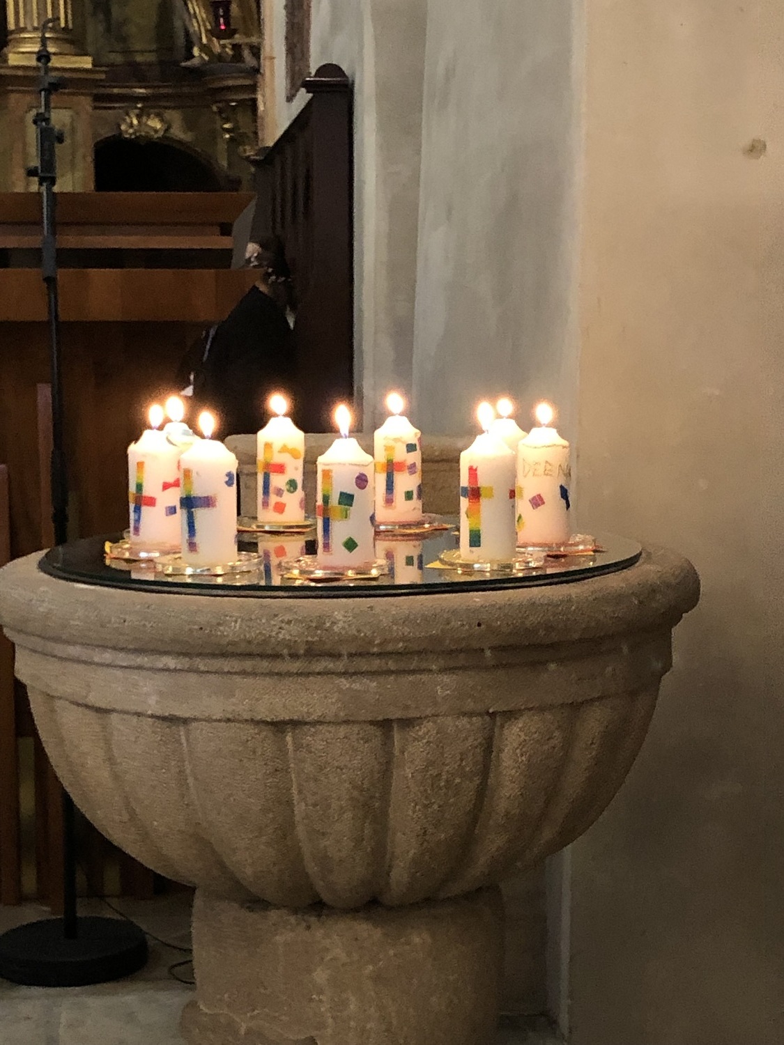 Bei der Tauferneuerung wurden die Kerzen an der Flamme der Osterkerze entzündet. Diese Flamme erinnert an das Licht der Welt und wird durch ihre Weitergabe nicht kleiner, sondern vermehr sich.