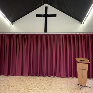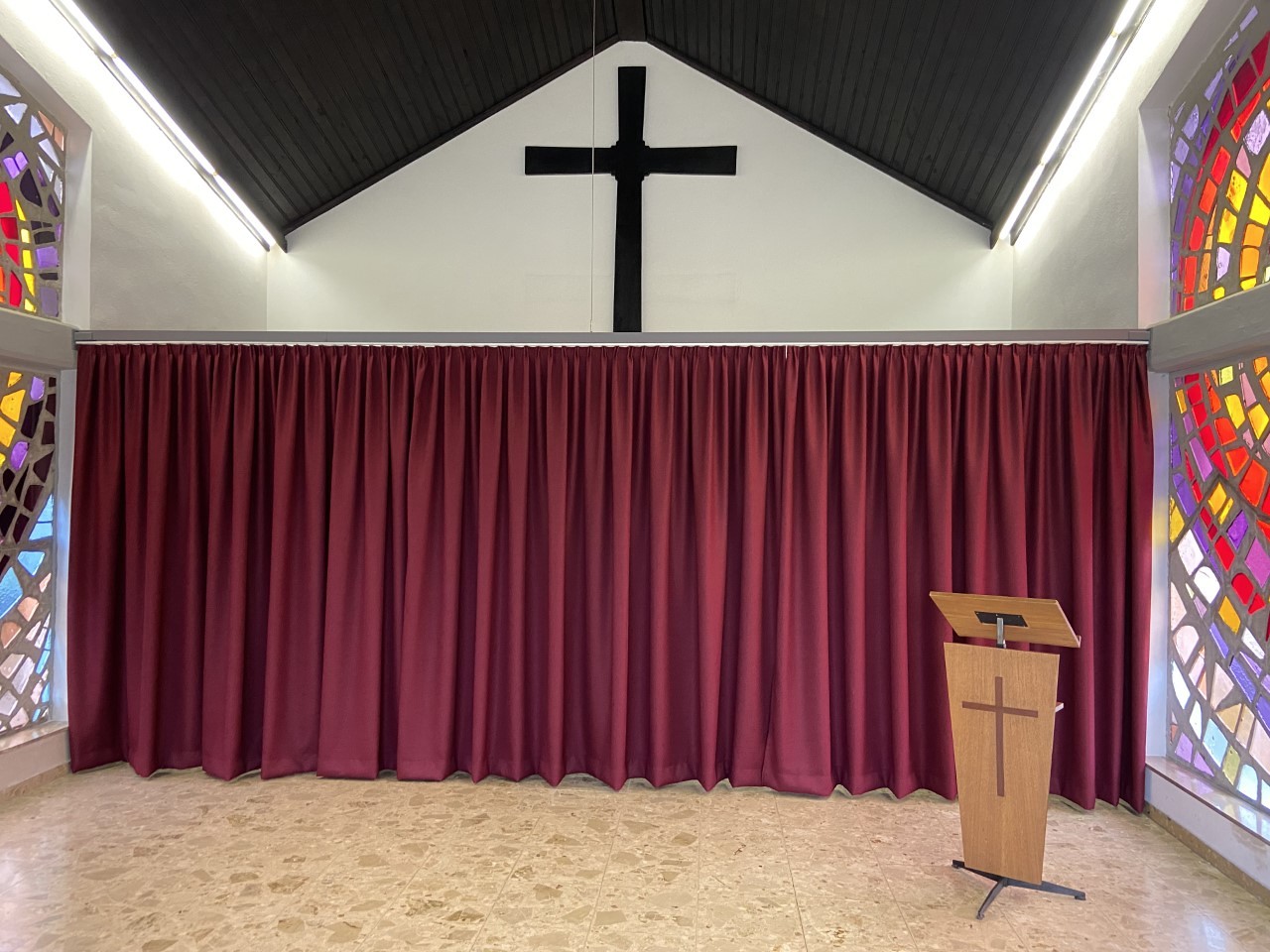 Innerhalb kürzester Zeit wurde nun ein Vorhang mit Schiene gefertigt, welcher es ermöglicht die Kühlung der Verstorbenen letztlich von deren Aufbahrung bei der Verabschiedung räumlich zu trennen und diese würdig zu ermöglichen.