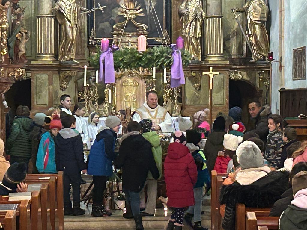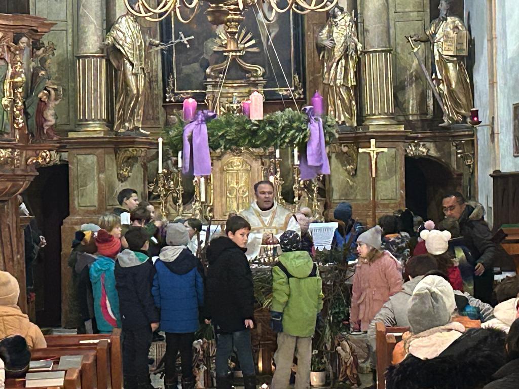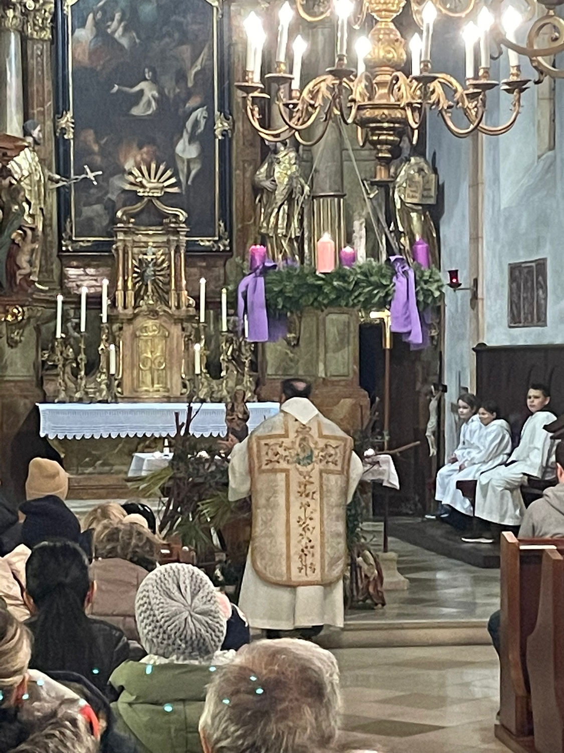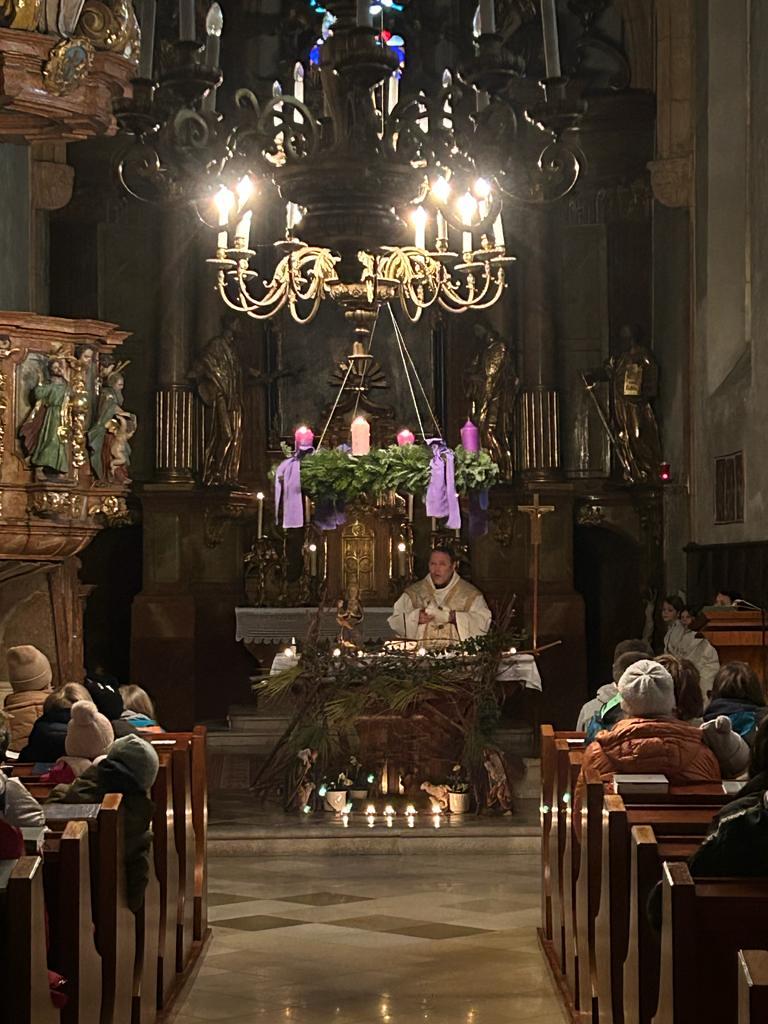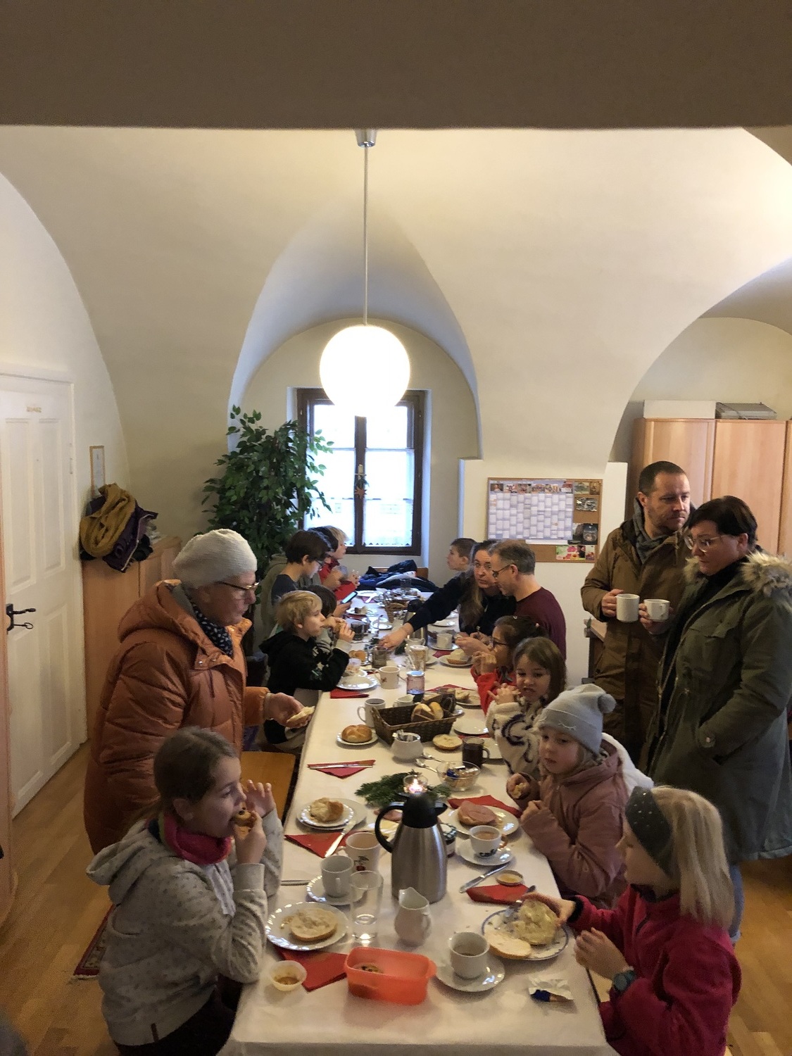Familien-Rorate mit weit über 200 Mitfeiernden in der übervollen Kleinhöfleiner Kirche. Im Anschluss wurde in den Pfarrhof zum gemeinsamen Frühstück eingeladen.