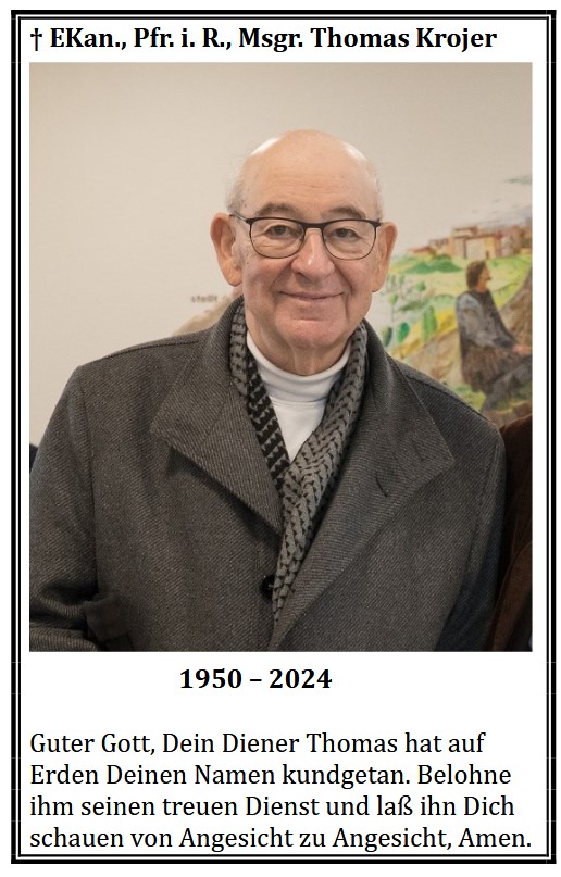 Am Donnerstag, dem 1. Mai 2024, wurde der hochwst. Herr Kan. em. Msgr. Ehrenkons.Rat Thomas Krojer, Pfarrer i. R., im Krankenhaus der Barmherzigen Brüder in Eisenstadt von Gott dem Herrn zu sich gerufen.