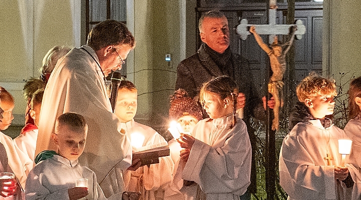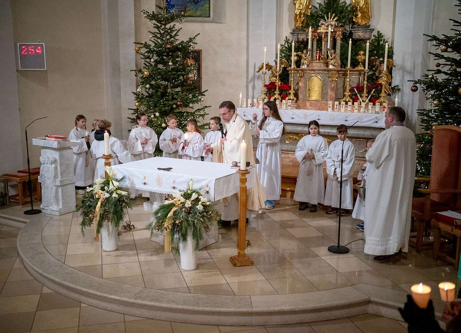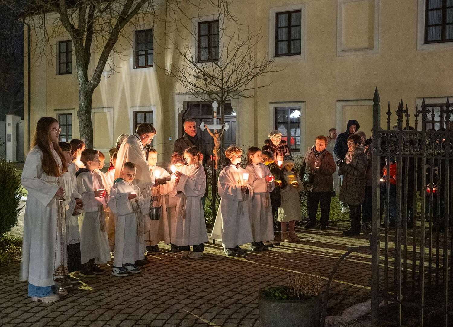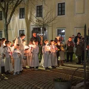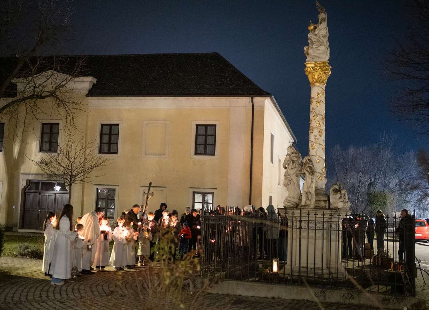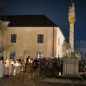 Um 18.00 Uhr erfolgte die Segnung der mitgebrachten Kerzen bei der Dreifaltigkeitssäule, danach die Lichterprozession in die Kirche mit anschließender hl. Messe. Am Ende der Messe wurde der Blasiussegen mit zwei vor dem Hals gekreuzten Kerzen erteilt.