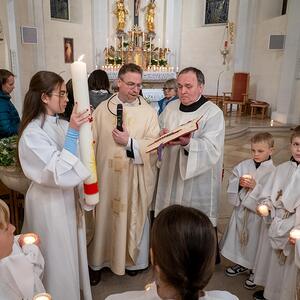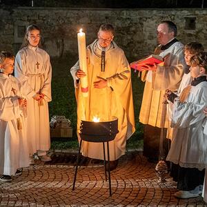 Nach Einbruch der Dunkelheit beginnt die Feier der Osternacht. Vor der Kirche wurde das Osterfeuer entzündet und gesegnet. Die brennende Osterkerze wird als einziges Licht in die unbeleuchtete Kirche getragen. Dabei wird dreimal der Ruf „Lumen Christi“ (Christus, das Licht) angestimmt, worauf die Kirchenbesucher mit „Deo gratias“ (Gott sei Dank) antworten. Nach der Lichtfeier erklingt im Wortgottesdienst nach der Fastenzeit wieder das Halleluja. Bei der Tauffeier erinnern wir uns an unsere eigene Taufe. Abgeschlossen wird die Osternacht mit der Eucharistiefeier.