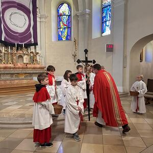 Der Karfreitag begann um 9.00 Uhr mit einer Kreuzwegandacht. Der Karfreitag ist der einzige Tag des Jahres, an dem keine Eucharistie gefeiert wird. Im Mittelpunkt der Liturgie steht die Feier vom Leiden und Sterben Christi sowie die Kreuzverehrung, weil Jesus am Kreuz für uns sein Leben hingegeben hat. Der Karfreitag ist ein strenger Fasttag.