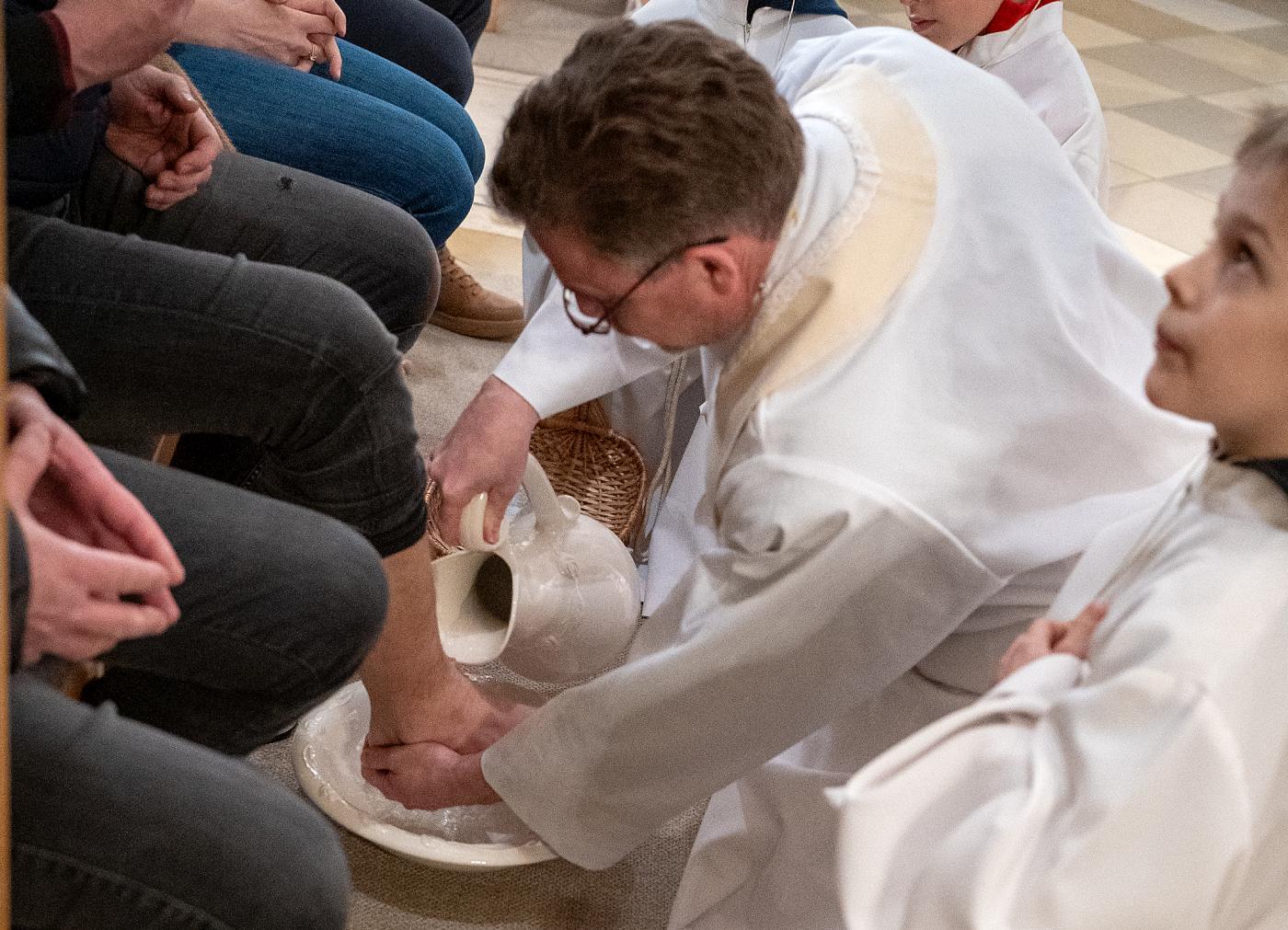 Am Gründonnerstag, dem Donnerstag vor Ostern, erinnert die Kirche an das Letzte Abendmahl Jesu mit seinen Jüngern. In Anlehnung an das letzte Abendmahl, bei dem Jesus seinen Jüngern die Füße wusch, hat Pfarrmoderator Mag. Stefan Jahns auch mehreren Eltern der Erstkommunionkinder die Füße gewaschen. Als Ausdruck der Trauer verstummen während der Messe Orgel und Glocke und schweigen bis zur Osternacht, Kinder ersetzen mit Holzratschen den Glockenklang bei Gottesdiensten und Gebeten. Nach der hl. Messe wurde die Ölbergandacht gehalten, die an die Nachtwache der Jünger am Ölberg erinnert.