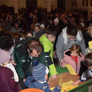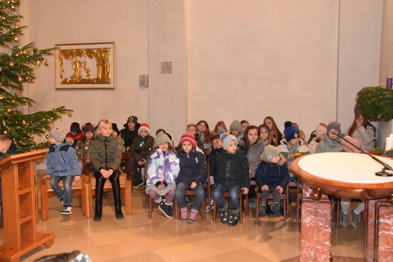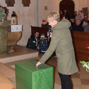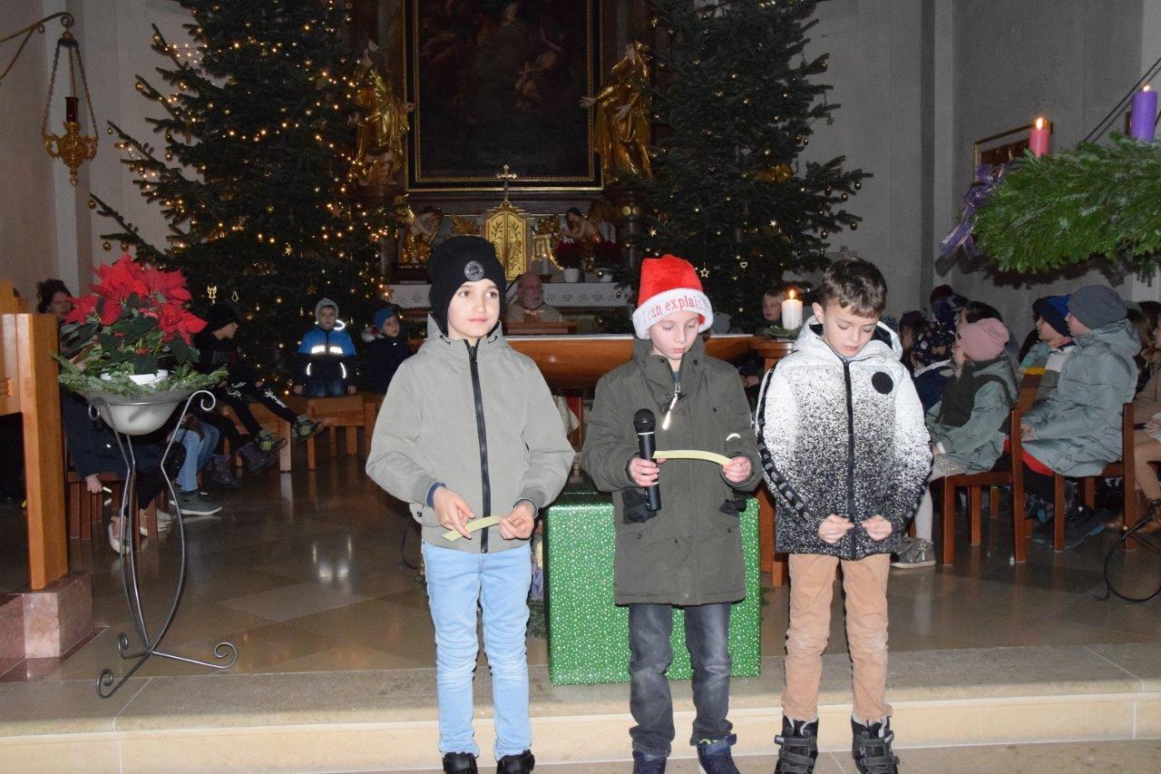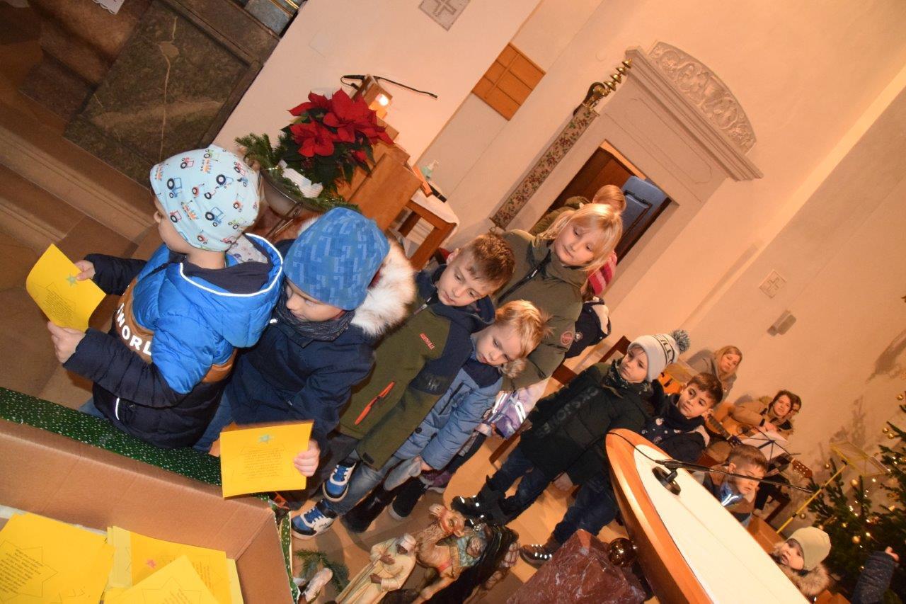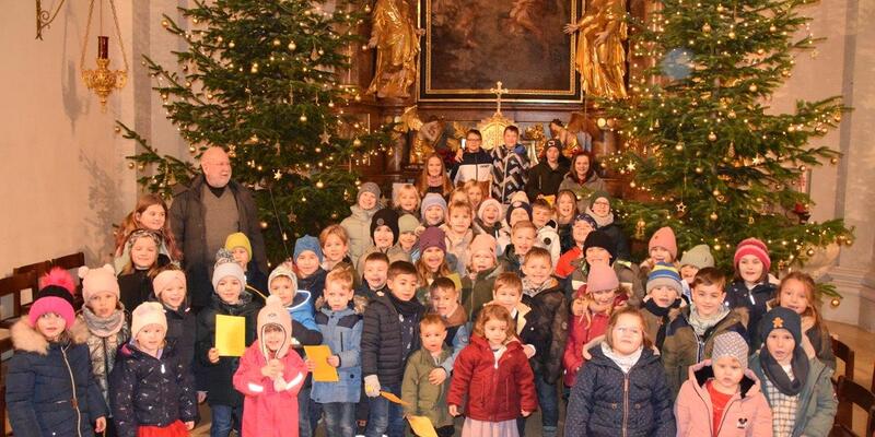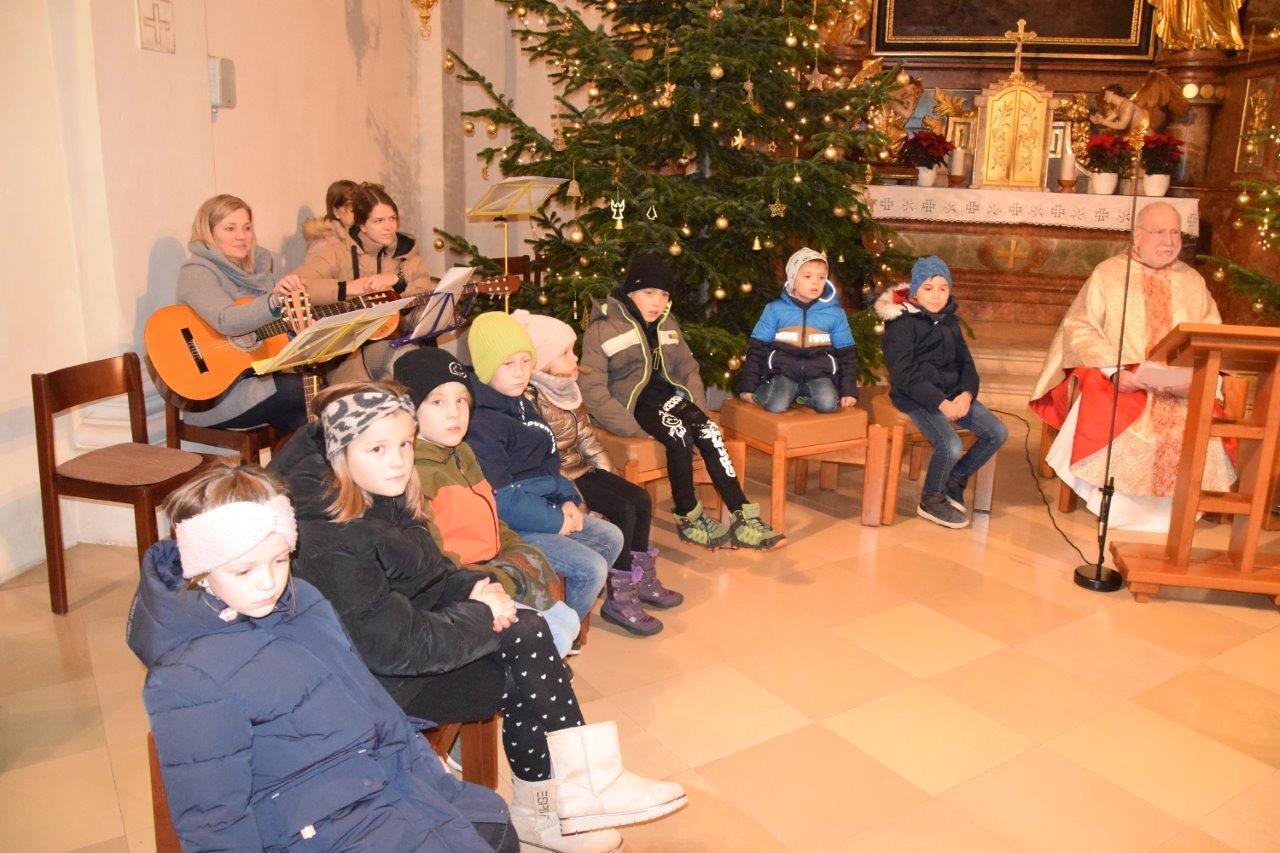 Im Kinderwortgottesdienst am Heiligen Abend feierten wieder sehr viele Kinder mit ihren Familien die Geburt von Jesus. Es wurden die Kerzen am Adventkranz noch einmal entzüdet. Im Evangelium erzählte uns Hr. Pfarrer Giefing die Weihnachtsgeschichte und ein großes Paket vor der Krippe machte alle neugierig. Was da wohl drinnen war? Jesus schenkt sich uns durch seine Geburt. Als Erinnerung daran, durfte sich jedes Kind einen Leuchtstern aus dem großen Paket mit nach Hause nehmen. Zum Schluss sangen alle gemeinsam "Stille Nacht" begleitet von Cosima Maier auf der Orgel.