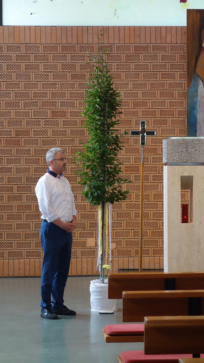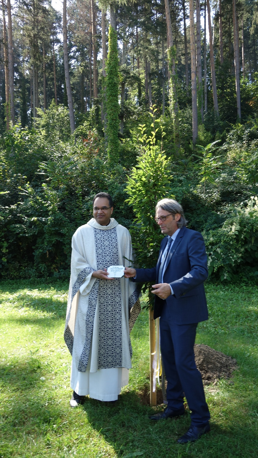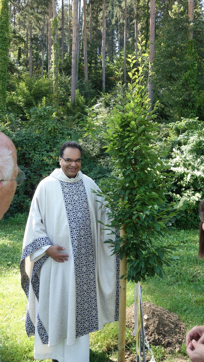 Nach der Hl. Messe pflanzte Pater Kuruvila einen Baum, eine Säulenhainbuche, im Bereich des Kirchengrundes, hinter der Pfarrkirche.