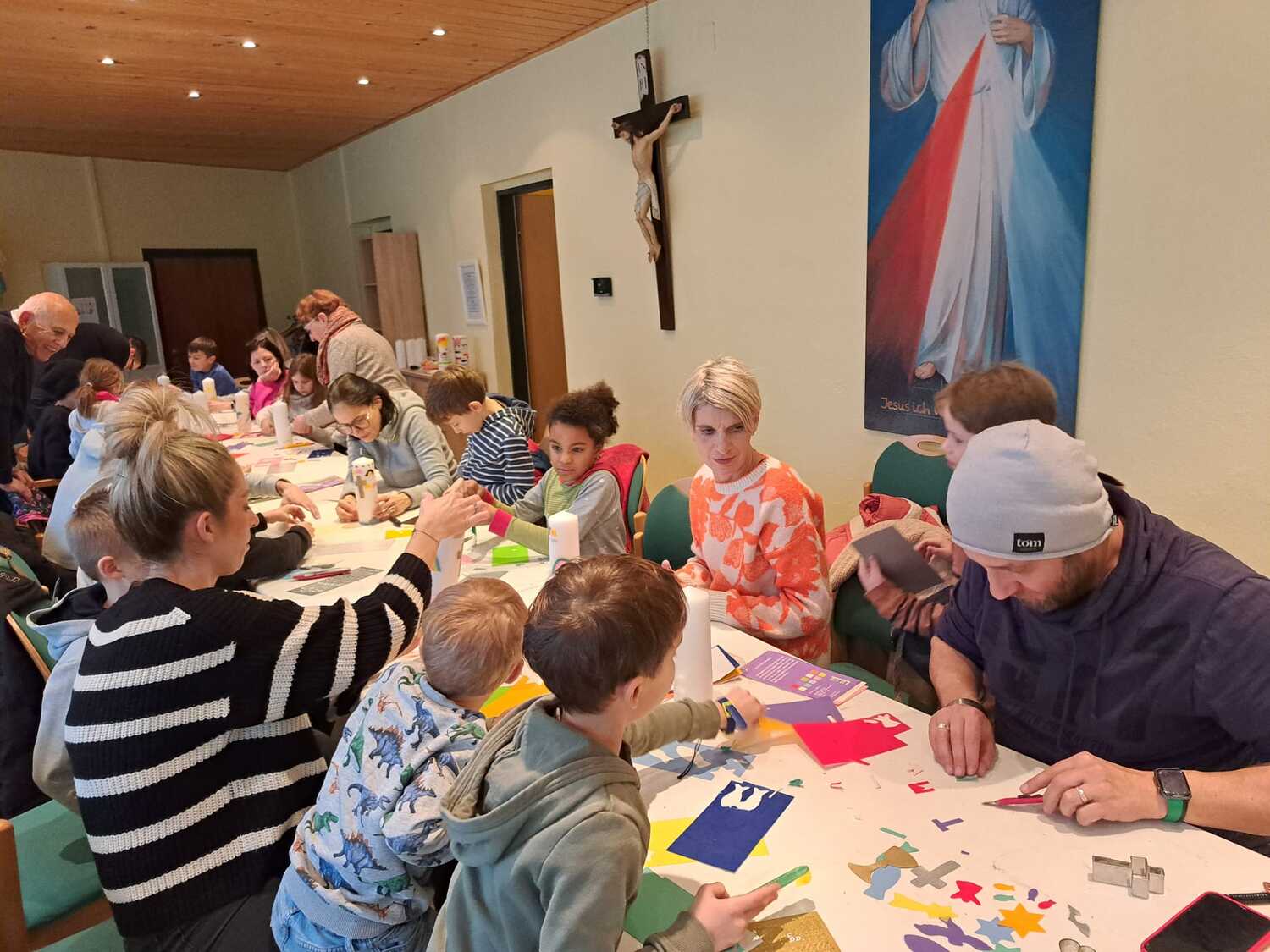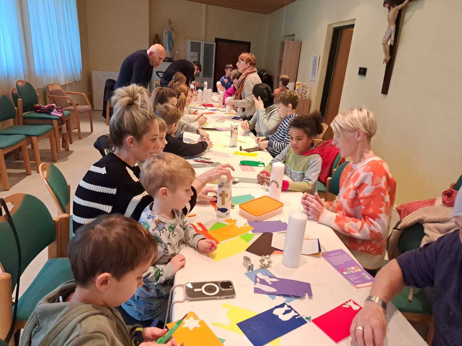 Die Erstkommunionkinder mit ihren Eltern beim gestalten