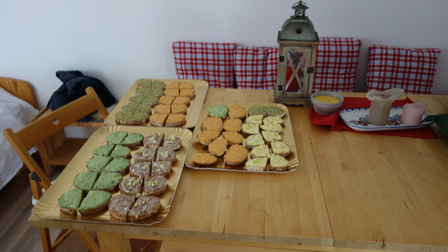 Es gab gute Brote mit Aufstrich zu essen, Osterstriezel, Ostereier und Schoko- Eier. Es wurde aber auch Wein gereicht und alkoholfreie Getränke.