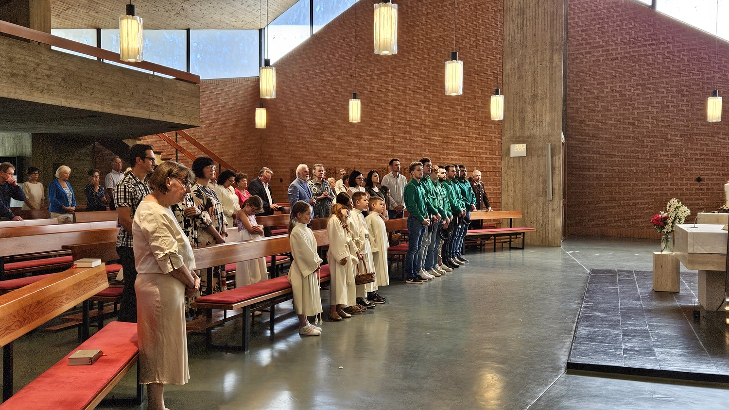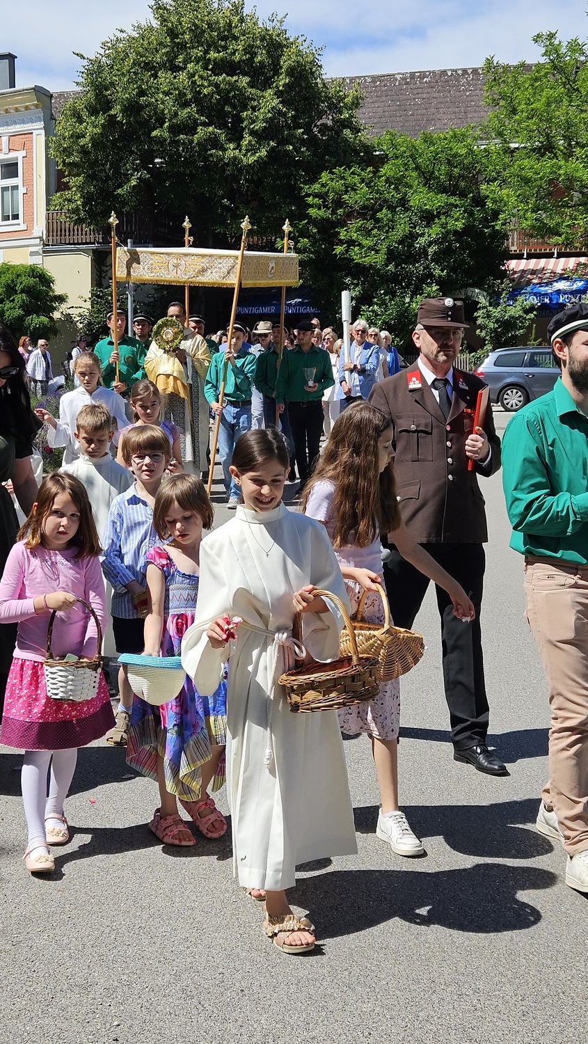 Die Erstkommunionkinder, die vorige Woche ihre Hl. Erstkommunion hatten, nahmen auch sehr engagiert an der Prozession teil und streuten, einer alten Tradition folgend, Blumenblütenblätter auf den Prozessionsweg.