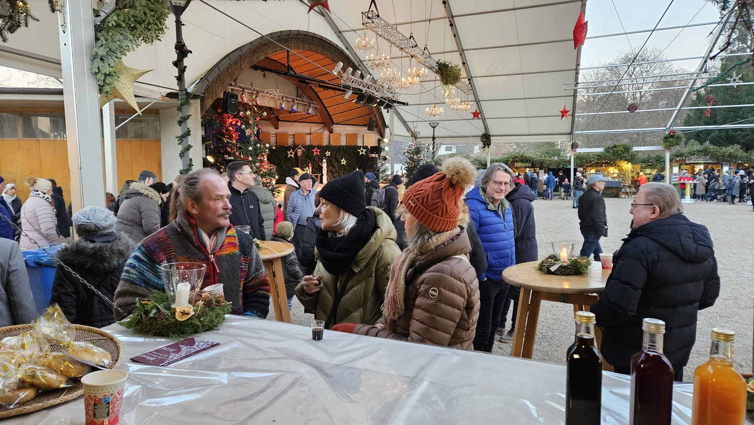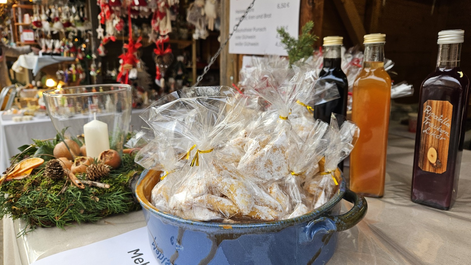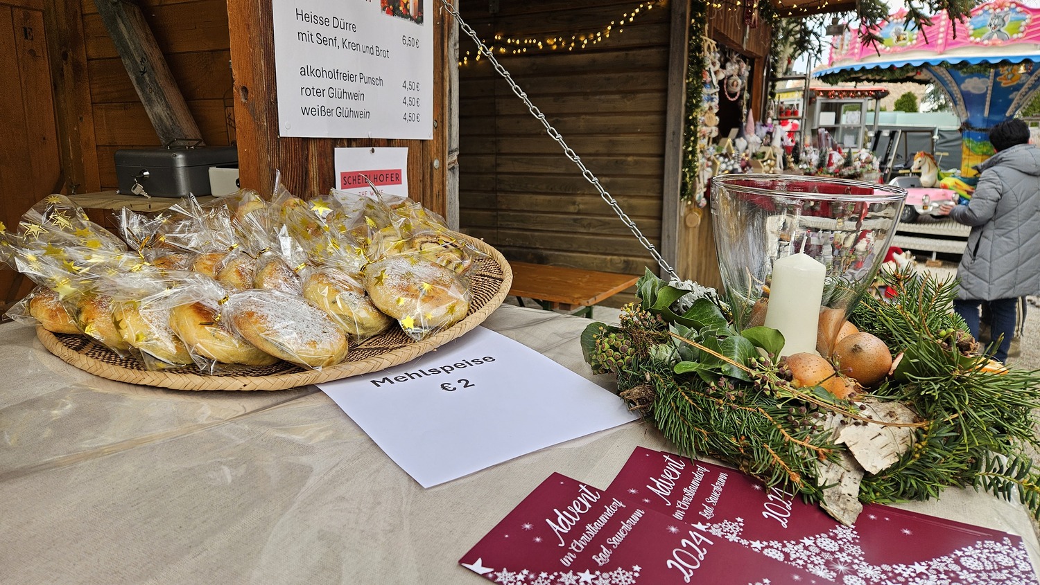 Delikate, von Bad Sauerbrunner Köchinnen zubereitete Mehlspeisen waren vorbereitet. Insbesondere der Lebkuchen, die Mohnzelten, die Rahmecken und der Kärtner Reindling kamen bei den Besuchern gut an. Wie schon in den Vorjahren wurde aber auch kesselwarme Dürre Wurst mit Senf, Kren und Brot den Gästen angeboten. Als vorweihnachtliche Getränke wurden weißer und roter Glühwein und natürlich ein ausgezeichneter alkoholfreier Punsch serviert. Für Genießer gab's auch Nussschnaps, Marillenlikör und Ripotella-Schnaps.