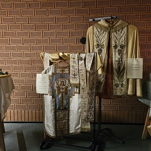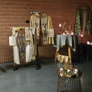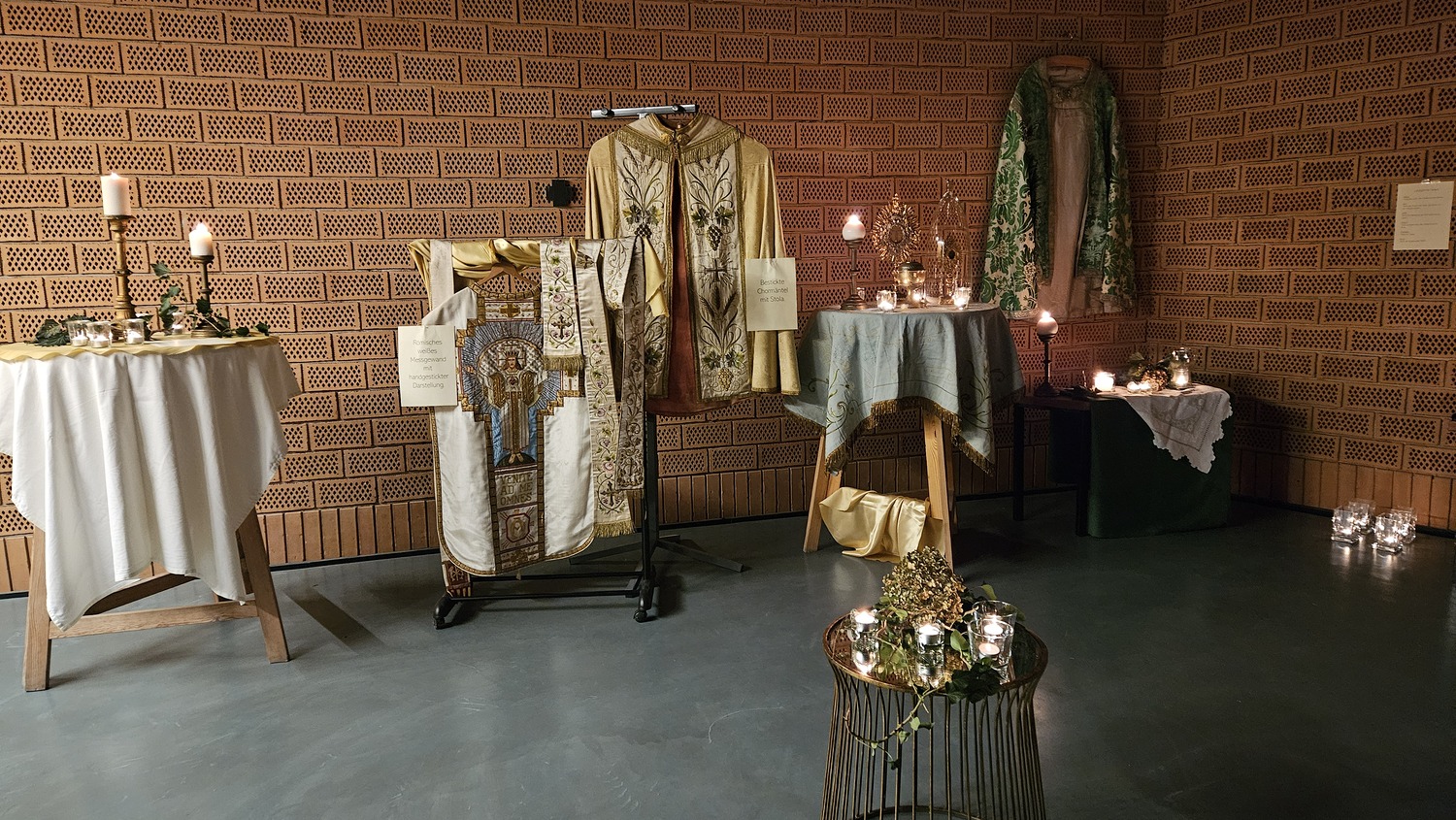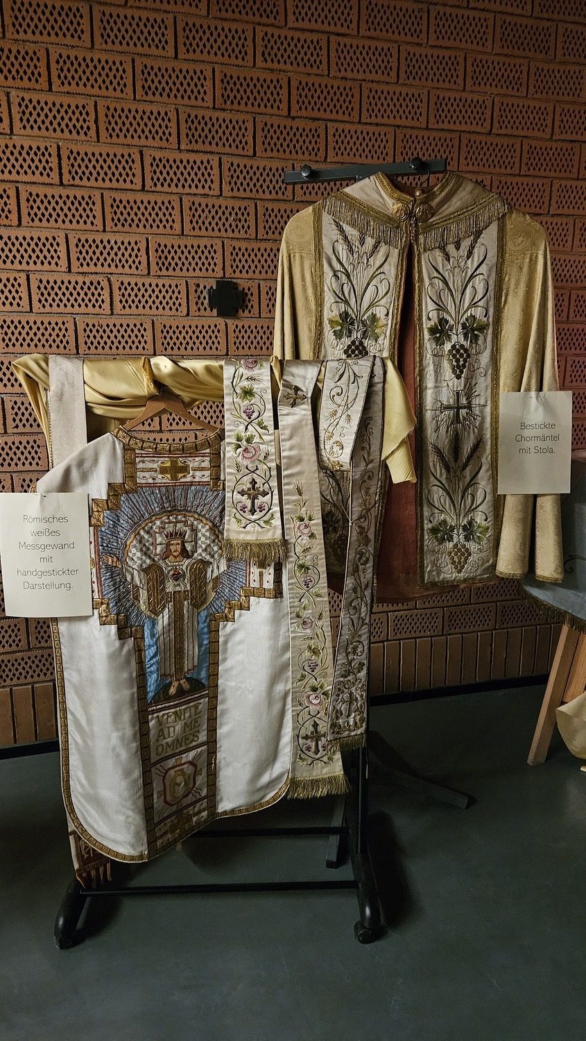 Die Besucher wurden über die Exponate mit beigefügten Texten informiert. So wurden auch unter anderem Kelche, Monstranzen, Kerzenleuchter und andere Gegenstände aus dem Fundus der alten Kirche von Bad Sauerbrunn gezeigt und auch sehr wertvolle Chormäntel und Messgewänder. Geordnet waren die Meßgewänder nach Liturgiefarben und mit beigefügten Texten, wurde die Bedeutung der Liturgiefarben erklärt.