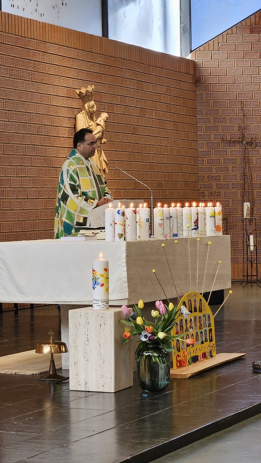 Das es eine besondere Messe werden sollte, merkte man schon am Einzug der Erstkommunionkinder mit Pater Kuruvila, Ministranten und der Frau Religionslehrerin durch das Hauptportal der Pfarrkirche. Man sah den Kindern die Freude förmlich an, mit der sie die Hl. Messe erwarteten.