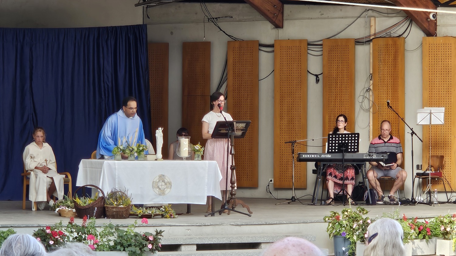 Das Patrozinium - Fest zu Ehren der Schutzpatronin der Pfarre , der Hl. Maria - feierte die Pfarre Bad Sauerbrunn am Festtag Mariä Himmelfahrt, dem 15. August 2025 mit einer Hl. Messe im Kurpark. Erstmals wurde diese Heilige Messe erst am Abend um 17 Uhr gefeiert. Pater Kuruvila zelebrierte die Hl. Messe und wies auf die besondere Bedeutung dieser Feier hin und betreffend das "Fest der Begegnung" auf die Wichtigkeit, in der Pfarre gemeinsam zu feiern. Die Hl. Messe unterstützten als Lektoren Pfarrgemeinderätin Kathi Graner und Pfarrgemeinderat Hermann Dittrich, als Ministranten Alexander Hanner und Johanna Lang. Die musikalische Unterstützung wurde durch Katja Visi-Kalmár und Sándor Kalmár wie immer ganz ausgezeichnet gestaltet. Viele Pfarrmitglieder und Gäste waren gekommen um gemeinsam die Hl. Messe zu feiern.
