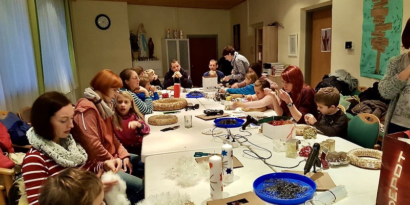 Pater Kuruvila bastelt gemeinsam mit Kindern und ihre Eltern einen Adventkranz.