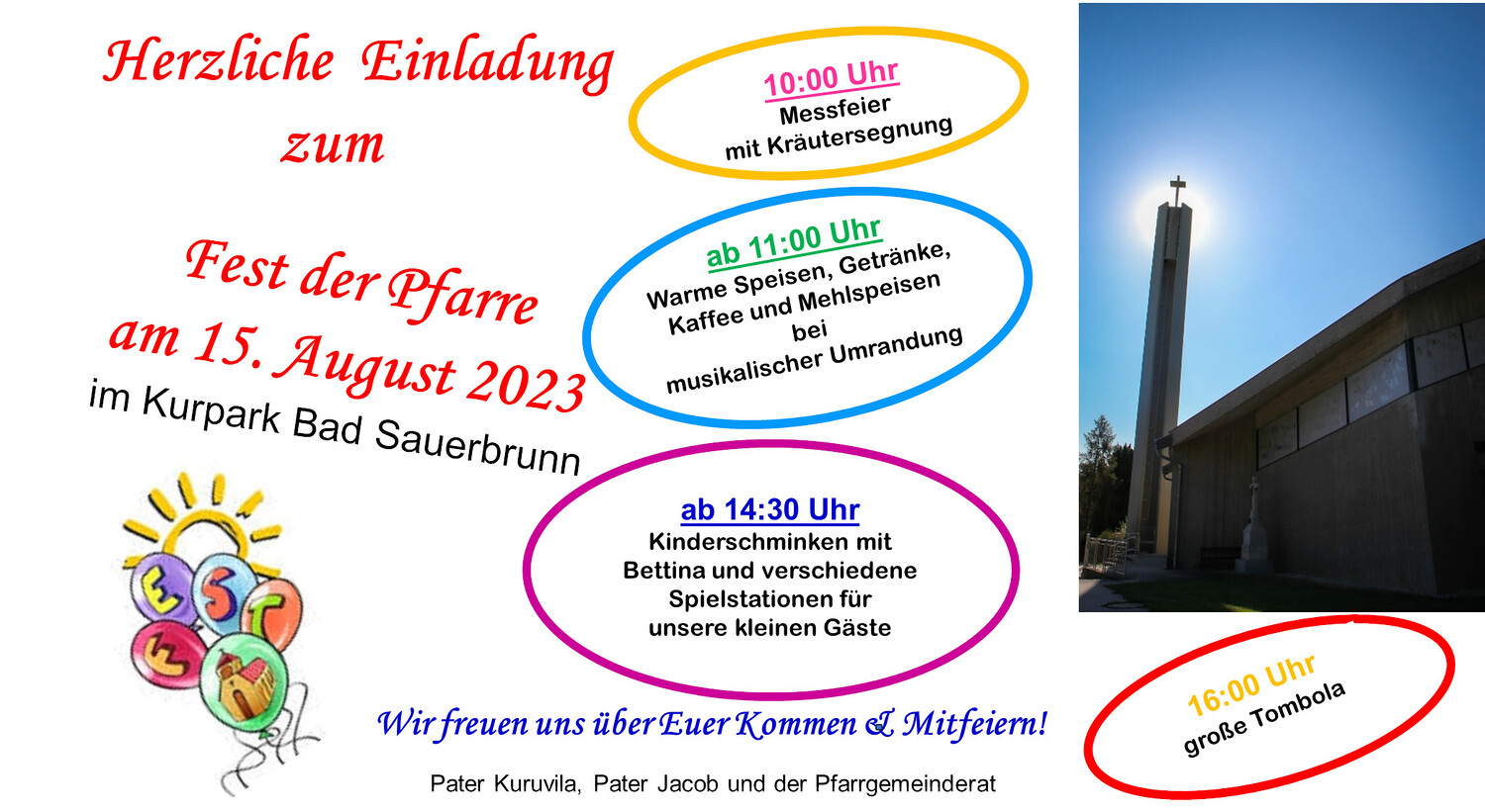 wir laden Sie herzlich zum Pfarrfest in Bad Sauerbrunn im Kurpark am 15. August 2023 ab 10 Uhr ein.