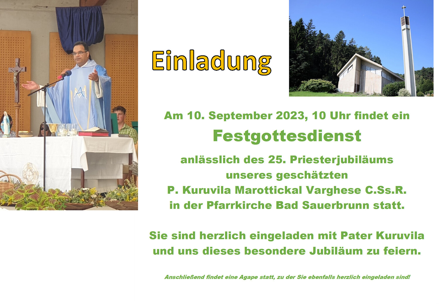 In der Pfarrkirche Bad Sauerbrunn findet aus diesem Anlass am 10. September, um 1000 Uhr ein Festgottesdienst statt. Dazu sind alle Gläubigen der Pfarre herzlich eingeladen.