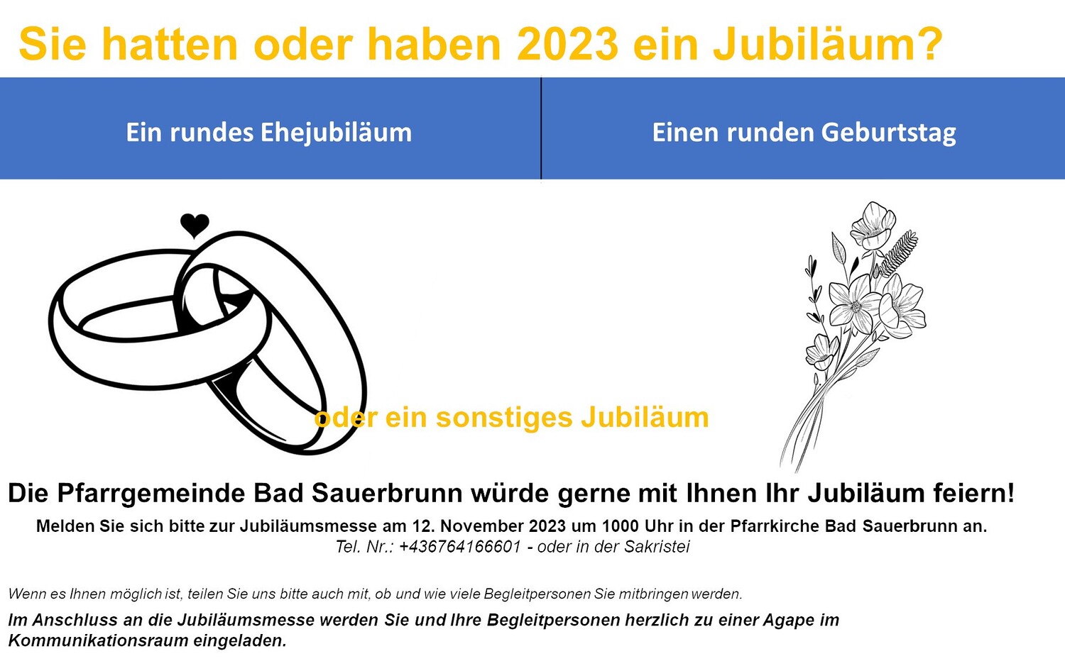 Die Jubiläumsmesse findet am 12. November 2023 um 1000 Uhr in der Pfarrkirche Bad Sauerbrunn statt. Unseren Jubilaren wird im Rahmen der Hl. Messe ein Einzelsegen gespendet.
