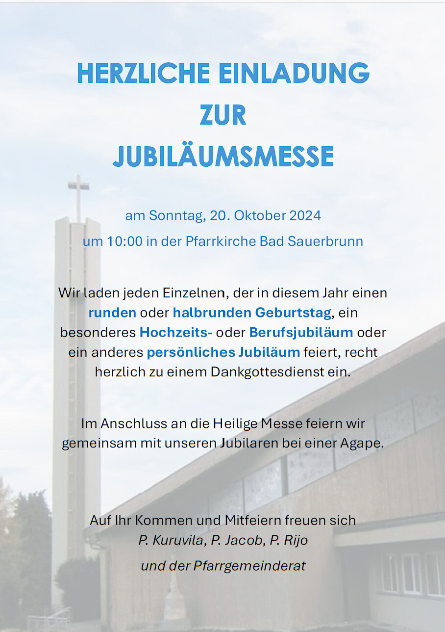 Alle, die in diesem Jahr einen runden oder halbrunden Geburtstag, ein besonderes Hochzeits- oder Berufsjubiläum oder ein anderes persönliches Jubiläum feiern, sind recht herzlich zu diesem Dankgottesdienst eingeladen.