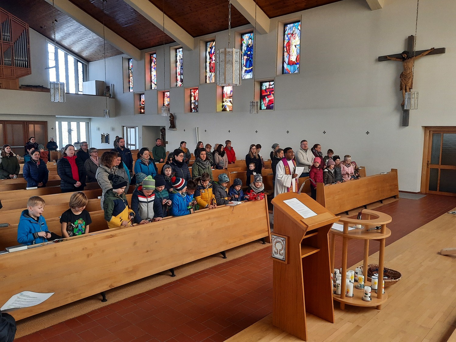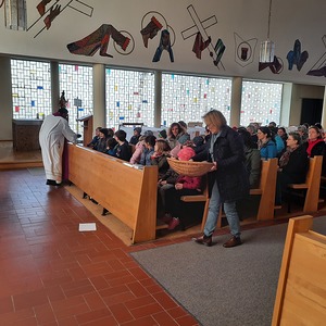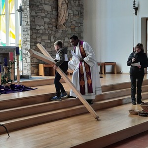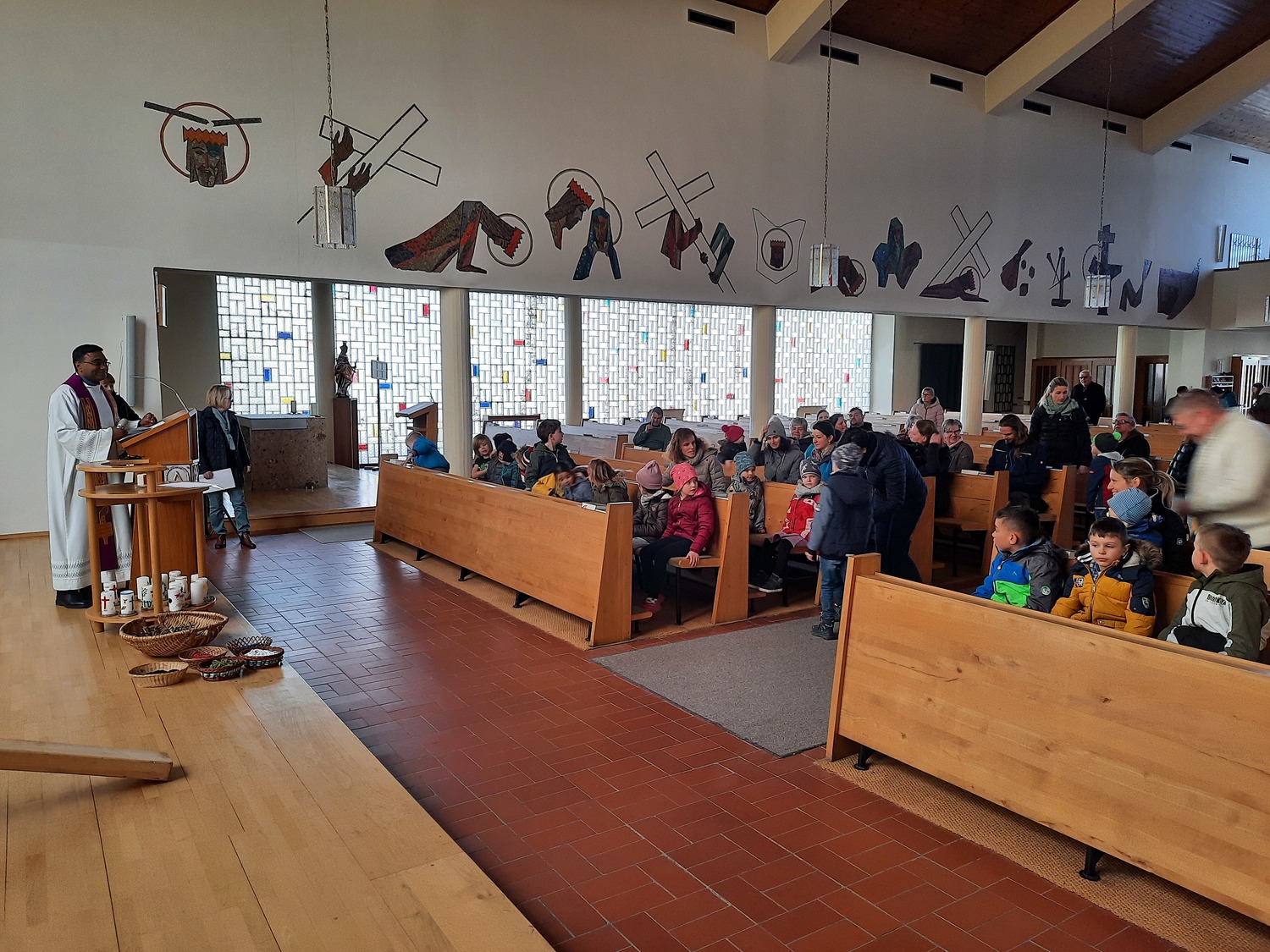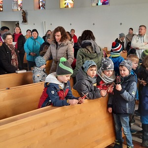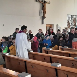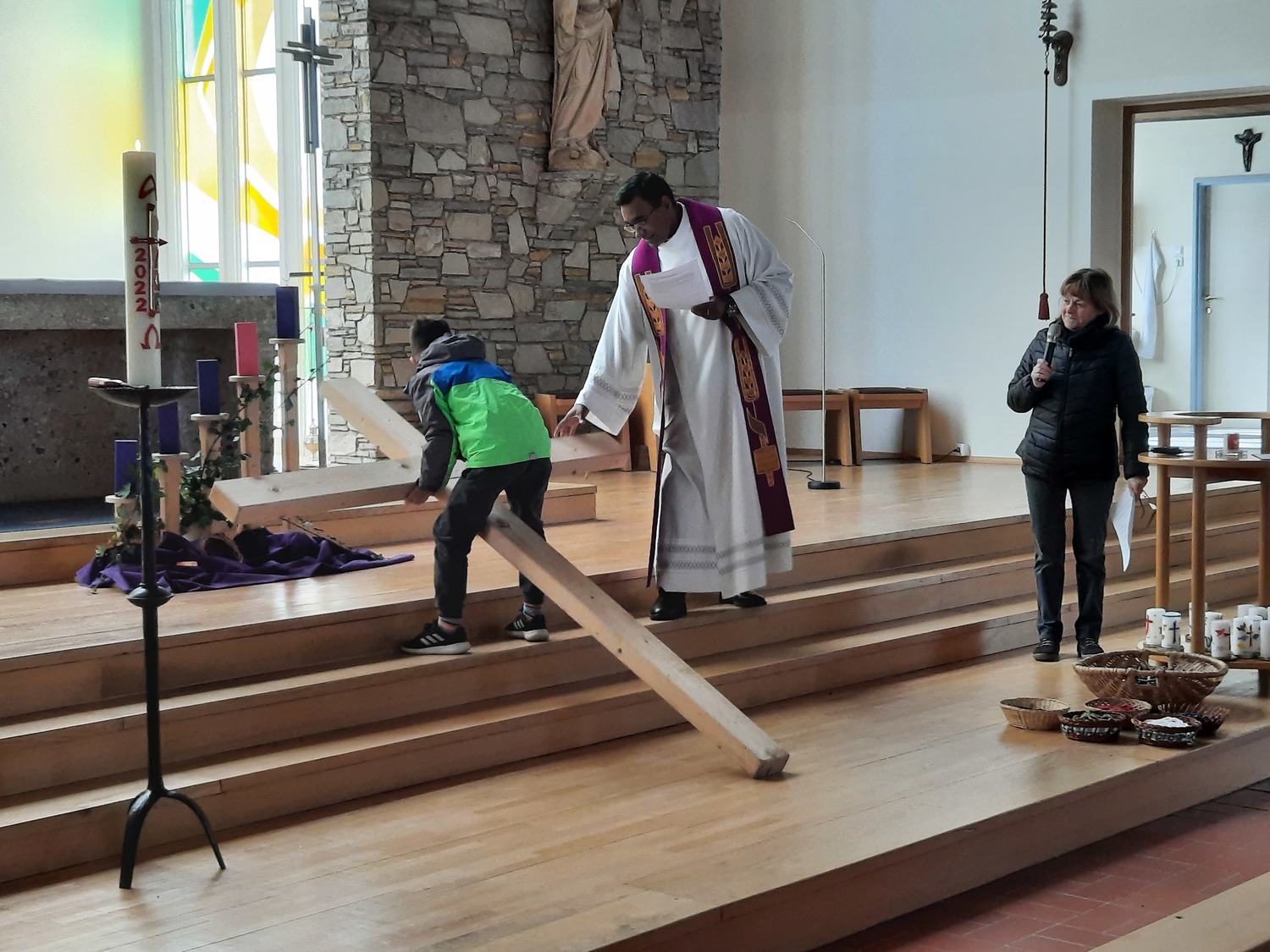 Bevor ausgewählte Stationen des Kreuzweges betrachtet und von Pfarrer Jomon erklärt wurden, durften einige Kinder versuchen ein großes Holzkreuz zu heben, um festzustellen wie schwer Jesus zu tragen hatte. Anschließend bekamen die Kinder einfache gebastelte Kreuze ausgeteilt, die dann bei den Stationen mit Bändern in den Farben Rot für Blut, Blau für die Tränen, Grün für die Hoffnung und Schwarz für den Tod von ihnen geschmückt wurden. Ein weißes Band durften die Kinder mit nach Hause nehmen um es zu Ostern, als Symbol der Auferstehung hinzuzufügen.