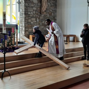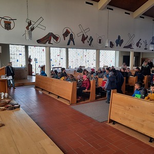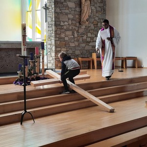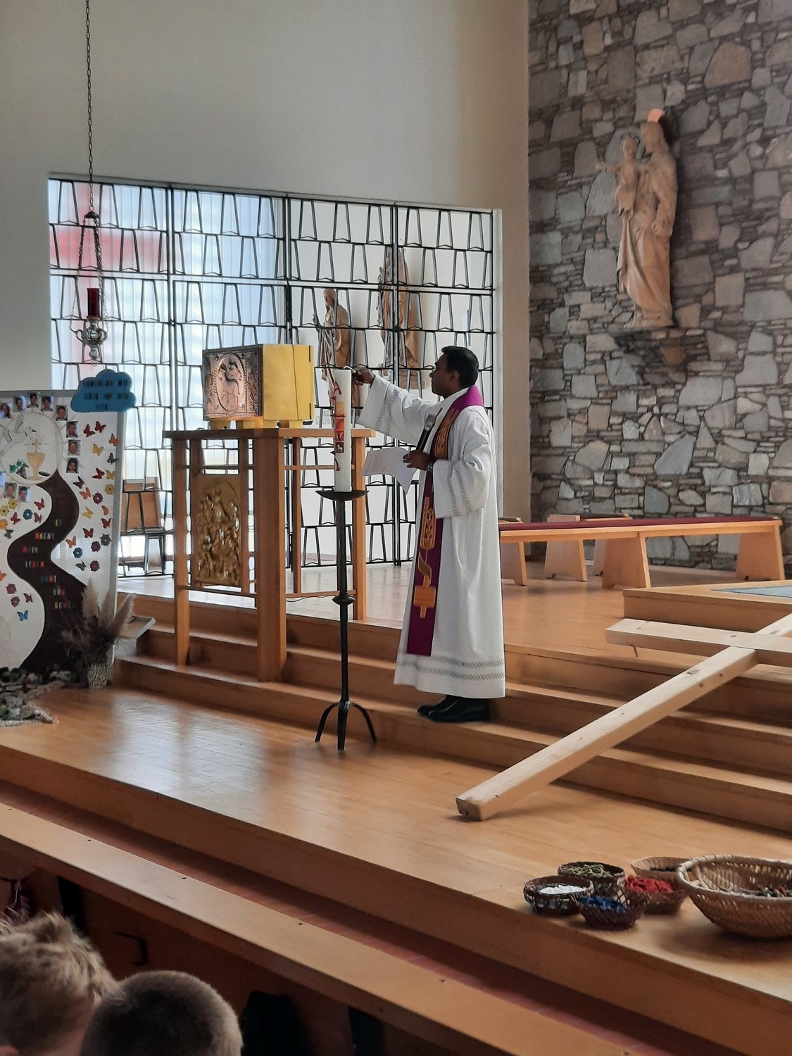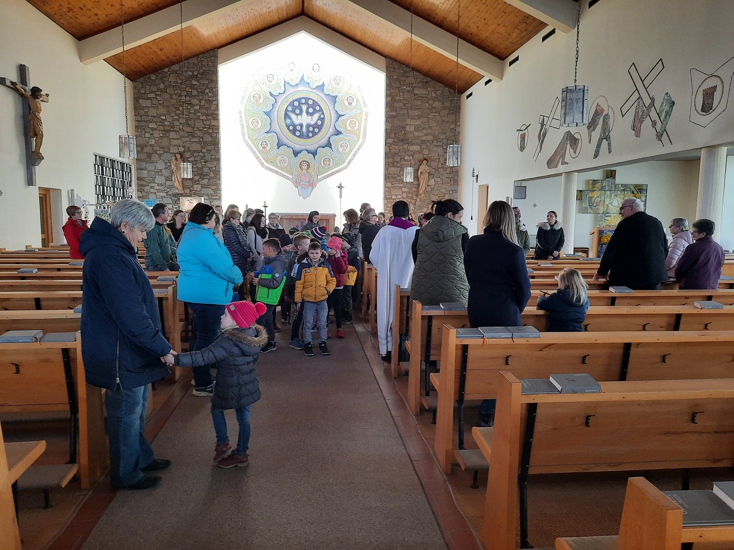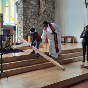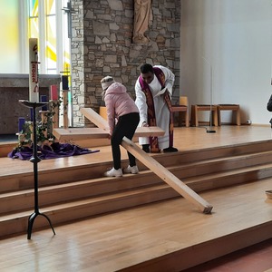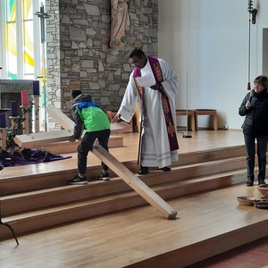 Bevor ausgewählte Stationen des Kreuzweges betrachtet und von Pfarrer Jomon erklärt wurden, durften einige Kinder versuchen ein großes Holzkreuz zu heben, um festzustellen wie schwer Jesus zu tragen hatte. Anschließend bekamen die Kinder einfache gebastelte Kreuze ausgeteilt, die dann bei den Stationen mit Bändern in den Farben Rot für Blut, Blau für die Tränen, Grün für die Hoffnung und Schwarz für den Tod von ihnen geschmückt wurden. Ein weißes Band durften die Kinder mit nach Hause nehmen um es zu Ostern, als Symbol der Auferstehung hinzuzufügen.